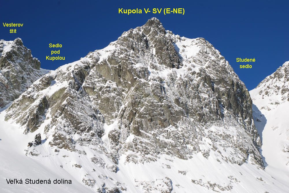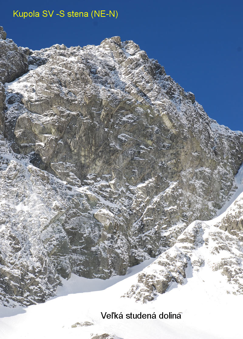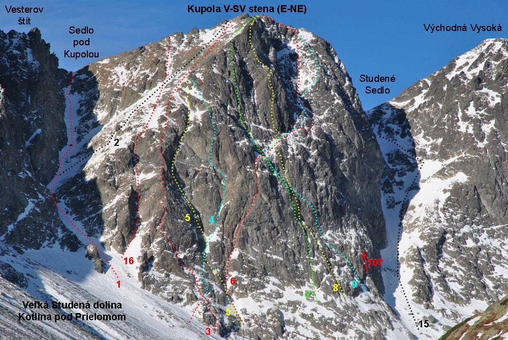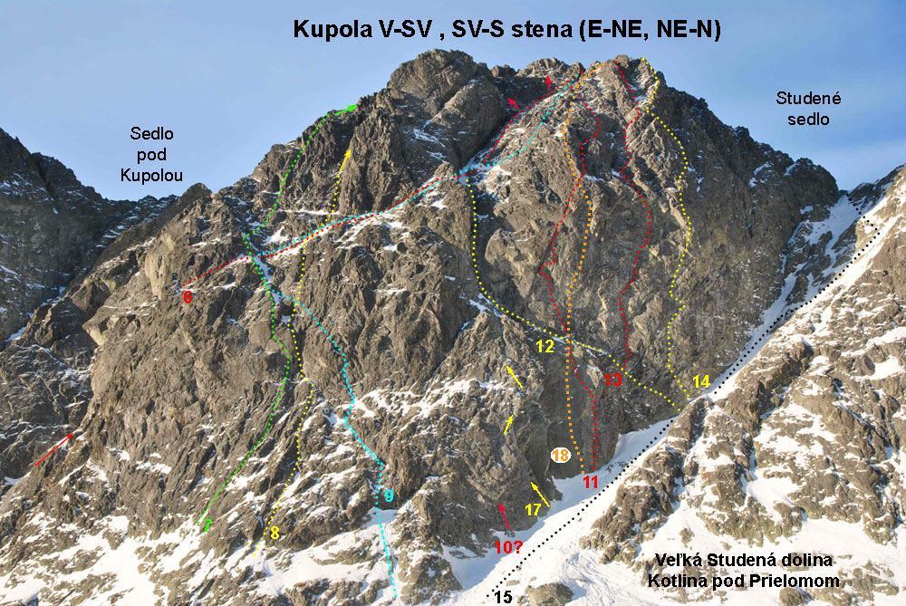 1. Sedlo pod Kupolou ( II ) 1,5 h. B. Baradlay, G.A.Hefty, 26. 10. 1911, AP IV/30 Žlabom, ktorý spadá zo sedla hore, vpravo okolo osamelej vežičky. 50 m pod sedlom zľava sú hladké platne, vpravo zrázne skaly - odbočíme doprava a ľahkým žľabom do sedla. V zime na snehu.2. JV rebrom (III) 45 min. G. Lingsch, G. Seide, 8. 9. 1927 v zostupe po prelezení cesty č.9 , AP IV/24 Zima: K. Bocek, Z. Ondrová vo výstupe 2. 4. 1958 Trávnato skalná pozvoľná stena smeruje k JV ku žlabu do cesty 1.a skoro pri jeho ústi spadá členitým skalami cez ktoré do doliny. 3. Ľavým rebrom (IV) 2h. R. Grzesik, C. Mrowiec, A. Skoczylas, 9. 8. 1956, FK1075 Rebro je zprava vrúbené hlbokou roklinou, kde vedie cesta č. 5. Nástup v mieste kde rebro zbieha do sute nevýraznou ostrohou.Ľahko hore až pod výšvih. Výšvihom šikmo doľava hore k výraznému komíniku. Ním doprava hore pod previs. Krátkym traverzom na pravé rebierko komíniku a po ňom na trávnatý stupeň. Z neho na ďalší trávnatý stupeň pod strmú stienku. Na lištu v stienke a po nej traverz doprava za jej hranu. Potom sklanými stupňami späť na ostrie rebra už nad stienkou. Ďalej po ostrí až sa stráca v nevýraznom rebre a na vrchol.4. Kojenecká (V) 6h. J. Lučenič, Š Sluka, L. Štoncer, O. Vincze, 7. 1. 1984 materiál 12 skôb, 8xhex. 1. opak. J. Krnáč, L. Balík, 8. 1. 1984 3. zima: P. Jackovič, J. Šebest 12. 2. 1995 5. Ľavým vhĺbením (IV-) 4h. J. Lučenič, J. Krnáč, R. Machovský, Č. Matěj, 11. 3. 1983 7 skôb, 2xhex 2. zima: J. Pavlák a druh, 13. 3. 1983 3. zima: B. Lebloch, I. Lepka, 20 .3. 1983 4. zima: E. Homola, J. Petrovič, 10. 3. 1984 5. zima: J. Lihocká, S. Glejdura, 8. 2. 1987 6. zima: M. a L. Klinovský 11. 1. 1988 7. zima: P. Jackovič, I. Verner 15. 1. 1991 Foto z prelezu a topo január 2020, T. Buchmajer, R. Popík: 6. Ľavou časťou - vhĺbením (V) 5-6h. J. Kacian, J. Sawicki, Š. Zamkovský, 31. 8. 1934 1. zima: J. Psotka, J. Sláma, 10. 4. 1958 2. zima: T. Hetinac, J. Horan, 10-11. 3. 1961 AP IV/26 Nástup smerom do rokliny kde vedie cesta 4. Spočiatku sutinovým žľabom po bielych vodou vymytých platniach k malému komíniku. Ním hore. Ďalej po plošinkách a žliabkami doprava na trávnatú lávku pod previsy. Po lávke asi 50m šikmo doprava na pravú hranu steny. Zárezom 25m hore. Traverz doprava cez hladkú platňu. V mieste kde je spomínaný zárez previsnutý do kotla pod čieny mokrý komín. Sutinovým pásom zľava od komína ku previsnutej trhline. Tu doľava a cez dva previsy hore do trojhranného výklenku s balvanom. Odtiaľ mierne doľava k 5m kolmej stienke. Cez ňu trhlinou a ďalej ľahšie vľavo na rebrovitý výčnelok. Odtiaľ kolmou stenou (IV), prechod niekoľko metrov doprava na skalnú plošinu. Cez hranu doľava na hladkú platňu a ňou 8m hore (IV exponované) až k previsnutej stene. Tu asi 10m doľava na trávnatú lávku v polovici steny. Lávkou doprava popod čiernu vežu a cez skalnú bránu do žlabu, 60m žlabom hore, doprava na chrbát a dole do rokliny. Roklinou 150m hore na vrchol . 7. Janin pupenec (V+) 4h. J. Faktor, P. Bednařík, 12. 8. 19738. Stredom steny v hornej časti cez Ciernu vežu (V-VI) 5-6h. I. Bajo, A. Hanzel, B. Hanzel, 1. 9. 1956, AP IV/27 Cesta vedie v dolnej časti výrazným čierným komínom v spádnici vrcholu k päte najväčšej ostrohy vybiehajúcej zo steny. Nástup na trávniku na pravej strane ostrohy. Z trávnika naľavo, výrazným žliabkom ku nápadnému komínu. Komín je zprava previsnutý a vlhký. ľavou stranou komína hore jednu dĺžku do skalného hniezda. Odtiaľ kúsok vpravo a priamo v spádnici lámavou stenou as 60m na trávnatú lávku pod Čiernou vežou kde križujeme výstup č. 6. pod pilier čiernej veže. Z lávky ľavou stranou ľavej hrany veže priamo hore 40m potom traverz na pravú hranu piliera na mohutný balvan. Odtiaľ na hrot hrany. Z hrotu priamo hore po hrebeni k výraznej špáre (prvá výrazná špára od ľavej hrany), idúcej zľava doprava k vrcholu. ďalej ľavou hranou na vrchol. 9. Pravou časťou - vhĺbením (IV od hornej lávky II-III) 2h. G. Lingsch, G. Seide, 8. 9. 1927 AP IV/25 Výstup vedie v dolnej časti výrazným vhĺbením tiahnúcim sa zprava doľava. Nástup je v pravej časti V-SV steny na trávniku. Priamo hore a potom šikmo doprava trávnými lávkami na spodný koniec rímsy, kde začína spomínané vhĺbenie. Po rímse doľava potom 15m hore komínom ktorý je v prostriedku previsnutý (v zime môže byť klasifikácia vyššia). Z jeho hornej časti doľava (mimo sutinovú jaskynku) do väčšieho vhĺbenia. 15 m hore z pravej strany vhĺbenia, potom doľava cez sklonenú platňu do ďalšieho vhĺbenia. Z neho na ľavé rebro (križujeme Bajovu cestu ) a po ňom až ku lávke kde vedie Zamkovského cesta. Kúsok spoločne - v hornej časti, kde pokračuje hlavná roklina buď ňou, alebo skalami vpravo od nej ako prvovýstup na vrchol. 10. Čierny pilier (IV) E. Bobačičová, V. Tatarka, 5. 7. 1975 Nápadným čierným pilierom vľavo od Poľského komína. Bližšie podrobnosti nie sú známe.11. Orolin - Belica (OS 7+, pôvodne V+, A2) 9-12h. M. Belica, M. Orolin, 5. 10. 1973 27 skôb, 3x hex, 12 h. 2. leto: Z. Drlík, P. Mačák, 19. 8. 1976, 6 hod. 3. leto: L. Králiček, J. Milo, 29. 8. 1976 4. leto: J. Gazík, M. Krajč, 1. 5. 1979 1. zima: P. Jackovič, M. Pšenek, 17.-18. 3. 1986 1. OS: D. Kuráň, J. Santus, jún 2003, klasifikácia 7+12. Pravou časťou - komínom (V) 3h. H. Debinski, A. Gasiorowski, J. Strzyczynski, 25. 8. 1960 AP, IV/28 Smer výstupu udáva hlboký komín, ktorý je vľavo od nápadnej sivej tektonickej platne. V jeho pokračovaní vyššie je ďalší hlboký komín . Vľavo od komínov je nápadný čierny pilier, ktorým vedie cesta 10. Nástup je v žlabe vedúcom do Studeného sedla. Kútikom, v ktorého pokračovaní je nápadná lávka vedúca k hornému komínu. Na plošinku pod ho