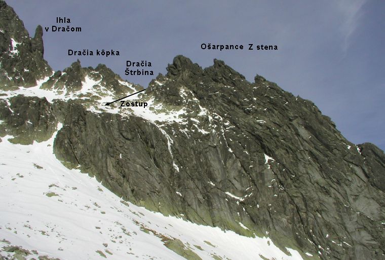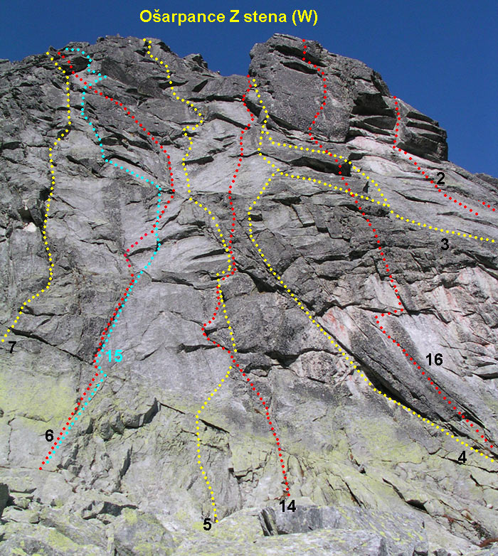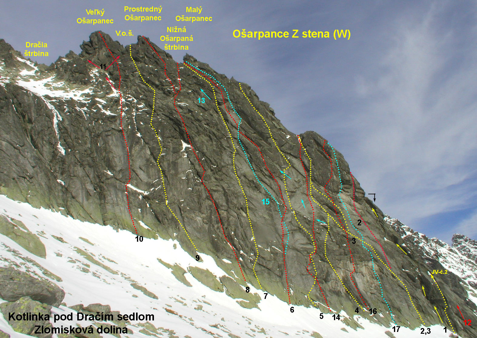 1. Komín Komarnického-JV hrebeň (III), R1, 2,5h. F.Kienast, R.Komarnicki, V.Wanjura 8.8.1910 V komíne sú osadené zlaňovacie kruhy a borháky viď zostup. Nástup v spádnici výrazneho úzkeho JZ komína napravo od hladkých platní v Z stene Malého Ošarpanca. Komínom hore pod vklinený balvan, ktorý prekonávame sprava na plošinu nad ním (ST). Šikmo doprava hore do výrazneho žliabku a ním 20 m hore pod previsy. cez platňu doľava pod úpätie hornej časti komína, ním priamo hore na trávnatú plošinu v JV hrebeni (ST). Komín slúži taktiež ako zostupová cesta pre JV stenu. Pokračovanie JV hrebeňom: Nad plošinou v hrebeni je veľká položená platňa. Po plošine traverz 10m doprava potom šikmo vľavo hore trhlinou v platni. Trhlinou až na hranu hrebeňa. Ostrím hrebeňa Na Malý Ošarpanec. Po stupňoch dole k SZ, krátke 6m zlanenie do Nižnej Ošarpanej Štrbiny. Odtiať opäť hrebeňom cez Vyšnú Ošarpanú štrbinu na Veľký Ošarpanec. Z vrchola Veľkého Ošarpanca zlanenie cca 18 m do Dračej štrbiny. Odtiaľ možno pokračovať hrebeňom cez Dračí štít na Vysokú,Ťažký štít až do sedla Váha (III - Koruna Vysokej, 5h), alebo zostúpiť suťovým žlabom (CH) pod západnú stenu Ošarpancov. 2. Strecha VII+, RS 2-3, 5h.V. Tatarka, J. Jurečka 15.6.19861RP: I. Papp ???, cesta je známa neštandardným lezením strechy v 3. dĺžky, náročné 7+. Preistenie: Rado Staruch a Peter Köteleš, 2017 V ceste doplnili 3x štand a vymenili 2x postupový nit v 3. dĺžke. V ceste spravili variant priamo v 2. dĺžke špárkou a rajbasom za 7, kde je 5x nit. 3. Kývala - Zeitler (V+/A3, RP:7), R2, 5h. J.Kývala, J.Zeitler 9.6.1968 1.RP? Logický variant obídenia najťažšieho miesta(A3,RP7) krásnou platňou zprava (celá dĺžka VI- až na stanovište 3, v pôvodnej ceste). Popísali 28.6.1987 I.Jakubcová, V.Jakubec. V tomto prípade celá cesta VI+. Možno lezené i dávnejšie. 4. Narovnanie Kývalu (V-VI), R3, 4h. L.Janiga, M.Kriššák 5.9.1968 Napriamujúci variant vo výstupe Kývala - Zeitler. Nástup je v spádnici štrbiny, z pravej strany čierna veža, dolu s veľkými prevismi, už na juhovýchodnom hrebeni, nad Komarnického cestou. Priamo z dna doliny vybielenými platňami pod prevismi do zárezu. Ďalej zárezom asi osem metrov až do ďalších platní. Cez platne a šikmo doprava na dobré stanovište. Tu križuje škáru, ktorá prichádza sprava doľava z dna doliny a po ktorej ide pôvodná cesta Kývala - Zeitler. Ďalej po pôvodnej ceste na juhovýchodný hrebeň. 5. Cesta Invalidov (V+/A2 RP:8-), R3-4, 4-5h. V.Tatarka, L.Janiga, J.Michalko 6.9.1982 1.RP:I.Pap, Ľ.Stančík, 29.6.19886. Čupel-Rybička-Šmíd (VI/A1,Rp:7) 6h. J.Čupel, J.Rybička, J.Šmíd, 3.11.1973 Info: 10 skôb, jednička. Informácia od Paľa Staníka: Posielam klasifikáciu voľného prelezu cesty Rybička , Šmíd na Ošarpancoch. Prvá dĺžka 7, Druhá 7, tretia 6+, lezené s šesdesiatkou lanom. Môj názor, najhodnotnejšia cesta na Ošarpancoch. V prípade, že si lezenia bez skôb treba riadne zakladať a niekde to ani nejde. Prvá dĺžka za 7 preto, lebo sa v nej pravdepodobne odtrhla lišta, cestu som liezol dva krát a prvý raz táto dĺžka bola v pohode. Lezené s Mirom Ištokovičom v 1991.7. Kortán - Prokeš (III-V), R2, 3h.V.Kortán, V.Prokeš 10.10.1969Prostriedkom steny. - Nástup je v spádnici Malého Ošarpanca. Cez biele platne prechádzame šikmú puklinu, pretiahnutú v dolnej časti steny. Nad ňou hore a ďalej cez previs zárezom na vyčnievajúce stupne, stanovište. Odtiaľ pár metrov hore, potom doprava pod polokrúhly previs, na ľavý okraj. Škárou cez previs rovno hore; po ľavej strane veľká platňa. Pred nami je veľký vypuklý previs, pod ktorým je veľká biela platňa. Previs zdolávame zľava, nad previsom traverz doprava a ďalej rovno na šikmú poličku, stanovište. Odtiaľ vhĺbením celú dĺžku lana, potom po ľavej strane kúta mierne doľava a komínom na vežičku. Poznámka od lezcov 2025: Cesta Kortán Prokeš. v druhej dĺžke je vypadnutý blok, čím sa výstup skomplikoval a obtiažnosť je vyššia ako V. Pozri foto pod popisom.8. Gálfy - Weincziller (V), R3, 2,5h. I.Gálfy, J.Weincziller, 1.11.1957 Výstup vedie viac-menej v spádnici, medzi Malým a Prostredným Ošarpancom. Nástup je v spádnici štrbiny ; napravo hore je nápadný biely výlom, už v stene Malého Ošarpanca, tam, kde sutina záhybom vbieha do belavých platní v spádnici štrbiny. Z kúta zárezom hore. Zárez pretína z dna doliny sprava doľava bežiaca škára, cez ňu kúsok vľavo, až do spádnice tmavšieho, výrazného ďalšieho kúta, už nad škárou. Kútom veľmi tažko hore v smere štrbiny; vľavo veľkě tmavé vhľbenie a po jeho pravej strane, už ľahšie ďalej, priamo hore v spádnici. Vystúpime na Nižnú Ošarpanú štrbinu, medzi Malý a Prostredný Ošarpanec.9. Motykova cesta (V), R2, 2,5h. S.Motyka, J.Sawicki, 26.7.1931 Vstup do steny je v spádnici Prostredného Ošarpanca, cez platne do zárezu, ktorý má v pravej strane výrazný hnedý pruh. Ním hore, až kým je celkom hladký. Tu po stienke a rebre vľavo na naklonenú plošinu. Ďalej doprava hore do komínika. Cez vklinený balvan, veľmi ťažko, až k previsu, ktorý uzatvára komín. Presunieme sa na strmú platňu vpravo a potom priamo hore cez tri malé previsy, hore pod obrovský, zo steny vyčnievajúci balvan. Pod balvanom po platniach doľava, potom zase doprava, do trávnatého komínika. Komínikom kúsok hore, potom doprava na rímsu. Nakoniec previsnutou stienkou na veľkú plošinu a cez ďalšiu stienku do Vyšnej Ošarpanej štrbiny. Z nej doprava na vrchol Prostredného Ošarpanca.10. Puškášova cesta (V-IV), R2, 2h. G.Kortvélyessy, A.Puškáš, K.Roszay, 5.7.1950 Priamo stenou. - Asi 25 metrov vľavo od Motykovej cesty sa tiahne šikmo nápadná veľká platňa, ktorá udáva smer výstupu. Po dob