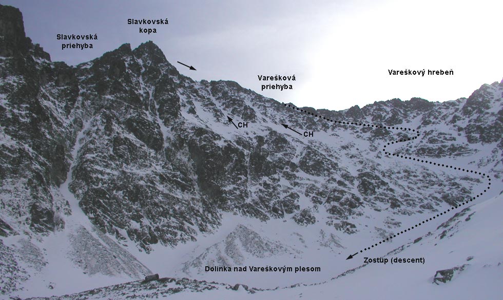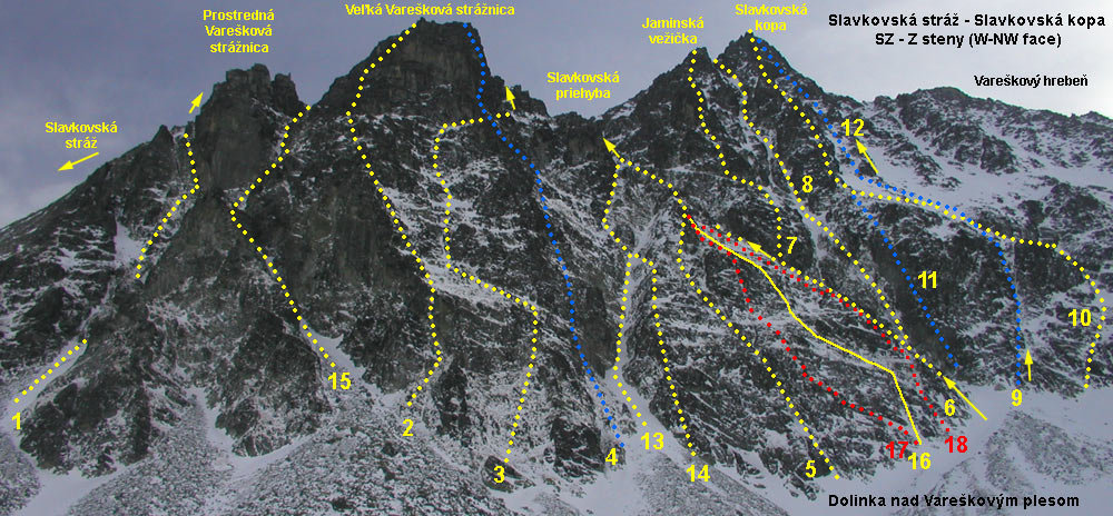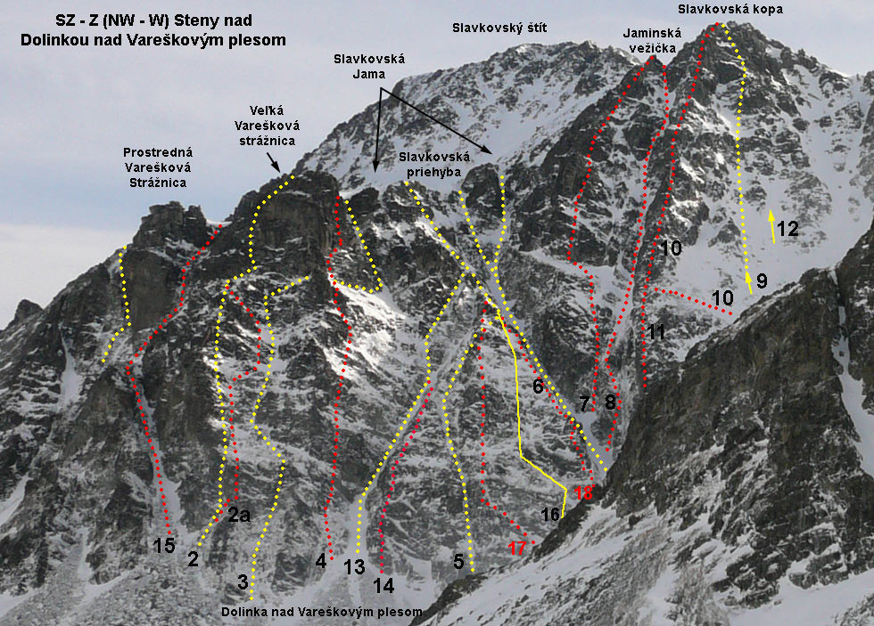 1. Modré oči (IV) 2 h. - Prostredná Varešková strážnica M. Chovanec, A. Urík, 18.2.1975 2. Veľká Varešková strážnica - Ľavý pilier (III-IV) 3 h. E. Vališová, V. Tatarka, 29.12.1974 2a. Variant ľavého piliera - stenou (V) 6h. T. Klinka a A. Kadlečík 7.3.20093. Puškášová cesta (mix-III) 2 h. - Veľká Varešková strážnica A. Puškáš, L. Szabó, 30.4.1958 Popis: Zimná mixová cesta trávami a snehom. Nástup je v spádnici vrcholu, postupujeme trávnatými žliabkami cez snehové police až na policu pod vrcholovú stenu. Lávkou pod štítovou stenou doprava za roh do šikmého snehového žliabku smerujúceho doľava, ním až na plató a z neho na vrchol. 4. Veľká Varešková strážnica - Pravým Pilierom a stenou (IV+,A0) 7 h. L. Králiček, M. Milo, 15.3.1977 5. Slavkovská priehyba - Komín (mix-IV,1 miesto V) 3 h. M. Bobovčák, I. Franková, 24.2.2008 Zimná mixová cesta. Nástup je vo výraznom komíne v prostriedku trojuholníkovej steny pod Slavkovskou priehybou. Komínom 60 m IV, 1 miesto V, (veľmi zlé možnosti istenia) na ľahší terén, žliabkom v pokračovaní komína a trávnato-skalnými žliabkami s odchýlením doprava na vrchol trojuholníkovej steny. Ostrým hrebienkom a v jeho predĺžení na priehybu. 6. Žlab (II) 1 h. Z. a S. Klemensiewicz, A. Lomnicki, Z. a V. Smoluchowski, W. Szczepanowska., 24.8.1921 Žlab Spadá zo Slavkovskej priehyby popod stenu Jaminskej vežičky a Slavkovskej kopy až do Dolinky nad Vareškovým plesom. V hornej časti sa rozvetvuje. Ľavou alebo pravou vetvou hore na priehybu. V zime väčšinou na čistom snehu, v pravej vetve je obvykle menej skál. Žľab je vhodný aj na zostup do dolinky. 7. Jaminská vežička (IV+) 2 h. L. Benešová, F. Piaček, V. Tatarka, 24.2.1974 8. Zamkovského komín (II-III) 2 h. N. Füzy, Š. Zamkovský, august 1932. Zima: A. Puškáš, H. Rácz, 5.1.1951. s variantom priamo pilierom na vrchol. Komínom v stene Slavkovskej kopy, pri ústi žlabu do Slavkovskej priehyby. Komín miestami prechádza v žlab a ústí vľavo od vrcholu za Jaminskou vežičkou. Ideálny zimný výstup.9. Keleho cesta (IV) 1 h. F. Kele ml.,21.7.1952 Žlabom v spádnici vrcholu Slavkovskej kopy na veľkú sutinovú terasu, ktorá je vpravo od SZ rebra. Žliabkom vpravo od rebra až pod 30m prah. Ním do malého kotla pod vrcholovou stenou. Po platniach do úzkeho komína a ním na vežu pre vrcholom. Doprava na vrchol. Dolná časť pod terasou a vrcholová stena - IV.10. Slavkovská kopa - SZ rebro (III) 2 h. F. Kele ml., J. Kováčik, 14.8.1952 Pravou dolnou časťou steny, najkrajnejším žlabom od dolinky ľahko na sutinovú terasu pod rebrom. Sutinoviskom pod samotné rebro už nad stenou, ktorá sa z terasy láme do doliny. Rebrom hore, markantnú vežičku obchádzame zprava. Skalný schod v rebre prekonávame žliabkom, ktorý ho pretína. Ďalej priamo po rebre na vrchol. 11. Slavkovská kopa - Dolný variant SZ rebra (V) K. Pavlík, J. Šuna, 6.5.1956 SZ rebro spadá do doliny kolmou hranou. Cez ňu priamo hore až na sutinovú terasu, ktorá pretína rebro. Tu sa napája cesta č. 10. - ňou na vrchol.12. Ždiarskeho cesta (IV) 3 h. F. Ždiarsky, O. Chudý, 10.9.1959. Nástup podobne ako Keleho cesta, prvým bielym vodným žlabom vpravo od cesty č.11. Cesta sa pravdepodobne kryje s malými odlišnosťami z Keleho cestou (č.9) 13. Slavkovská priehyba - Ľavý žľab (hore III-IV) 1,5 h. Žľab je pravdepodobne chodený už dávno. - pekná zimná cesta. Žľabom na čistom snehu až pod skalnú bariéru s dvomi žliabkami. Pravým žliabkom III miesto IV a pomedzi vežičky na Slavkovskú priehybu. 14. Ľavý žlab - variant (V) 2,5 h. M. Kuniak, R. Svitek, január 2009. 15. Havraní vlasy (M4 s priamym variantom M5-) 2-3 h. P. Lazar, J. Švihálek, 31.12. 2009. Cesta vedie žľabom a vhĺbením do sedielka medzi Prostrednú a Veľkú Vareškovú strážnicu. 15a Vrcholový variant M3+ (III-IV) D. Hudák, Š. Krasňan, 21.1.2010 Po výstupe úvodným žľabom sa lezie priamo kútom do sedla medzi strážnicami, variant naopak pokračuje výrazným zárezom na pravo logickou líniou priamo a na vrchol Veľkej Vareškovej strážnice, v dobrých podmienkach je to oveľa viac zaujímavejšieho lezenia ako pokračovať Havraními vlasmi. 15b Narovnávajúci variant M5- M. Varga, P. Cipka, 4. 3. 2012 V pôvodnej dĺžke cesty, ktorá ide kútom a pokračuje platňami sprava, neodbočíme do platní, ale lezieme priamo kútom (M5-). 16. Stredom trojuholníka (III) 2h. M. Zemko, R. Karel, 5.1. 2011 Cesta vedie stredom trojuholníkovou stenou v spádnici Slavkovskej priehyby. Vhodné na popoludnie. Možno lezené už skôr.