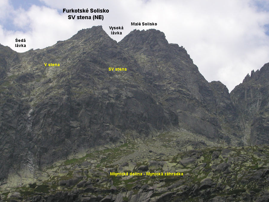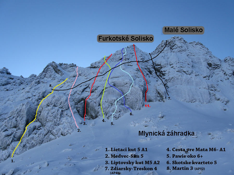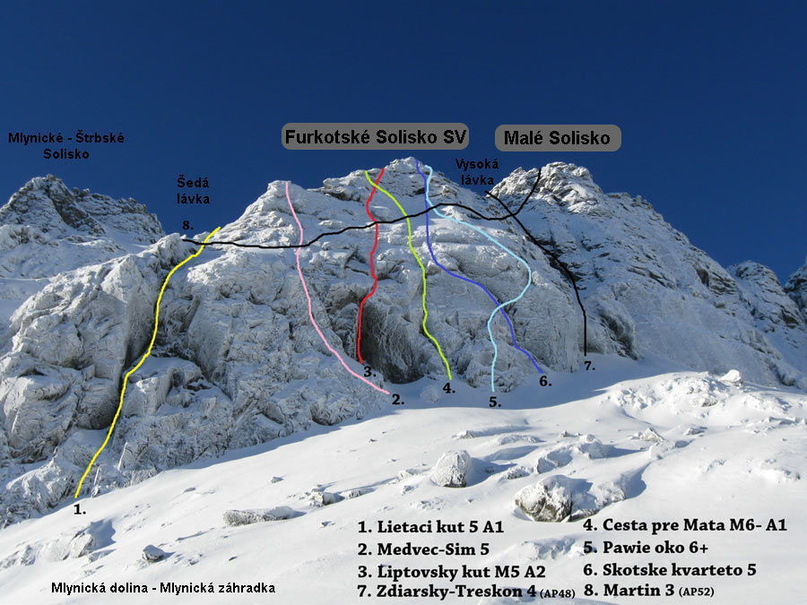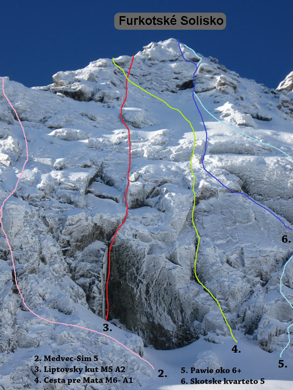 1. Lietací kút (M6, pôvodne V+, A1) 4h. Miro Sim, Ivan Staroň, 31. 12. 2011 1. OS: M. Červienka, O. Húserka, 20. 12. 2012, navrhovaná klasifikácia M6. Klasifikácia podľa nás: 1.dl (M6) OS; 2.dl (M5) OS. V ceste sme nepoužili skoby, iba ballnuty a friendy od mikráčov po veľký modrý camalot (BD). Info z prelezu 4.12.2014: Dnes sme so Stanom Filkorom vyliezli cestu Lietací kút na Furkotské Solisko,štýlom OS - team. Napriek len 2 dlžkam cesta pekná, dojem ale kazia momentálne takmer tragické podmienky - cesta úplne bez ľadu, ale zato s množstvom sypkého nedržiaceho snehu. Prvá dĺžka bude hodne ťažkých M6, navrhol by som to v sprievodcovi opraviť aspon na M6+ nech majú ludia trochu rešpekt, druhá dĺžka može byť tých navrhnutých M5. Ale pozor, v ceste nie su ponechané ziadne istenia - ani na štandoch, info od Húserku-Červienku ,že bez skôb môže spôsobiť dalším dvojkám vážne problémy. Nožové skoby na vytvorenie štandu po prvej dĺžke silne odporúčam. Peter (Helmut) Koteles. 2. Medvec – Sim (V) Miro Sim, Miro Medvec, 14. 2. 20103. Liptovský kút (M7+, pôvodne M5, A2) 4,5h. Jan Kořínek, Ivan Staroň, 26. 12. 2011 1. free prelez AF: A. Zvara, L. Gubáni, 24.11.2012, 6 hod. klas. M7+ (AF). Opis free A. Zvara: Prvá dĺžka pôvodne A2, mne sa podarilo M7+ AF, na PP/RP už nebol čas, - kľúčová pasáž - dlhý krok z dobrej špárky do tenkej zlej, bez dobrých nôh, - zvyšok dĺžky sa ide na vytrvalosť po dobrej špáre. Druhá dĺžka pôvodne M4 A1, voľne nám to šlo tak M5- OS. 1. free prelez PP: Vlado German, Michal Trembáč, 21.1.2017, 6h Opis prelezu: 1.dĺžka M7+ PP - boulder nad prvým istením po páde na druhý pokus, zvyšok dĺžky OS, 2.-4. dĺžka OS Je to skutočne pekná cesta, ktorá preverí telo aj hlavu. Prvá dĺžka ide veľmi estetickým tatranským kútom, výzva na prvý pohľad. Úvodný boulder je viac o štastí ako o rozume, mne to vyšlo voľne až na druhý pokus po predchádzajúcom lete do prvého istenia. Ani ďalej v kúte nie je lezenie zadarmo a zábava graduje v posledných metroch pod štandom.4. Cesta pre Maťa (M6-, A1) 6h. Miro Sim, Michal Volf , 23. 12. 20075. Pawie oko (VI+) 4h. A.a M. Probonis, 11. 8. 2011 6. Škótske kvarteto (V) 3,5h. Miro Sim, Miro Medvec, Ivan Staroň, Michal Volf, 26.12. 20107. Vysoká lávka žľabom (IV) 2h. F. Ždiarsky, I. Treskoň, 19. 10. 1965 AP IX/48. Spočiatku roklinou až po hlboký previsnutý komín, ktporý obídeme kolmou stienkou zľava (IV) až na lávku v polovici steny. Lávkou doprava až kým sa stráca v stene. Stenou hore do ľahších partií nad previsnutým komínom. Doľava do žlabu a ním ľahko do sedla.8. Martinova cesta priečne stenou (II-III) 2h. A. Martin, 18. 9. 1907 APIX/52 V skutočnosti je to prechod položenou sutinovou stenou Furkotského Soliska na Malé Solisko. Nástup v žlabe pod Šedou lávkou medzi skalnými stenami, vyššie sa žľab otvára, odbočíme doprava do východnej trávnato-suťovej steny štítu, pokračujeme šikmo hore, prekročíme rebro štítu a zostúpime do Žlabu cesty č. 7. Ďalej pokračujeme hore stienkami Malého Soliska na vrchol. Úsek na Malé Solisko II-III, ostatné CH-I. 9. Deň vetra (M6-) 4h. J. Svrček, M. Styk, 1. 12. 201310. Posledné predsavzatie (M6) 4,5 h. J. Svrček 4. 1. 2014 kľúčové dĺžky, istené sólo. 11.Cesta ku slobode (M6) 5h. Tomáš Cuták a Tomáš Kotrady, 18.1.2016 M6 jeden úsek,inak úseky M2-M3
