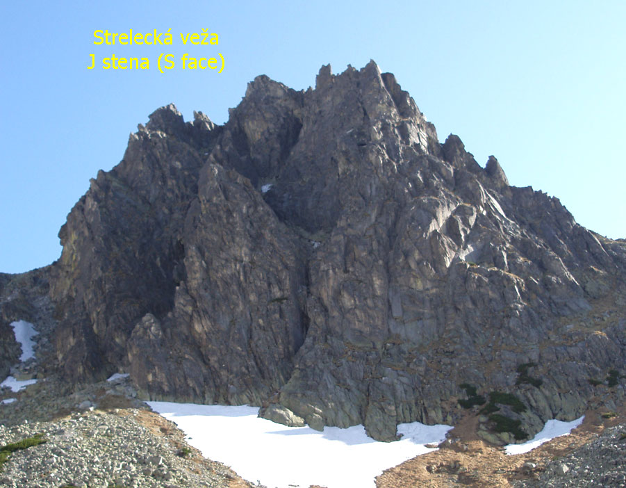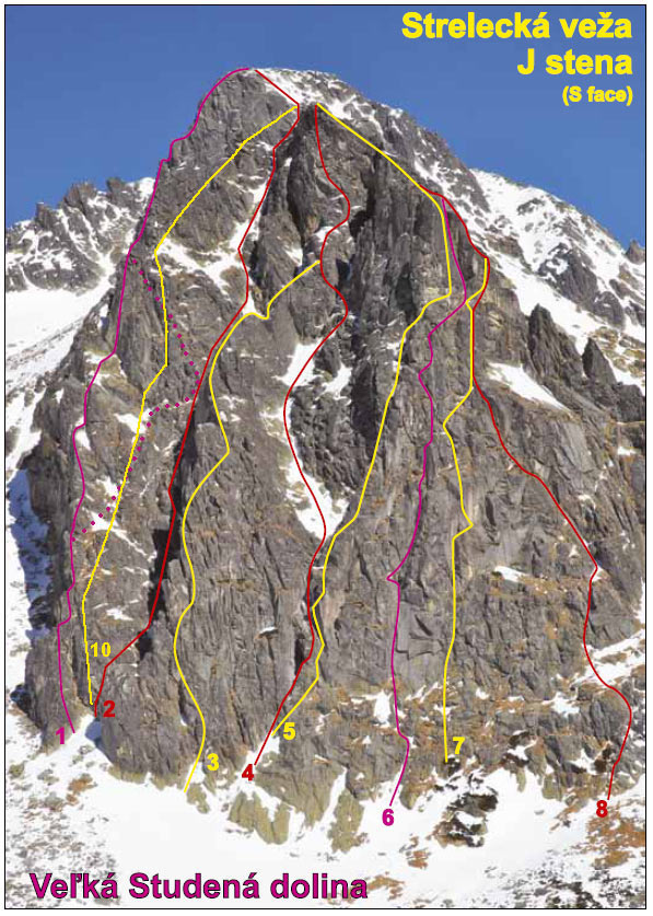 1. Ľavý pilier (III-IV) 2h. J.Lukač,K.Pavlik, A.Rapoš, 29.VI.1951 Info: AP/22, K/1444 Nástup je od hrany asi 10m vpravo. Platňou, ďalej hore na hranu, na hrane komínkom z ľavej strany piliera doprava cez hranu a znovu doľava hore na hranu a po nej 40m. na trávnátú lávku. Z nej 8m hore škárou, ďalej hranou na vrchol. Starý opis pri previslej veži asi v polovici piliera obtiažnosťou nesedí. Obtiažnosti zodpovedá skôr tento opis: Po ľahkej pasáži asi v tretine piliera odbočíme doprava cez stred steny trávnato skalným terénom priamo k plochému pilieru, ktorý je medzi hranou nášho piliera a žlabom vpravo, až na vodorovnú na trávnatú policu. Na pravý koniec police nad žlabom a odtiaľ hore pravou hranou plochého piliera späť doľava na hranou nášho piliera. Priamo hranou piliera hore až na poslednú vežu. Z nej zlezieme do malého sedielka. Zo sedielka cez posledný výšvih na vrchol steny.(Pozri bodkovaný smer na foto.) 2. Ľavým žľabom (IV-V) 3 hod. A.Kortvélyessy, A.Puškáš, 23.II.1951 Info: Lezené len za zimných podmienok. APIII/21, K/1445 Nástup na strmom snehu až pod previsnutý prah žľabu, Traverz doľava 5-8m., potom priamo hore 30m. Traverz naspäť doprava do žľabu a ním hore po snehu až do sedielka pod vrcholom. Odtiaľ jednu dĺžku na vrchol.3. Prostredným pilierom (IV-V) 3 hod. F.Kele ml., A.Puškáš, 7.VII.1951 Info: AP-III/23, K/1446 Na pilier nastupujeme sprava od spádnice piliera stienkou na pilier. Po pilieri až pod vrcholovú stenu ďalej ako cesta č. 4. 4. Pravým žľabom (V) 4 hod. A.Puškáš, L.Szabó, 7.II.1951 Info: AP-III/20, K/1447 Pravým žlabom steny. - Nástup je na strmom snehu až pod prvý previsnutý prah žľabu. Žľab obídeme sprava po exponovanom rebre a odtiaľ zase opäť do žľabu na strmý sneh. Stojíme pod druhým prahom, cez ktorý veľmi ťažko priamo hore, čistý ľad, v lete voda, ďalej pod jeho vrcholom traverz doprava a ďalej priamo hore už opäť na.čistom snehu až pod, vrcholovú stenu. Do nej vstup traverzom doľava, potom priamo hore a opäť doprava a ďalej priamo na vrchol. Zimná cesta.5. Pravým pilierom (V) 3 hod. F.Kele ml., A.Puškáš, J.Šuna, 11.VII.1951 Info: AP-III/24, K/1448 Pravým pilierom.-Nástup na pilier je od pravého žľabu vpravo, tesne na jeho hrane, a po nej 45 m. na skalného koňa pod previsnutú stienku. Ňou veľmi ťažko hore na, dobré stanovište a ďalej stienkou ťažko na miernejší terén. Odtiaľ traverz doprava k odštiepenému bloku a cezeň na platňu veľmi ťažko. Z nej na trávnatú plošinu. Ďalej 60 m. po ľahkom teréne až pod stienku s komínikom a ním hore na ďalšiu trávnatú plošinu. Z nej 60 m. pod výšvih veže so žltými škvrnami. Pod ňou traverz po tráve doprava, až stojíme pod platňami veže. Priamo po platniach, asi 20 m., až na lávku, ktorá ich pretína. Po nej traverz doľava a priamo po hrane veže na plošinu: Z nej cez dva výšvihy 120 m. na vrchol.6. Kút v platni (IV+,A0, RP:5+ ) 4 hod. A.Ferancová, L.Páleníček, 1.II.1975 2.zima:M.Palouš, V.Appel,Schwarcz, 27.XII.1977 1.leto:K.Jakeš, B.Mrozek, 2.VIII.1975 2.leto:Kralíček, Milo, 8.V.1976 3. Leto:J.Tremba, L.Gancarčík,J.Bednár, leto 1976 4.leto:J.Gazík, J.Gurník, 7.VIII.1977 1.RP: Š+J.Bednár, 29.7.1978 (Pozn. Vďaka vyššie uvedeným slávnym menám, je potrebné počítať s ťažšou klasifikáciou (o pol až stupeň), A0 - RP je tiež skôr 6+ možno aj 7-/7) V ceste je veľa skôb. Na záverečnú úzku špáru v kúte sa hodia friendy malej veľkosti 0,5 - 0,75.7. Pilier (V,A1,RP:VI) 3,5 hod. J.Bednár, L.Gancarčík, 24.X.1976 2.leto:J.Tremba, Vasilko,30.X.1976 3.leto:K.Jakeš a druh, 23.IV.1977 1.sólo a RP:P.Jackovič, 31.VIII.1988, klas. VI8. Pravou časťou steny (IV-V,A0) 3 hod. J.Horan, F.Odložilik, A.Puškáš, 22.IX.1963 Podrobnosti nie sú známe.9. Stredom východnej steny od Streleckých plies (IV-V) 1 hod. V.Prokeš, A.Puškáš, P.Vavro, VIII.1958 Prostriedkom východnej steny. - Tam, kde stena zabieha najnižšie do sutiny, je asi jej stred. Výstup vedie spočiatku opancierovanými platňami, potom prechádza do depresie, širokej, s vhĺbením a z neho vystúpime vľavo, potom zase vpravo nad vhĺbenie a ďalej pravou veľkou platňou depresie na vrcholové plató. Dosť rozlámané.10.Biela tma (M5) 4,5 hod. J. Svrček,D. Kolin 24.1.2014