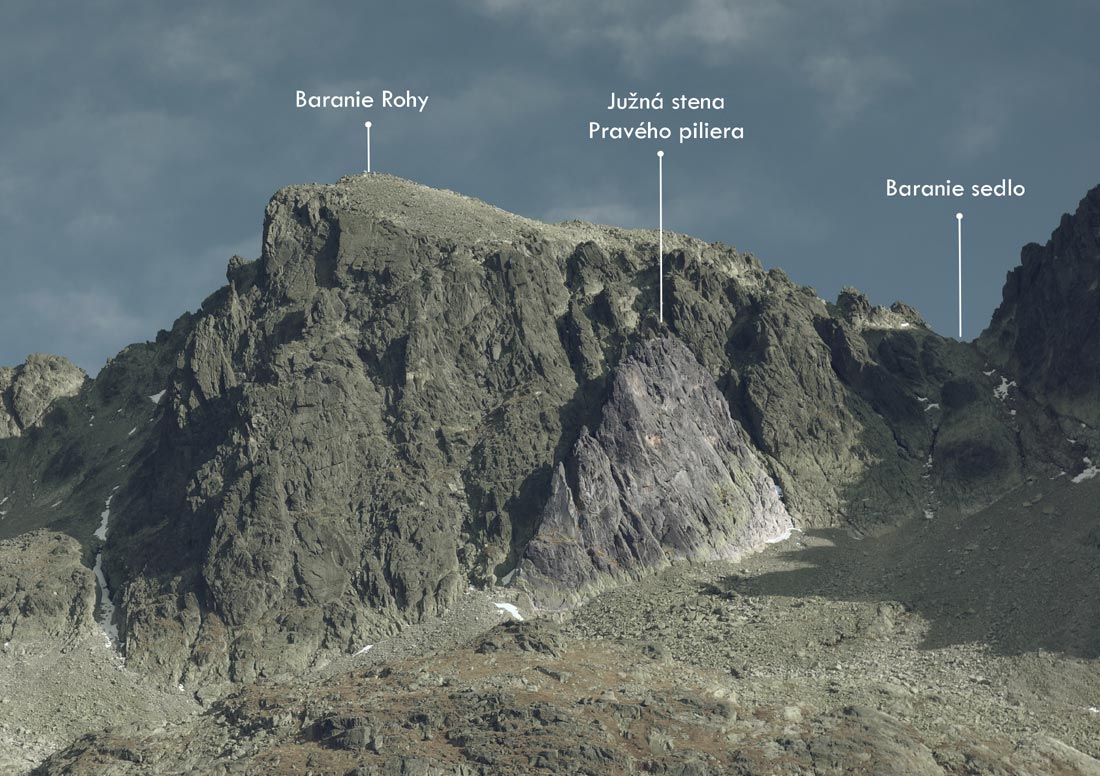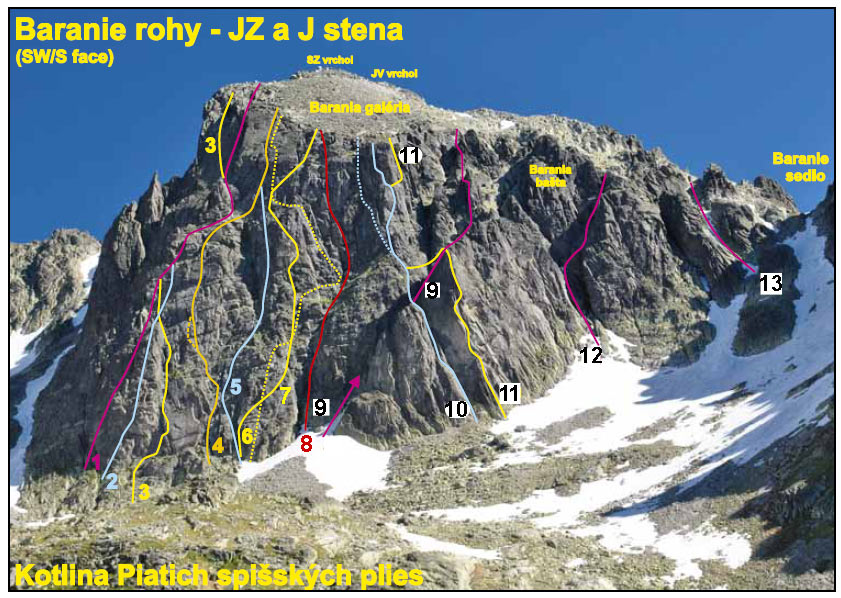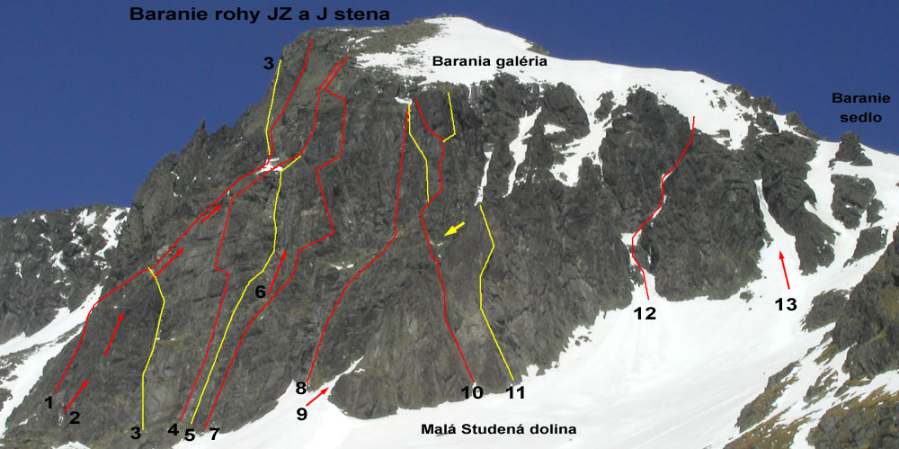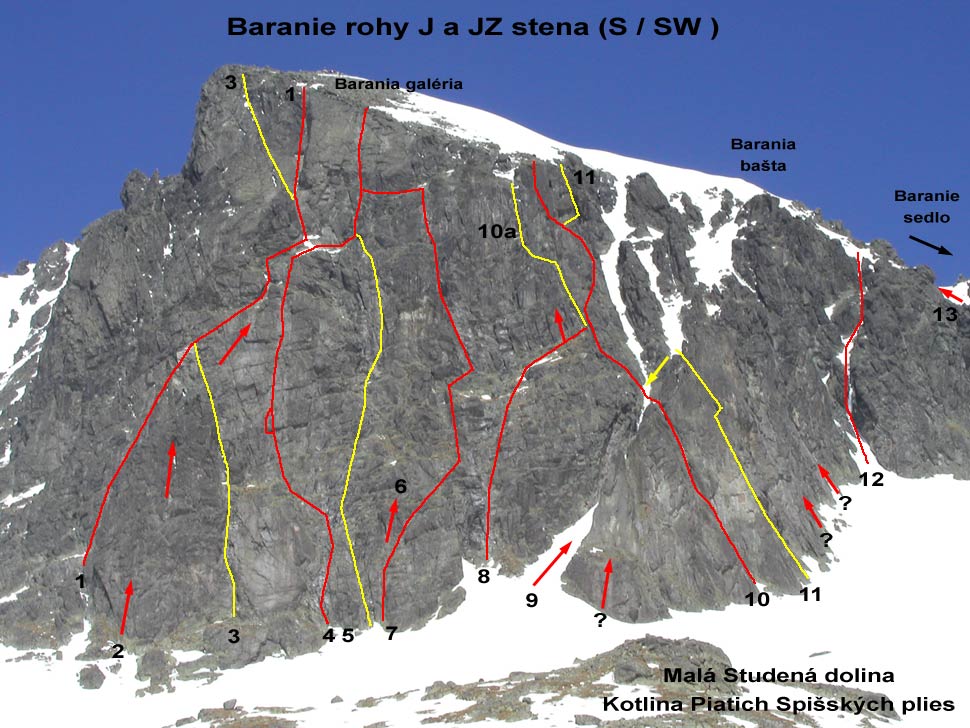1. Bocek - Ondrová - Puškáš JZ stena (IV-V) 4 h. K. Bocek, Z. Ondrová, A. Puškáš, 24. 7. 1949, Zima: V. Karoušek, A. Kucharík, 13. 2. 1955 Popis: Od západného piliera sa tiahne doprava stred steny, ohraničený vpravo rebrom. Nástup od rebra doľava cez trávnaté lávky asi 80 metrov. Stojíme na plošine ohraničenej zľava kolmou stenou, sprava rebrom, medzi ktorými sa skláňajú šikmé platne. Traverz doprava a ťažko priamo na rebro asi 15 m. Po 30 metroch po dobrých stupoch a záchytoch opustíme rebro, ktoré sa tiahne doprava a stojíme na okraji úžľabiny. Cez ňu priamo do steny a ňou hore k previsu, ktorý obchádzame zľava, ťažko. Ďalej na trávnatú trojuholníkovú plošinu. Z nej zárezom priamo hore cez vytláčajúcu stienku, ďalej doprava cez 5-metrovú stienku, exponované, na širokú trávnatú lávku. Z nej priamo hore asi 7 metrov; jej previsnutú časť zdolávame zľava, po pravej ruke máme sedieľko, z ktorého sa dvíha pokračovanie rebra. Pred nami je vrcholová partia, zľava obrovské platne ohraničené sprava kulisou tvoriacou mohutný zárez tiahnúci sa až na sutinovú terasu Baraních rohov. Lezieme v záreze asi 30 metrov. Odlial priamo hore až pod previs a cezeň veľmi ťažko hore, dalej do komína s vyčnievajúcim a vytláčajúcim blokom. Cezeň doľava na plošinu s balvanmi. Z nej priamo hore na západný pilier, ktorý ústi do sutinovej plošiny Baraních rohov. Odtiaľ asi 10 minút cez nahromadené skaly na vrchol. Pevná skala. 4 hod. Zima: Striedavá snehovo-skalná túra. 2. Ľavý pilier JZ na hlavný vrchol (IV) 2 h. V. Karoušek, B. Nejedlo, 20. 6. 1954, Zima: Š. Culka, V. Dubiel, 3. 4. 1960 Z juhozápadnej steny je predsunutý krátky pilier, ktorý siaha z celej steny najhlbšie do sutiny. Nástup je v ľavej strane piliera. Po jeho ľavej hrane a prostriedkom dve dĺžky lana na jeho temeno. Nad pilierom je platňovitá stena. Priamo hore dve dĺžky lana na trávnatú plošinu pod previsnutou vežou prostredného rebra. Traverzom doprava po ľahkých stupňoch, ktorými sa dostaneme na širokú sutinovú terasu, ktorá smeruje doprava hore, až do sutinovej plošiny Baraních rohov. Terasou asi 50 metrov doprava, pod prostriedok pravej polovice zďaleka viditeľných predvrcholových platní. Mierne previsnutým kútom na spodnú hranu platní. Cez platne hore ľahko na sutinovú plošinu a na vrchol. 3. Šádkova cesta JZ (IV) 2 h. J. Šádek, J. Renerová, 25. 7. 1949, Zima: W. Kubinec, G. Tschunko 30. 3. 1959 AP/I: Nástup z úžľabiny vrúbiacej Baranie rohy od západu.(???) Hned na začiatku úžľabiny do skál doprava na trávnaté terasky smerom k charakteristickému kútu hladkých stien. Jeho ľavou stienkou hore pozdĺž prečnievajúceho balvana, ktorý ostane vpravo, a pozdĺž trhliny pod previs 20 metrov. Ním šikmo doprava, potom späť oblúkom nad ním na pohodlnú plošinu. Odtiaľ žliabkom hore mierne doprava na ďalšiu plošinu k širokému korníniku. Ním hore a skoro vodorovnou trhlinou cez platňu doprava. Po lávke doľava späť na hranu rebra a hore k vežičke pod platňami na konci žľabu. Žliabkom vľavo od vežičky na platňu, traverz doľava do jeho stredu, pozdĺž trhliny hore na hranu na vrcholovú plošinu a na vrchol. 4. Ľavá depresia JZ - Lukeš - Sysel (IV) 2 h. Z. Lukeš, V. Sysel, 16. 9. 1970 1.op. K. Krzykara, G. Janota, 20. 7.1971, 1 Zima: W. Rutkievicz, A. Wilusz 18. 2. 1972, 2 Zima: M. Kořínková, L. Kořínek 29. 12. 1973 , Sólo: P. Jackovič, 2. 8. 1990, 20 min. Popis cesty: Pôvodná schéma autorov cesty i schéma z knihy výstupov na Téryho chate (uvedené u cesty č.5) je pomerne nejasná. Lepšie - pozri fotografiu pri ceste. Nástup je asi 50 m vpravo od Šádkovej cesty. Do výrazného vhĺbenia cez vodou vymyté biele skaly asi 15 m , potom po pravej strane od vhĺbenia (pozor voľné skaly) hore, pretraverzujeme vhĺbenie smerom doľava na pohodĺnú trávnatú policu pod výrazným previskom (jeho pravá časť je žlto sfarbená - kľúčové miesto). Okolo previsku zľava (skoba) ako prvovýstupcovia, alebo variant - priamo previsom výraznou špárou v ľavej časti (skoba, IV+). Pekná cesta v platniach, od druhej dĺžky pevná skala. Foto z kľúčového miesta v priloženom foto. 5. Krzykara - Janota JZ (V-) 2 h. K. Krzykara, G. Janota, 20. 7.1971, Sólo: J. Gurník, 22. 5. 1983 Zima?: D. Solyári, G. Gózony, P. Nagy január 2004 6. Narovnanie pravej depresie - Blahout ..(V) 3 h. M. Blahout, B. Karasová, O. Láskavá (Zibrínová), 20. 8. 1954 Zima: J. Koršala, P. Vavro, apríl 1959 Stredom steny prostredného rebra, narovnávajúci variant. — Nastúpime v spádnici oranžového piliera a priamo hore podeň. Ďalej ním najprv vľavo, rozlámaným komínikom asi 20 m. Traverzom doprava na prilepený blok pod previsom. Žliabkom nad previs a šikmo doprava na pohodlnú policu, ktorá sa konči kútom. Pravou hranou kúta pod vodorovný, druhý previs. Pod ním traverz doprava asi 3 m za hranu. Nepatrným vhĺbením hore ku skobe. Mierne doľava na balkónik pod trojuholníkový, zdola viditeľný previs. Pravou hranou do úrovne previsu, ďalej po prerušovanej polici traverz asi 8 mv vpravo na členitú hranu žliabku. Komínikom a stienkou na trávnatý balkón, ďalej hore na sutinovú terasu pod prevismi vrcholovej platne. Ďalej ako cesta č. 7. 7. Pravá depresia JZ steny - Heckel..(IV-V) 3 h. V. Heckel, J. Jiříček, V. Karoušek, K. Trousílek, 8. 8. 1954 Zima: O. Chudý, J. Krištúfek, 3. 4. 1960 Stredom steny prostredného rebra. — Nástup je hodne vľavo od Grószovej cesty, hore na plochý Široký pilier medzi dvoma veľkými, širokými jarkami v svetlých skalách. Pilierom kolmo hore niekoľko dĺžok lana až na trávnaté plošiny. Nad nami sa vypína kolmý, oranžový pilier, ktorý je v prostriedku steny. Ľavou stenou pod kolmú stenu piliera. Pod stenou traverz doprava cez pravú hranu piliera