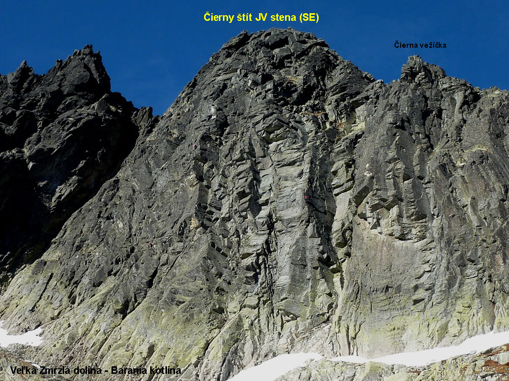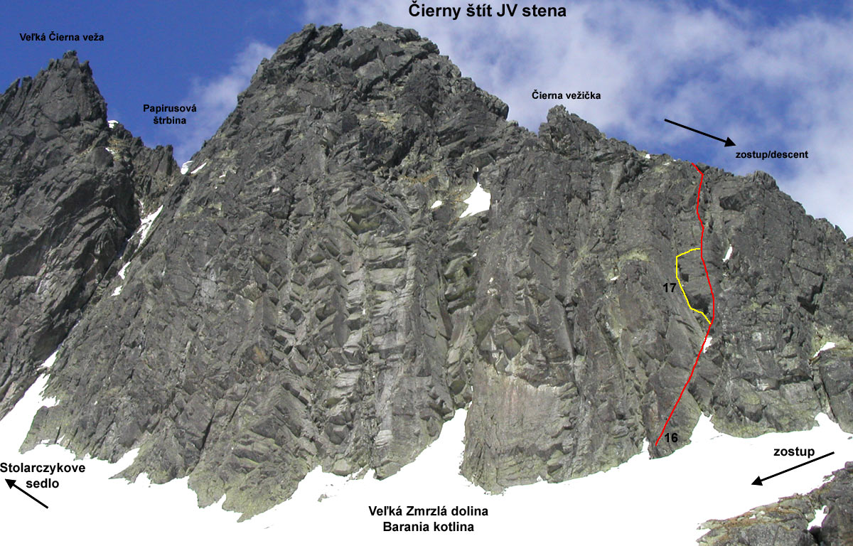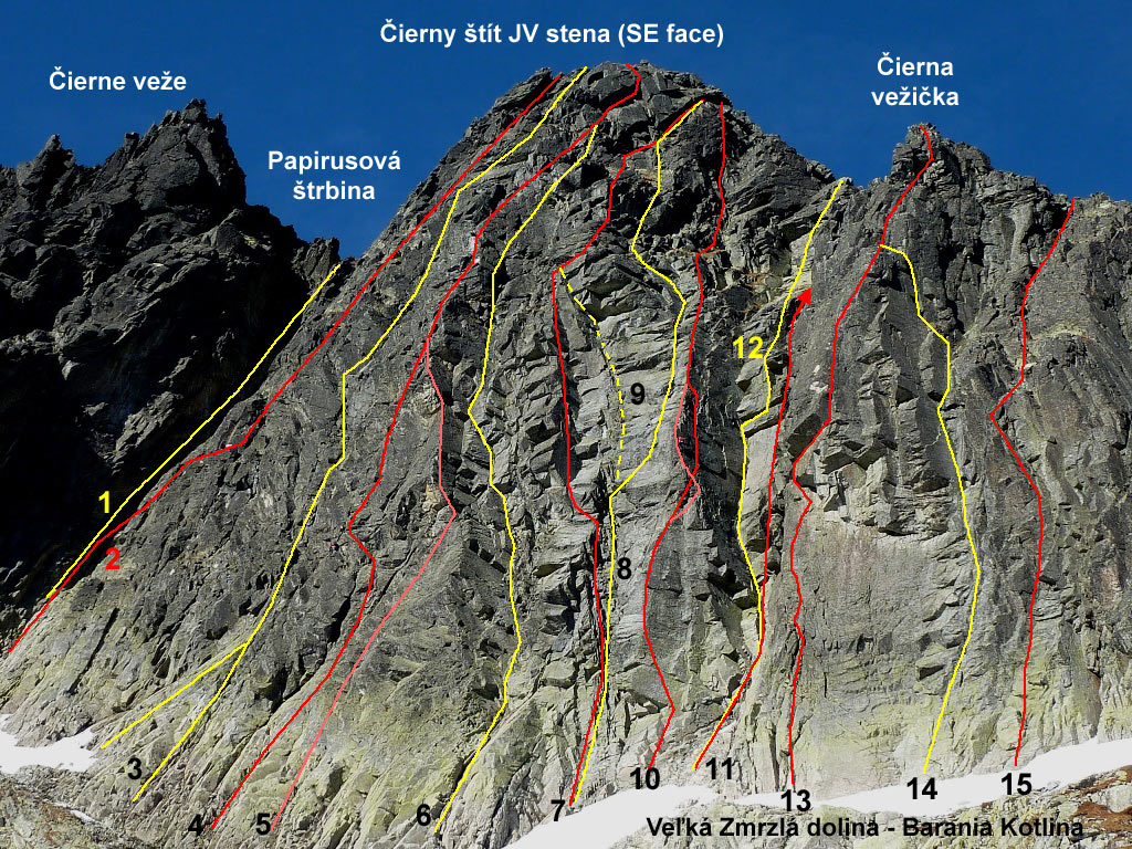 1. Do Papirusovej štrbiny (III) 1h. J. Chmielowski, Z. Klemensiewicz, W. Kulczynski, M. Swiercz,15. 8. 1911 1. zima: J. Psotka, Z. Zibrín, 20. 4. 1956 Info: AP I/1, K/2005 Komínom, ktorý spadá dolu zo štrbiny. - 30 m. žľabom hore až po zúženie, kde je žľab prehradený veľkým balvanom, ktorý obchádzame vľavo. Ďalej komínom, 6 m., vzpieraním hore, potom po lište na platni vpravo. Cez hladkú stienku, zase späť do komína nad vklinený balvan. Nad nami sa komín rozvidluje. Pravou trhlinou cez previs, potom na rebro a cezeň kúsok hore, dalej doľava na stupeň v ľavej trhline tesne nad veľkým previsom: 10 metrov plochou trhlinou na štrbinu.2. T. Szafka, E. Lindner (III) 2h. T. Szafka, E. Lindner, 18. 8. 1911 1. zima: K. Cerman, J. Psotka, 17. 3. 1953 Info: AP I/98, K/2009 Túto úzku stenu ohraničuje vľavo komín Papirusovej štrbiny a vpravo málo výrazný pilier, ktorý oddeľuje južnú stenu od juhovýchodnej. Komínom Papirusovej štrbiny dve dĺžky lana hore, potom doprava a po skalných stupňoch ďalšie dve dĺžky lana hore pod komín: Ním ťažko 12 m. hore na pol metra širokú trávnatú rimsu, ktorú sledujeme doprava k výraznému rebru. Prekročíme ho doprava. Po ďalšíchdvoch dĺžkach lana krátka lišta. Nad ňou cez rebro a žliabky s ľahkým odchýlením doľava do hlbokého žliabku, ktorý sa tiahne na plochý úsek hrebeňa medzi vežičkou vo východnom hrebeni a vrcholom. Žliabkom na východný hrebeň a ďalej na vrchol. 3. Stanislawského depresia (IV-) 3h. B. Chwascinski, W. Stanislawski, 29.8.1929, 1. zima: B. Duchoň, B. Pánczel, L. Wernerová, 28.4.1934, 2. zima: K. Cerman, O. Kopal, A. Puškáš, 10.3.1952, Free sólo: M. Kapusta, 14. 9. 1979, Veľmi pekná klasická cesta ľahšej obtiažnosti, lezenie prevažne v kúte vo veľmi pevnej skale. Pôvodný smer nad 4. štandom uhýba doľava do výrazného ale lezecky nezaujímavého žľabu a ním do sedielka medzi predvrchol a hlavný vrchol. Lezecky zaujímavejšie je urobiť pri 4. štande vodorovný traverz 10 m po širokej polici na Puškášov pilier a doliezť cez posledný štand v Puškášovi po hrane na predvrchol. Cesta je vybavená lepenými borhákmi na stanovištiach, potrebná je 1 sada frendov alebo čokov na postupové istenia. Veľmi dobré možnosti na zakladanie. V ceste sa nachádza aj zopár starých skôb, ktoré majú hlavne orientačný význam. Opis podľa AP-I/99: Vstup do skál je z rampy, ktorá vedie do Stolarczykovho sedla, niekoľko desiatok metrov vpravo od ústia komína Papirusovej štrbiny. Smer výstupu udáva biely výlom skál v spádnici vrcholu, asi 60 metrov nad nástupom. Vľavo od piliera, deliaceho stenu, vidíme nevýrazné vhlbenie, ktoré sa začína previsom asi 30 metrov nad úpätím steny. K previsu : alebo :zľava šikmo stúpajúcimi platňami, alebo: priamo zdola pravou z dvoch rebierkom oddelených trhlín. Pod previsom niekoľko metrov po pravej stienke pravej trhliny na úzku rímsu. Rímsou doľava späť do trhliny. Zakrátko z nej von a cez stupne šikmo doľava na plošinu. Z plošiny doprava do veľkého zárezu vhĺbenia. 20 metrov zárezom a po prekročení malého previsu ešte 15 m. v jeho ľavej stene na stupeň. Odtiaľ doprava do komínika. Ním a potom ktoroukoľvek z dvoch trhlín do výklenku pod previsom. Stienkou po ľavej strane na trávnatú plošinu, potom po rebierku hore až do výšky podlhovastej terasky, ktorú vidíme vpravo. Prekročíme puklinu a vystúpime na terasku. Teraz 12 m. doprava na okraj obrovského zárezu. Rebierkom, sprevádzajúcim ho zľava, hore na stupeň a medzi rozorvanými skalami mierne doľava na ľahší terén. Vyššie sa stena zužuje v platňovitý pilier, končiaci sa na predvrchole. Bud prechod doľava do žliabku a ním na sedielko medzi vrcholom a predvrcholom, alebo doprava a po platniach piliera na predvrchol. Hrebeňom doľava na vrchol.4. Puškášov pilier (IV) RS2 4h. M. Mereš, R. Presler, A. Puškáš, 10.7.1952 1. zima: ?, 1. poľský zimný výstup: P. Lutynski, P. Mularz, 20.3.1978 Info: Táto cesta je zaistená borhákmi na stanoviskách (3st/6ks/1pb), V.Tatarka a spol., 29.7.1999, AP I/102, K/2011 Vstup do skál je v spádnici piliera škárou, ktorá sa rozširuje a zaniká pod previsom. Cez previs (V ) a ďalej doľava na balkónik, z ktorého dobre vidieť na Stanislawského výstup. Z balkónika cez ďalší previs priamo, potom mierne doľava a ďalej po platniach k nápadnému odštiepenému bloku. Od neho doľava po platni traverz na hranu k nepevným kameňom. Cez ne priamo hore po dobre vrstvených skalách na trávnatý pás. Z jeho ľavej strany hore poza odštiepený blok, ďalej, už bez ťažkostí, na koniec piliera na predvrchol a doľava hrebeňom na vrchol. Výstup exponovaný, pekný, v pevnej skale. 5. Narovnanie piliera (V) RS2 2,5h. J. Michalko, V. Tatarka, leto 1982 Info: Táto cesta je zaistená borhákmi na stanoviskách, (2st/4ks/1pb) V. Tatarka a spol., 3.10.19996. Šádkova cesta (IV+) 2,5h. K. Bocek, M. Šádek, 29.8.1950 1. zima: Veselý, J. Weincziller, 2.4.1957, 2. zima: I. Gálfy, J. Weincziller, 2.4.1958 Info: AP I/101, K/2012 V pravej polovici steny vidíme tri vhĺbenia : Ľavé (tesne vpravo od piliera- Stanislawski) smeruje k predvrcholu a pravé sa končí vo veľkom previse. Výstup vedie stredným vhlbením. Žliabkom s jedným stenovým prerušením hore až na koniec. Jeho pokračovanie nájdeme vľavo hore. Po 15 metroch cez menšie prerušenie žliabku vľavo pod štvorcový previs (až sem tri dlžky lana). Previs obídeme tesne vľavo, potom niekoľko metrov hore pod ďalší veľký previs. Pod ním 2 m. traverz doprava a žliabkom hore, pokiaľ to dovolí. Odtiaľ ťažký krok doľava a žľabom za hranou ďalej. Za stienkou nasleduje niekoľko strechovitých previsov, ktoré obchádzame zľava doprava do nového žľabu, ktorého ľavú časť tvorí stena. Stenou hore, čím sa vyhneme pre