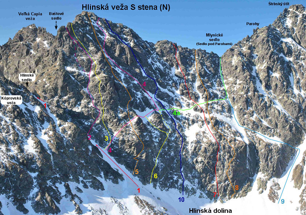 1. Do Hlinského sedla (I.) 0,5h. Známe turistom už dávno. V zime na čistom snehu. Sedlo je skôr úzkou štrbinou a je priechodné aj na stranu Mengusovskej doliny, žlabom do Satanej kotlinky, z ktorej je naopak možné pristúpiť aj k S stene Hlinskej veže. Praktickejší prístup je však cez Kôprovské sedlá. Zo sedla je možné pokračovať aj exponovaným výstupom - hrebeňom na vrchol Hlinskej veže.(II-III, 1,5 hod.) 2. Ľavou časťou (IV+) 11h. A. Głazek – K. Głazek – E. Zaczyński, 10. 2. 1980 Popis: Z ľavej strany veže vedie výrazný pilier, po ktorom vedie Romanovského cesta. Z ľavej strany tohoto piliera beží na hrebeň paralelne vhĺbenie, ktorým vedie výstup. Nástup je trochu vyššie v žlabe do Hlinského sedla, kde je bočný žliabok smerujúci doprava. Na hrebeň doliezame v štrbine za výrazným skalným zubom. 3. Kulhavý-Romanovský (VI, pôvodne V, A0 / ) 4h.J. Kulhavý – J. Romanovský, 5. 2. 1977Voľne: W. Bojanowski, B. Łangowski, 23. 2. 2025. Pôvodné V, A0 oklasifikovali na V+. V hornej časti narovnávajúci variant za VI. 4. Komarnického cesta (II.) 1,5h. G. Komarnicki, 26. 6. 1911 Rampou zo žlabu vedúceho do Hlinského sedla traverzujeme doprava stenou až pod vhĺbenie, ktoré smeruje hore na hrebeň, vpravo od Romanovského piliera. Hore vhĺbením cez krátke a ľahké žliabky, pri konci s odchýlením doprava na Z hrebeň. 4a. Variant do Mlynického sedla. (I.) 1 hod. F. Bock – P. Skokan – V. Wilke – C. Wolf, 15. 8. 1912, v zostupe. 5. Machnikova cesta (V.) 3h. A. Machnik – P. Maleta, 21. 8. 2002 6. Spodnou ľavou časťou steny (III.) 2,5h. R. Drojecka – L. Januszewicz – J. Panek, 4. 8. 1937 Vstup do steny v ľavej časti v spádnici vrcholu, asi vo výške skalného bloku pod žlabom v ceste 1. Cez trhlinu hore platňovitými stienkami do trávnato-skalného zárezu. Ním na koniec pod previsnuté stupne a až na platňu. Po nej šikmo vpravo hore na šikmý stupeň Z neho šikmo vľavo na hranu bielej platne. Hore platňou pod čiastočne previsnutý prah. Cez prah a trávnatými stupňami pod strmú lámavú rínu. Ňou až do miesta kde sa stáva previsnutou. a odtiaľ doprava hore na malú previsnutú platňu. Vpravo je plošinka za odstávajúcou vežičkou. Z platne vľavo, výraznými lávkami na ľahší terén až na systém trávnato-skalných lávok pretínajúcich celú stenu - kde zľava prichádza Komarnického cesta. Dolná časť exponovaná - III, ďalej pokračujeme hornou časťou Komarnického cesty č.4 (II) na hrebeň, alebo cestou 4a do Mlynického sedla. 7. Cesta inštruktorov (VI-/VI, A1) 6h. P. Jackovič - P. Hámor - A. Ružbašan, 6. 3. 1992 12 skôb, frendy. 8. Hexcentrovou puklinou (V, A2) 15h. V. Houba – P. Zelina, 15. – 16. 3. 1980 9. Do Mlynického sedla ( miestami III.) 45 min. J. Dürr – A. Szczepański – J. A.Szczepański, 8. 7. 1925 Popis: Spočiatku severnou stenou Štrbského štítu. Potom cez rampu prerušovanú strmými stienkami doľava pod Mlynické sedlo a popod strmé steny do plytkého vhĺbenia vedúceho zo sedla. Ním hore. V lete dole stienky miestami III. V zime na čistom snehu. 10. Silná príťažlivosť ( M6-) 7 hod. M. Sim – I. Staroň, 13. 3. 2022