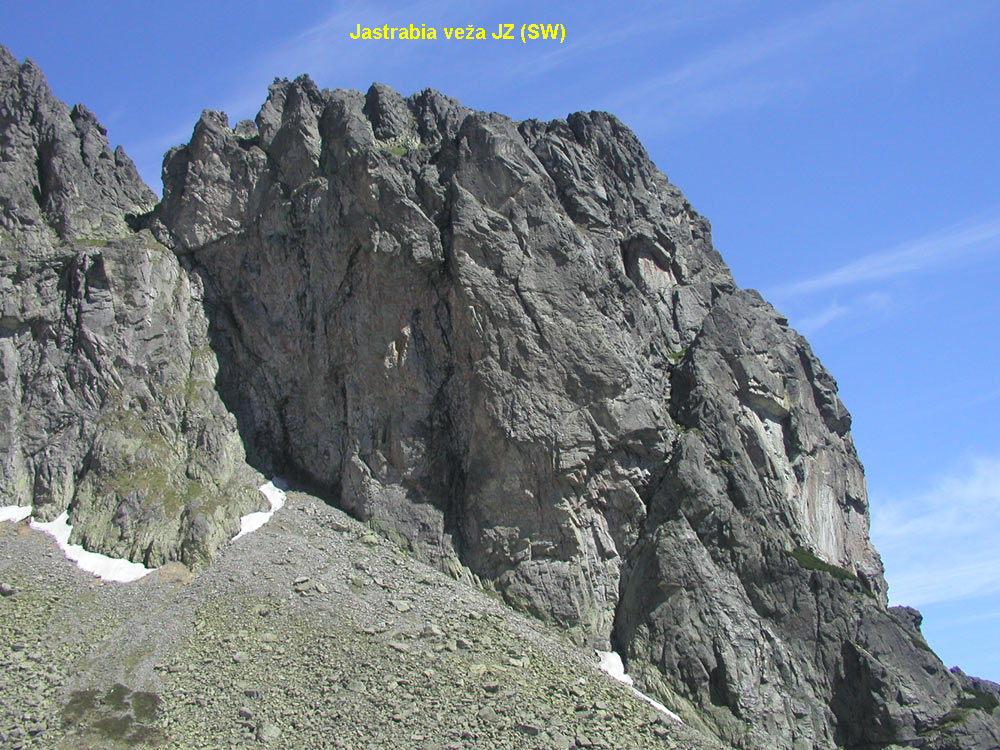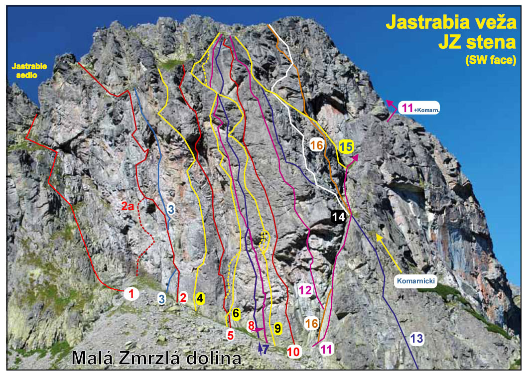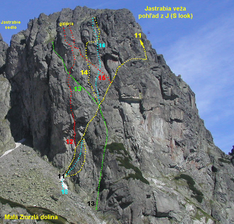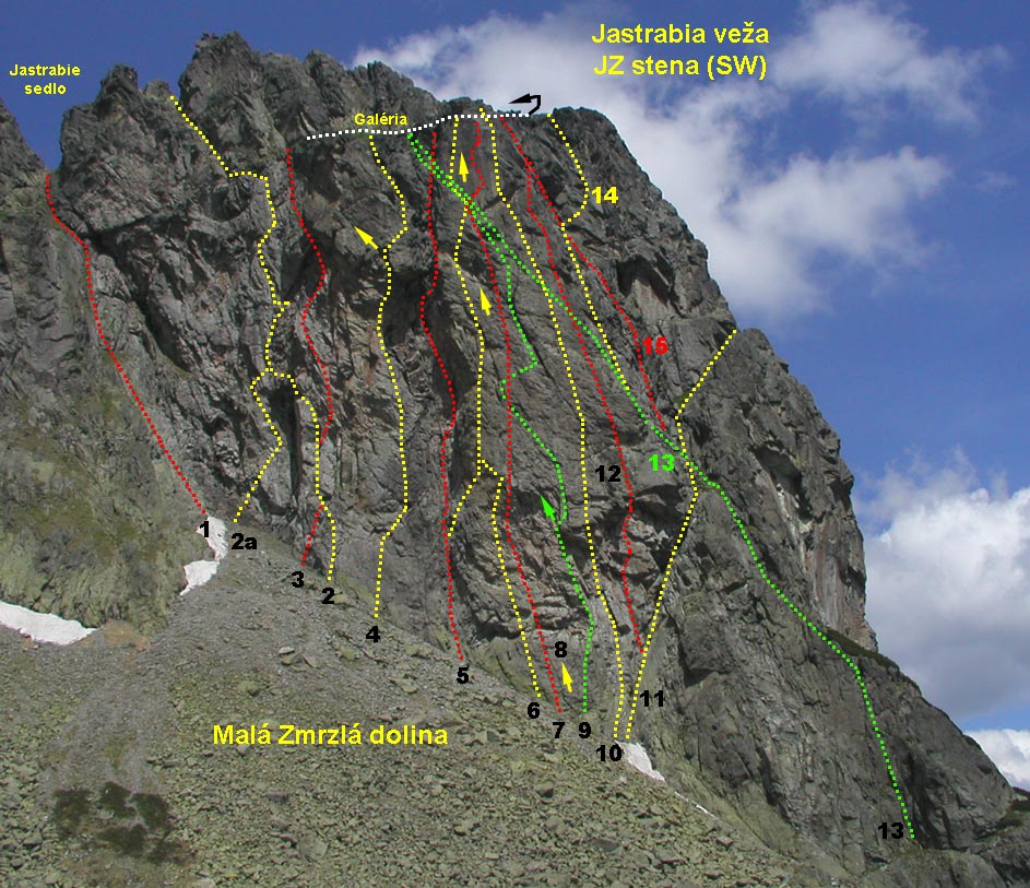 1. Jastrabie sedlo (II-III) 1,5h A. Czermiňski, J. A. Szczepaňski; 31. 5. 1927 AP/I:Tam, kde sutina siaha najvyššie do jz stien Jastrabej veže, sa tiahne šikmo doľava hore k sedlu strmá roklina. Tesne vľavo od ústia rokliny na trávnatý pás a z neho cez 2 m stienku na vyšší pás. Teraz vodorovný traverz doprava do širokého žlabu v ktorý roklina prechádza. Odtiaľ na rozľahlé trávniky alebo priamo žľabom ťažko, alebo najprv po rebierku, ktoré ohraničuje žľab sprava. Potom cez žľab a po jeho ľavej stienke na trávniky. Z trávnikov sutinovým žľabom na sedlo. 2. Depresiou v ľavej časti (VI-,A4,e) A. Belica, M. Belica, M. Ondráš, P. Tarábek, 26. - 28. 8. 1973 2a. Nástupový variant (IV, A1) Prvé opakovanie s 2 dl. nástupovým variantom , L. Nowinski, S. Waclaw, 18.-21.8. 1976. K tejto ceste - pozri aj pôvodné schémy od autorov v "Iné užitočné info"3. Cez Červenú strechu (V+,A3) 14h S. Glejdura, J. Hyžný, 7. a 8. 10.1979.4. Oranžový expres (V+,A4,e) O. Pochylý -P. Stříbrný, 27., 29., 31. 9. a 14.10. 1973. K tejto ceste - pozri aj ďalšiu schému v -Iné užitočné info- 5. Komín Dieškovcov (VI,A4,5e,25h, RP 8) 5-8h. I. Dieška, P. Dieška, R. Mock, 18. 8. 1966 1. RP: M. a M. Coubal, 16. 10. 1988. K tejto ceste - pozri aj ostatné publikované schémy v -Iné užitočné info- Pôvodný technický popis :Náročný výstup, miestami lámavá a mokrá skala, objektívne nebezpečná, kľúčová je 3. dĺžka lana. Vstup do steny je v spádnici mohutného previsu do komína. Cez biele skaly do komína. V ňom okolo odštiepeného kameňa (slučka, V+) až na trávnatú plošinku pod previsnutými skalami. Traverz doľava (V+) za ostrú hranu a platňovitým zárezom na stanovište pri odštiepených blokoch (1, 40 m). Vľavo od stanovišťa cez slabinu v previskoch (V) do nevýrazného žliabku a ním (V+, VI, V) na ďalšie stanovište pri čiernych skalách (2) . Po skalných plošinkách traverz vpravo k rozbitej stienke. Tou čo najvyššie a po zatlčení skoby v zostupnom traverze doľava (čiastočne odkývnutím - kyvadlový traverz) k nitu na pravej strane skalného koňa. Cez previštek po skobách (A3) k ďalšiemu nitu a ďalej až pod previs. Tu stanovište v rebríkoch v dobrých skobách (3). Traverz vpravo cez hladkú stienku (A2) a cez previštek (V+) do čierneho mokrého kúta. Kútom hore (A2) až pod hlavný previs viditeľný už z doliny. Popod previs vedie doprava dobrá škára (VI) na stanovište na exponovanei väčšej plošine (4) s blokmi. Z plošiny komínmi (5), neskôr žľabmi (6) 3 dlžky lana na trávnatú galériu (sutinovú rampu) pod vrcholom. Ďalej vpravo ľahkými skalami na vrchol. 6. Pravá hrana komína Dieškovcov (V+,A3, RP 7) 15h B. Mrozek, 8. - 9. 9. 1979 1. RP: P. Ondrejovič - V. Plulík, 17. 10. 1988. 5-6h. K tejto ceste - pozri aj ďalšie schémy v -Iné užitočné info- a schému k ceste Chlapcom z Everestu Pekná, trochu morálová línia v pevnej skale. 7. Chlapcom z Everestu 88 (RP 8+) P. Ondrejovič, J. Vonderčík, 25. 9. 1994. Venované pamiatke: P. Božíka, D. Becíka, J. Jaška, J. Justa. Cesta vedie vo veľmi peknej a pevnej skale. 1.opakovanie RK: R.Staruch, P.Kuchár, september 1994. 2. opak. P. Packo, J. Lovás, OS-kľúčová dĺžka, 15.10.1994. 3.opak. RK-M. Zentko, M. Neumeister, 4.11.1994 (1dl.8+,4dl.8-) 8. Pavúci lezú do neba (PP 8-/8) 1.PP: L. Fides, P. Ondrejovič, 5. 9. 2002 9. Červené previsy (VI,A4,e RP 7-/7) 5h. P. Pochylý, J. Zrůst, 24. 8. 1967, 1.opak. Z. Čepela, P. Bednařík, september 1970 2.opak. A. Halás, L. Hodál, 12. 10. 1970 1. RP: A. Formánek, R. Mihál, 21.8. 1983. K tejto ceste - pozri aj ďalšie schémy v -Iné užitočné info- a schému k ceste Chlapcom z Everestu Nádherná vzdušná cesta v pevnej vodou vymytej skale. Dobre odistená. Podľa variantu v spodnej streche 7- až 7. Popis technického priestupu: Vstup do steny je z pravej strany, kde najnižšie vbieha do sutín. Vpravo sa tiahne nápadná trhlina, zľava ju ohraničuje komín Dieškovcov . Depresiou v podobe plytkého komína hore pod velmi výrazné červené strechy. Priamo hore cez prvé zalomenie strechy (A2) na nenápadnú platničku (IV+) a pod systém prekrývajúcich sa striešok, tvoriacich nevýrazný zárez komínovitého tvaru. Nimi hore (A2, A4), miestami volné lezenie (VI), a krátkym traverzom cez pilierik vpravo na plošinu v kúte (1, 45 m). (Pozor na staré skoby nad stanovišťom vľavo.) Z plošiny cez hranu platňovitého kúta doprava na pilierik (V+) a ním hore systémom zárezov pod červené skalné brucho (2, V+). Pod bruchom traverz doľava 12—15 metrov (V) do kúta a ním hore (IV+) 5 metrov. Potom traverz doprava cez stienku do hlbokého komína, viditeľného už z doliny (IV+). Komínom, jeho ľavou stranou hore pod veľkú strechu a bloky tvoriace jaskynku (3). Z nej šikmo doprava cez previsnutý zárez pod výrazné platne v tvare písmena Y (V). Ľavou stranou platne na hranu za blok (4). Od bloku krátky traverz vpravo a po hrane (vľavo od nás hlboký Dieškov komín) až na sutinovú rampu pod vrcholom. Ďalej vpravo ľahkými skalami na vrchol. 10. Sunset Boulevard (RP 9) 1.PP: J. Horváth, V. Linek, 10.10.1996 2.PP: D. Janák, R. Jurečka, 22. 6. 2002 1.RP: R. Lienerth, P. Kočvara, 22. 8. 2002 1.OS: G. Čmárik, 2007 Pekná cesta v pevnej skale 11. Stará cesta - komínom (III) 1,5h. P. ILLner, O. Rülke, august 1926 Zima: Okrem spodného úseku zasnežený výstup. M. Nitsch, P. Röhr, 17. 3. 1935. AP/I: Nástup pod zďaleka viditeľnú trhlinu, ktorá pretína spodnú pravú časť steny. Skalami vpravo od trhliny, neskôr jej dnom 3 dĺžky lana hore. Trhlina prechádza vyššie v hlboký komín, ktorý sledujeme až k jeho koncu. Teraz po tráve na rebro, ktoré zbieha z vrcholu a po jeho hrane 8 m. hore. Traverz doprava do trávnatého terénu. Kúsok hore, potom znova doľava na hranu rebra a ním zakrátko