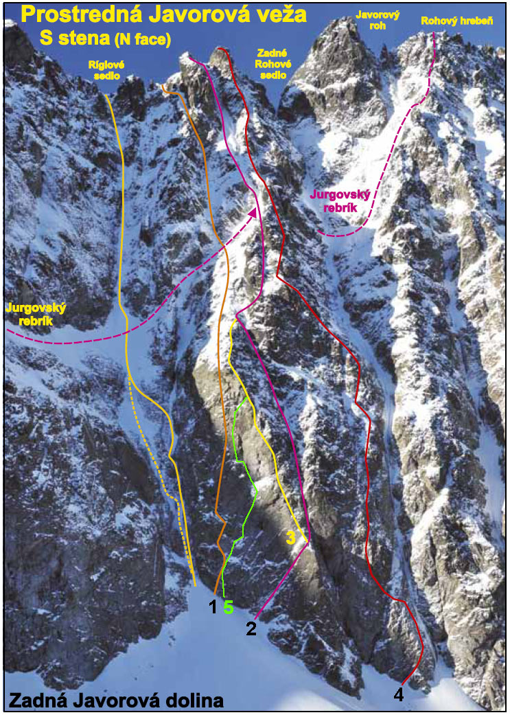 1. Žíznivá pouť (V/A1) 21h. B.Mrozek, K.Jakeš 14.-16.1.1978 2. Depresiou (V-VI) 6h. M.Badzynski, Z.Tracz 22.8.1961 1.zima:M.Bernardt, J.Chalecki, 17.-18.4.1962 v dolnej časti cestou Jurgovským rebríkom 3. Prostredným pilierom (V) ?h. P.Dieška, P.Malárik, R.Mock leto 1966 4. Zeleň leta (V-) 7h. Z.Drlík, L.Páleníček 21.6.1972 1.zima: Z.Karafa, P.Mačák, 2.2.1974 (Pravý pilier) 5. Debut (8-) O. Húserka, E. Milovská 3. 8. 2013 Materiál potrebný do cesty : Sada camalotov C4 - od 0,3 po veľkosť 3 Dva mikrofrendy C3 - zelený veľkosť #0, a červený veľkosť #1 Sada čokov, 6 skôb - tenké, rôzne dĺžky Autori:V sobotu sme v spravili s Evkou Milovskou prvovýstup na Prostrednú javorovú vežu, názov je Debut, klasifikácia 8-, Prvé dve dĺžky sú dosť rozbité, treba v ních rátať len s tým najhorším, ďalšie 3 sú celkom pekné. Veľmi to neodporúčam opakovať, ale keď už to je vylezené treba to asi aj zverejniť. Foto z lezenia:
