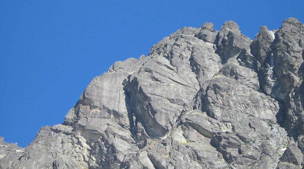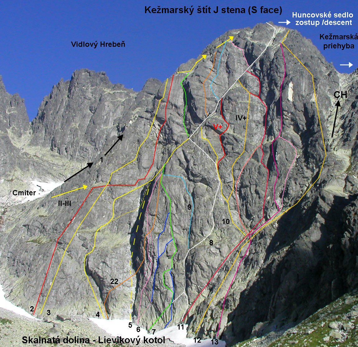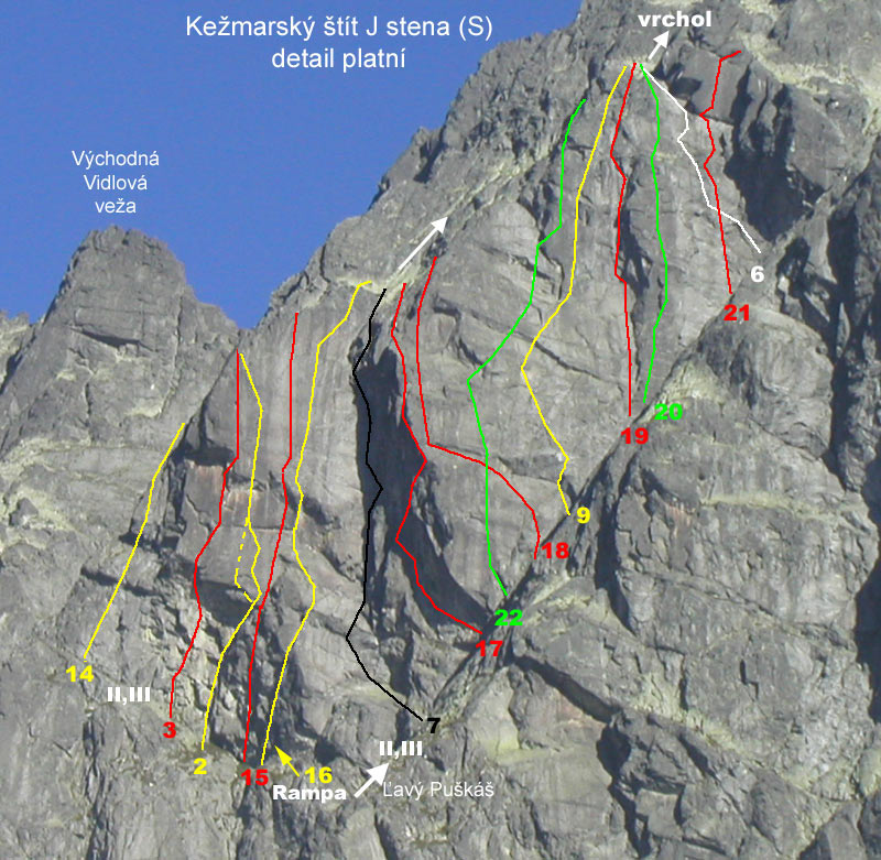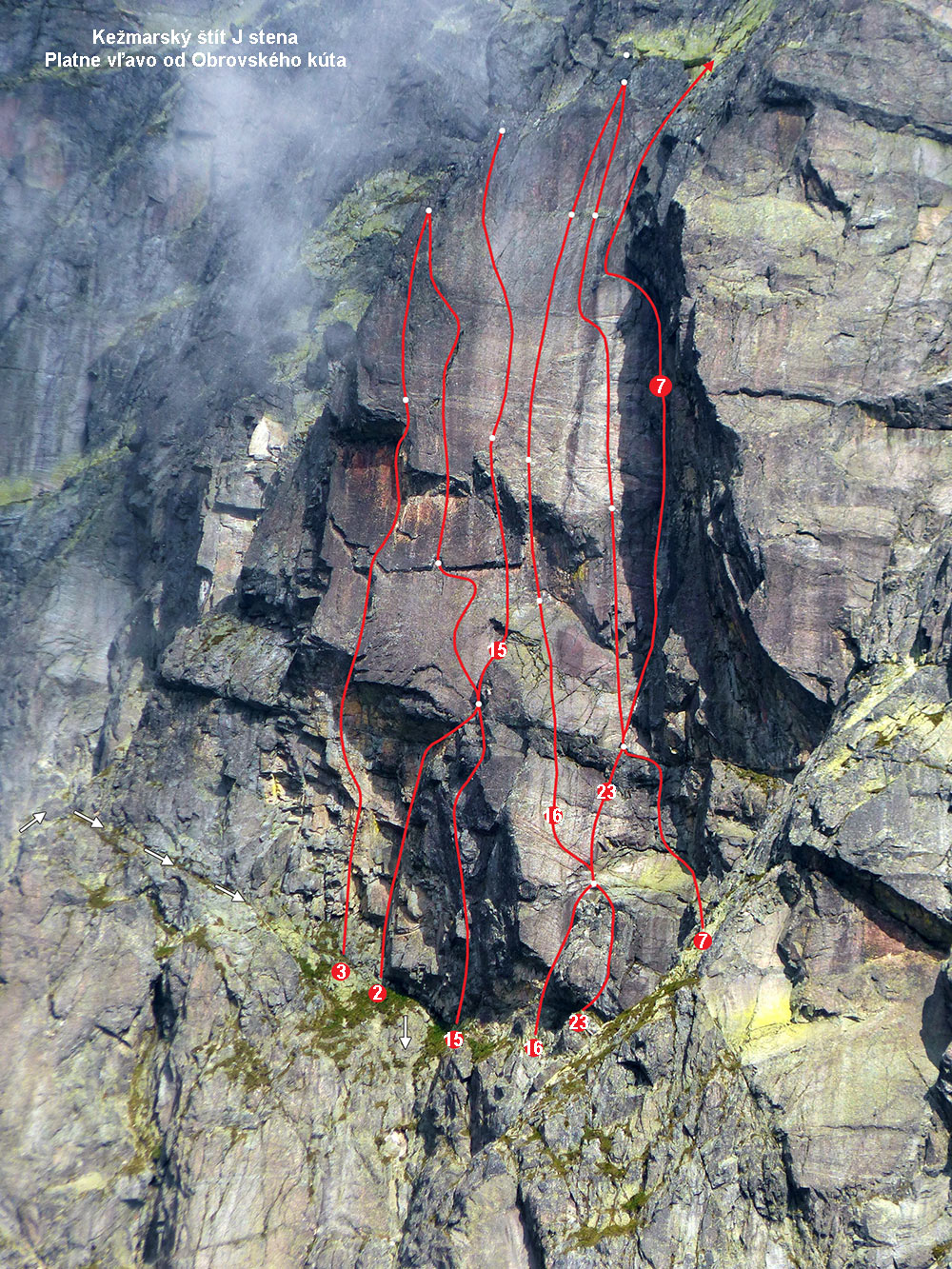 1. Pravým pilierom steny (III) 3h. M.Mogilnicki, A.Zalewski, 12.VII.1931 Info: AP1/80, K3/1930 Z Cmitera zľava na pilier, ktorý je pokračovaním horného okraja prahu doliny. Hranou priamo hore až na vežičku. Ďalej kúsok vpravo od hrany, potom jej ostrím na plošinu v ľavom boku piliera. Ďalej úbočím na ďalšiu plošinu a z nej na charakteristickú vežičku, ktorou sa ostrá spodná časť piliera končí. Nad nami je výšvih, rozšírený v stenu. Zliezame ho priamo. Nad ním už po menej naklonenej hrane piliera hore k miestu, kde sa zbieha niekoľko hrebienkov. Ďalej po hrane na vrchol.2. Pochylého platne (VI/A4 RP:8-) 9h.(3h.) M.Černý, D.Jágerský, O.Pochylý, P.Pochylý, J.Unger-Zrust, 16.8.1967 Info: cesta na pamiatku I. Špitalského, K3/1931 Materiál: 50 skôb z toho 10 špeciálnych 1.RP: J.Horváth, I.Spiller, 19.10.1986, 3 hod; Variant ( na foto bodkovaná čiara) -Voľný sen direkt- VII+, J.Horváth a spol. 1988. Pozri aj schému pri výstupe č.14 a foto pri ceste 23.3. Žlté strechy (VI/A4 RP:8) 21h.(4h.) J.Rybička, J.Šmíd, 14-15.6.1975; 1.RP: P.Ondrejovič, V.Plulík Info: prvovýstup 35 skôb, 4 jedničky, 3 bongy Pozri aj schému pri výstupe č.144. Ľavým vhĺbením - Puškáš (IV) 3-4h. A.Puškáš, A.Szabó, 17.7.1949; 2.výstup: J.Jurčišin, F.Kele ml., leto 1951; 3.výstup: K.Hellerová, B.Wišniowská, J.Wilczowski, 15.9.1954; 1.zimný výstup: K.Cerman, A.Puškáš, 10.3.1953 Info: AP1/88, K3/1932, Cesta v súčasnosti preistená fixným istením - na štandoch nerezové kramle ako v obrovskom kúte, postupové nity mammut 2-3/dĺžku. Istenie pokračuje aj po napojení sa na Birkenmajerovú cestu na rampe - 1-2 postupové nity, stanovištia. Potrebná aj sada frendov a vklínencov. Cestou sa dá zlaniť. Vstup do skál: Vľavo od prostredného piliera, kde sutina najvyššie vybieha pod rebro, ktoré vystupuje z ľavého vhĺbenia. Nad vhĺbením previsy. Asi 10m nad zemou je dobre viditeľný nerezový nit. Po ľavej strane kúta po platniach (ďalšie dva nity) a dobrých chytoch dĺžku lana k nerezovému U-borháku na stanovišti. Ďalej hore platňami v smere nitov a okolo previsu kúta do malého vhĺbenia. Pokračujeme ostro doprava do kúta ktorého koniec tvorí hladký kútik (nit). Cez neho hore na obrovský odštiepený obdlžnikový blok (IV). Na platni nad ním je lepený U-borhák-stanovište. Z neho asi 5-6m vodorovne doprava za hranu - tu je pole položených platní. asi 2m za hranou čiernymi pilierikmi (nit) rovno hore a cez položenú zelenú platňu rovno k stanovišťu s borhákom, pod plochým kútom. Originál cesta pokračuje najprv kútom hore a esovitým zahnutím doprava v hornej časti a traverzom po trávnatých platniach. smerom ku ceste 5. Krajšie: Zo stanovišťa po trávnatých pilierikoch smerom doprava (nit, bodkovaná línia na fotografii) a hore na rebro -stanovišťe. Z pravej strany pokračujeme spolu s cestou 5 po oblom pileriku ktorý vyplňuje stred vhĺbenia. Stále vhĺbením až po stanovište na ľavej strane (U borhák), cestou nity. ďalej Asi 7 metrov do malého kotlíka, kde prichádza aj pôvodná originálna cesta. Tu začína samotná rampa. Po pravej strane kotlíka hore, čiastočne pravým rebrom hore pod zelenú platňu v ktorej je nit, cez neho hore k lepenému U borháku- stanovište. Ďalej stále stredom čiastočne mokrého žľabu-rampy, popod strmé platne, ktoré sú za obrovským kútom. Tu sú aj žlté nity (z Birkenmajerovej cesty), taktiež postupové nerezové nity mamut, pokračujeme až po jej koniec - niekoľko dĺžok. Na konci do malého sedielka - dva žlté nity - posledné stanovište na rohu steny. Nad stanovišťom ešte asi 150-200 metrov ľahkým terénom na vrchol.5. Variant v platni (IV) I.Jurčišin, F.Kele ml., leto 1951 Info: AP1/89, K3/1933 Vpravo od výstupu č.4 sa ťahá hore hladká, obrovská platňa ohraničená z pravej strany vhĺbením, ňou vedie výstup. Spočiatku po ľavej strane platne 40m, ďalej šikmo doprava 20 metrov do pravého rohu platne. Odtiaľ asi dve dĺžky lana priamo hore k miestu, kde sa lomí J pilier steny.6. In memoriam Čondl - Rose (V/A2 RP:7) 6h. L. Jón,S. Šilhán, 30.8.1974 1. OS: P.Jackovič, J.Vonderčik, 1.7.1988, klas. VII7. Obrovský kút (VI/A4, RP:6/6-) 8h. (kút 3h.) I.Dieška, M.Plzák, P.Pochylý, J.Unger-Zrust, 16.9.1967; Použité špeciálne skoby 1. zimný výstup: Ľ.Gibas, L.Chudík, 11.3.1972; 2. zimný výstup: W.Fiut, P.Michnowski, W.Szalankiewicz, H.Zakrzewski, 1-2.3.1974; Istené sólo RP: M. Kapusta, 24.9.1983 Modrý nástupový variant je tzv. Varšavský kút. Iné varianty klasif. V. pozri doplnkové informácie k stene. Dnes je možné kút odistiť vklínencami a frendami. Stanovištia hornej časti cesty nad rampou sú preistené borhákmi tvaru U (3 maďarskí lezci) , asi á 30m.(5 stanovíšť). Po borhákoch je možné zlaniť na rampu a potom doľava rampou do cmitera. Detail štandu: 8. Birkenmajerova cesta (IV) 4h. W.Birkenmajer, J.K.Dorawski, 24.8.1930; 2.výstup: O.Mugler, R.Richter, B.Schäffer, 7.1932; 1.zimný výstup: K.Cerman, A.Puškáš, 10.3.1953; 2.zimný výstup: L.Andráši, M.Mereš, J.Stanko, M.Varga, 27.XII.1957 Cesta je dnes preistená nitmi (2017) a borhákmi, včítane hornej rampy kde sa stretáva viac ciest. Po preistení 2017 sa rozvinula kontroverzná diskusia o odstránení postupových nitov. Na základe odporúčania Správy oblasti Vysoké Tatry, boli trvalé postupové istenia autorom preistenia odstránené a ponechané len nové stanovištia, nity s krúžkom. Po opakovaniach má cesta niekoľko variantov (najčastejšie sú kreslené bodkovane), v spodnej časti najčastejšie lezená vpravo od Kriššákovej cesty vhĺbením. Pokračovanie - kúsok vpravo od hrany piliera alebo Puškášovou rampou. Vstup do skál je pri hrane piliera. Odtiaľ 25m šikmo doprava po rímse a ďalších 10m po skalnom páse prerastenom trávou. Ešte niek