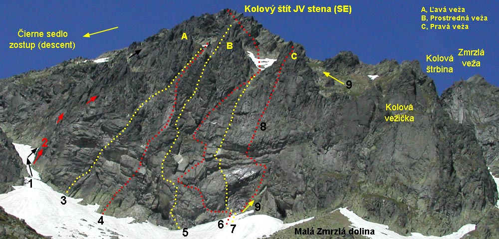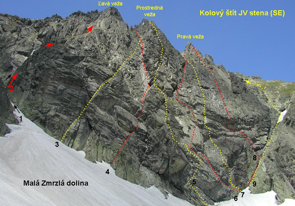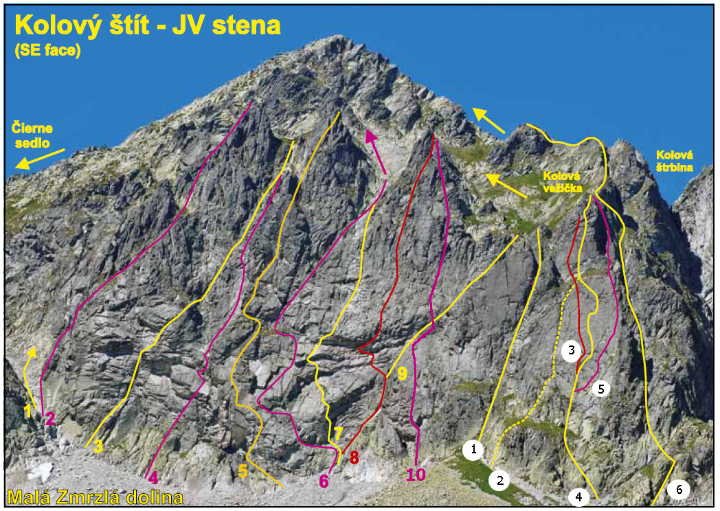 1. Vhĺbením v ľavej časti steny (miestami IV) 2h. J. Beck, A. Gy. Hefty,D. Reichart, A. Wiegandt 3. 9. 1922. Zima: K. Cerman, O. Kopal 11. 3. 1952. Free solo v zostupe:M. Kapusta 28. 8.1979 Popis: Nástup je v hlbokom žľabe, ktorý je v ľavej strane steny vpravo od kopulovitej vežičky. Ním hore po ľavej strane až po jeho kotol. Odtiaľ odbočíme doprava do postranného žľabu. Ním cez platne hore. Na konci žľabu ďalej doľava cez platne, stienky a sutinu na štít. Zima: Viac menej na snehu. Na jednom mieste ľadový prah. Pekná zimná cesta. 2. Ľavý pilier-Ľavá veža (VI) 2h. Albrecht Franowski, Karl Späth, 18.8.1963. Popis: Nástup je medzi Beckovou a Korosadowiczovou cestou na ľavom pilieri - ľavej veže. Hranou piliera hore pod previsy, ktoré obchádzame z pravej strany. Potom šikmo vľavo hore (skoba), od nej ďalej mierne doľava na trávnatú policu. Odtiaľ niekoľko metrov kolmo hore stenou popri skobe. Traverz doľava po vaskich skalných lištách na hranu piliera. Hranou hore (skoba) a následnou stienkou hore a ostro vľavo naspäť na hranu. (VI) Ňou hore 6 metrov na stanovište (skoba). Najprv ďalej hranou piliera hore a potom cez stienku (skoba s krúžkom), nad ktorou traverz smerom doľava do ríny a na ľahší terén. Ním ľubovoľne na vrchol. S cestou sa spája zaujímavosť: U Puškáša a prepisom z neho do sprievodcov vznikla chyba v menách a popis cesty chýba. O jeho uverejnenie sa zaslúžil Ivan Bohuš z Tanapu, ktorý vo VT 1/67 publikoval prepis zápisu z vrcholovej knižky Kolového štítu: Výstup klasifikácie VI je ceruzou, už dnes veľmi slabo viditeľne, popísaný v pôvodine takto: 18. 8. 63. 1. Begehung. Direkter linker Pfeiler. Wegbeschreibung: Zwischen Beckweg (IV) + Korosadowiczweq (V) befindet sich der Einstieg. Zuerst Kante empor - der überhang wird rechts umgangen. Dann schräg links einsteigen (H). Von Haken weiter leicht links haltend bis Grasfläche. Von hier einige Meter senkrecht empor an (H) vorbei. Lingstraverse auf schmeler Leiste zur Kante. Diese empor (inzwischen H) und anschliessendes Wandstück gerade hoch (Haken). Von diesem links aufwärts zur Kante. Diese ca 6 m hoch zu Standplatz (Haken). Von hier anfangs Kante, später über Wandstück (Ringhaken). Am Ende des Wandstücks Linksquerung zur Rinne, die auf leichteres Terrain führt. Von hier beliebig zum Gipfel. Schwierigkeit: VI. Dieser Weg wurde klassisch gestiegen. Empor-Friedrichsstadd Berlin. Karl Späth, Albert Franowski.3. Korosadowicz-Mogilnicki (IV-V) 2h. Z. Korosadowicz. H. Mogilnicki, 24. 7. 1931. Zima: R. Kotala, J. Sláma 25.4.1956 V minulosti najpopulárnejšia cesta na štít. Nástup je vľavo od spádnice vrcholu pri nápadnom červenom komíniku. Ním 12 m hore, potom traverz po platni 2 m doprava do nevýrazného zárezu. Ním hore cez platne do žľabu. Šikmo doprava cez žľab až k miestu, kde sa stráca v previsoch. Stenou doprava šikmo hore, do plytkého trávnatého žľabu vpravo od previsnutých skál. Odtiaľ na stupeň na hrane rebra, ktoré ohraničuje zľava veľké vhĺbenie. Niekoľko metrov po tráve hore, potom traverz 10 m doprava. Ďalej cez strmú stienku do hlbokého, trávnatého a skalnatého kuloáru a ním vpravo 45 m hore. Stále naľavo od hlbokého vhĺbenia. Tu do vhĺbenia a ním smerom na štít hore. 4. Cesta Birkenmajerových pokusov (VI) 2,5h. Ivan Dieška a Pavel Dieška, 3. 8. 1969. Free solo OS: M. Kapusta, 8.10. 1981. Zárezom medzi prostrednú a ľavú vežu. Nástup je v spádnici medzi prostrednou a ľavou vežou. Trávnatým žliabkom po ľavej strane pilierika hore Odtiaľ trhlinou (V), vytláčajúcou na dvoch miestach doprava (V), až pod velký blok pod previsom (pod previsom miestami voľné bloky) až sem sa dostali Birkenmajer s druhmi, 28.7.1930). Na blok lezieme zľava; traverz pod previsom (V) doprava niekoľko metrov. Ďalej cez previs do rozbitých skál a po stupňoch na stanovište v kúte. Zalomeným kútom, vyššie komínom a neskôr žľabom ešte 3 dlžky lana do sedielka medzi prostrednou a ľavou vežou na sutinové pásy a nimi už ľahko na vrchol.5. Direttissima Prostrednej veže (V+,A4) 8h. Ivan Dieška a Pavel Dieška, 15.8.1967. 1 ženský priestup: Z. Podhorská, H. Semanová, 1.8.1980. Výstup je veľmi exponovaný a pekný, v pevnej skale; Kľúčové miesta technického charakteru sú v druhej dĺžke výstupu. Vstup do steny je v spádnici prostrednej veže vpravo od obrovského zeleného previsu. Prvé stanovište je na skalnom doľava ubiehajúcom pilieriku, asi 15 m od nástupu Zľava do zlomu v previsoch až na úroveň rímsy (A4) pod druhým pásom previsov. Traverz doprava (V+) na stanovište pod komínikom v previsoch. Ním hore (V) na ľahké trávnaté stupne (tu sa stretávame s výstupom č.6, ktorý odbočuje vpravo) a vľavo na stanovište pri výraznej platni. Puklinou v platni vľavo za hranu a priamo hore okolo previsu (V+) do žliabku a ním na policu pri jaskynke (tu bol bivak pri Šádkovom prvovýstupe). Cez pilierik doľava a nahor cez previs (V) do kútového zárezu. Ním (IV) hore pod ďalší previštek. Pod previsom traverz vpravo (V) a priamo hore cez pilier a zárez pod ďalší previs v platni. Ľavým okrajom previsu na platňu a ňou na plošinu pod výrazný komín. Komínom hore a po ďalších troch dlžkach lana na sutinové pásy, ktorými už ľahko na vrchol. Použitých 16 skôb, 4 špeciálne.6. Stredom steny Šádek-Zlatník (V,V+) 11 (dnes 3)h. M.Šádek - K.Zlatník 30.-31.8.1950 (bivak v jaskynke) (Fototopo aj s návrhom klasifikácie zaslal R.Lienerth) Výstup je exponovaný, veľmi pekný, v pevnej skale, v súčasnosti najpopulárnejší výstup stenou. Stanovištia 2,3,4,5,6 sú odistené borhákmi, stanovište 1 -nitom. (Oproti pôvodnému výstupu sú niektoré st. posunuté) Vstup do steny je totožný s výstupom č.8 a 9, ale hneď doľava na lávku, ktorá sa tiahne asi 15 m nad úpätím ponad pre