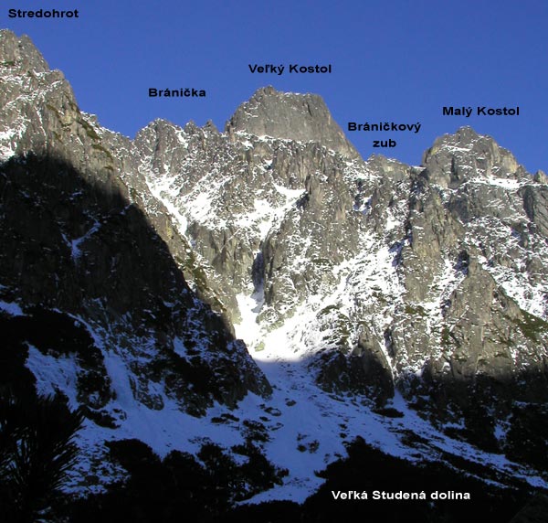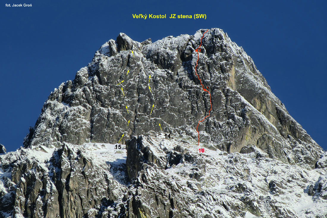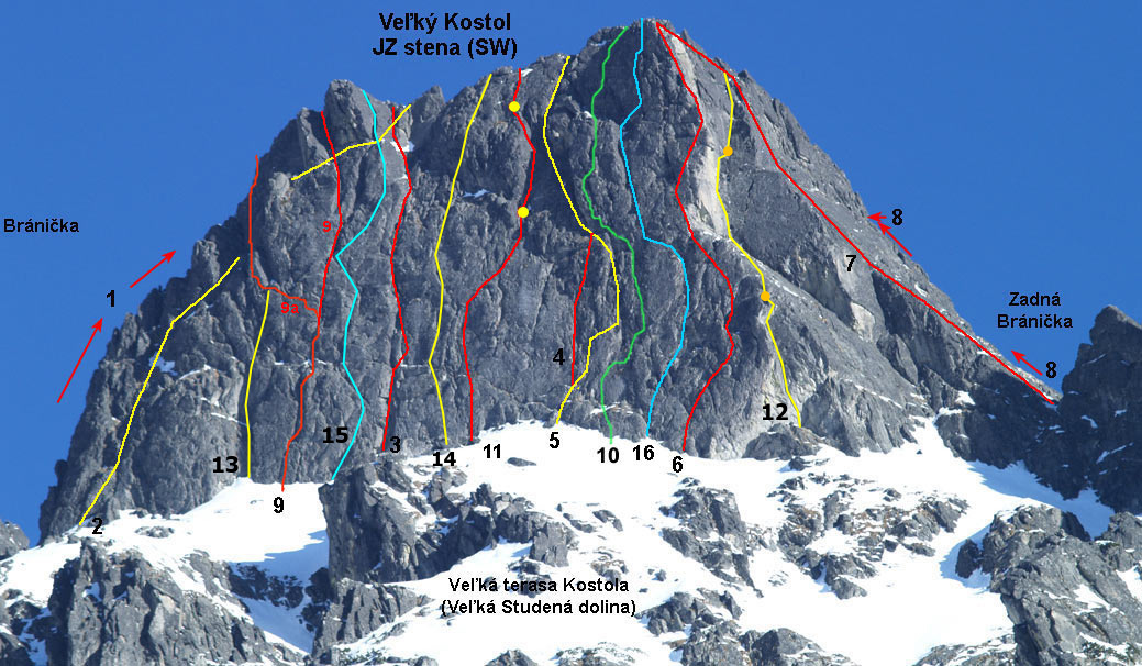 1. Priamo SZ hrebeňom (ll-lll) 1 h. A. Grosz, T. Kregczy, 30. 6. 1911 AP/III/111, zo štrbiny cez niekoľko veží. Vrcholový SZ - hrebeň obchádzame vľavo 2. Ľavou časťou (II) 20 min. M. Broske, vodca Hunsdorfer st., 6. 9. 1904 Ľavou časťou (nie vlastnou vrcholovou stenou) AP/115, K/1570 , z terasy po trávnatých svahoch šikmo doľava hore na strmú lávku na rebro. Ďalej žľabom na vodorovnú časť SZ hrebeňa a ním na vrchol.3. Prostriedkom steny (V) 2 h. I. Gálfy, J. Poliak, 13. 6. 1954 AP/118, stredom steny vidíme tiahnuť sa zárez. Začiatok vedie malým komí-nikom, ktorý sa hneď stráca. Asi po 10 m lezenia traverz doprava, potom asi 3 m hore a späť doľava do vhĺbenia. Vhĺbenie je jasne viditeľné. Ním až na hrebeň.4. Variant ľavou trhlinou (IV) R. Kynčl a druhovia, 18. 9. 1936 AP/117, ľavou trhlinou (komínom) 5. Birkenmajerova cesta (IV) 2,5 h. W. Birkenmajer, K. Kupczyk, 27. 7. 1930 1. zima: M. Rybanský, J. Wencziller, 22.IV. 1955 AP/116, štítový masív je zdanlivo úplne hladký, no v skutočnosti výborne členený. Doprava hore vedú tri rovnobežné trhliny. Spočiatku ľavou trhlinou, komínom, potom prechod do prostrednej a ňou niekoľko metrov na dobrý stupeň. Vyššie prechod do pravej trhliny a ňou na vrchol.6. Glowacz - Spath (IV+) G. Glowacz, K. Spath, v roku 1962 2. priestup : E. Bobačičová, V. Tatarka , 16. 11. 1978, (opis, schéma ) 7. Hrebeňom (IV) 1 h. J. Kučera, V. Roland, 23. 8. 1936 A P/III/113, zo štrbiny priamo hore ku komínu. Po jeho pravej časti na lávku. Rebrom, ktoré sa tiahne od hrebeňa. Ním na vrchol.8. Obidením hrebeňa (II) 20 min. H. Fobesch. 11. 7. 1902 1. zima: J. Pierzchalanka, J. Pierzchala, 8. 4. 1937 AP/112, zo štrbiny na SZ plytkým trávnatým žliabkom na strane Malej Studenej doliny. 9. Joe Crack (IV+) 2,5h. J. Koršala, M. Vargová, 1964 Variant 9a. Halny wiater (V) 2,5h. J. Groň, W. Filas, 24.9.2010 10. Groń - Kijowski (IV - V) 2,5h. J. Groń, K. Kijowski 01. 10. 2011 Cesta má 3 dĺžky, exponovaná v pevnej skale, stanovištia sú na dobrých miestach. Zostup zlanením po obídení hrebeňa cestou 8 (IV-V)11. Dzurilla - Smik ( V ) 2,5h. M. Dzurilla., E. Smik, 8. 11. 2011 Cesta má 3 dĺžky. V stene sme zanechali jednu postupovú skobu v prvej dĺžke a slučky na zlanenie,1 dĺžka: 55m,V, 2.dĺžka: 30m, V, 3.dĺžka: 20m, III. Nie veľmi kvalitná skala, veľa lišajníku.12. Santa Catarina ( VI, A2, RP VIII- ) M. Brecík, M. Kuniak, 1. 8. 2013 1RP: M. Brecík - in memoriam, M. Kuniak, T. Havlík, 16.10.2023 Spravili sme voľný RP prelez našej hákovačky na Veľký Kostol. Prvá dĺžka je za 8-, husto vyskobovaná (veľa pevných nových skôb), druhá a tretia ostali nezmenené s novými zlaňákmi v slučkách. Vrelo odporúčame! Popis od autorov: 1.8.13 sa nám s Mirom Brecikom podarilo preliezť líniu na Veľký Kostol. Ide o krátku cestu výrazným kútom na južnej strane, dolná časť je celkom výživná, prostredná platňa a horný kút sú veľmi pekné, bohaté na výhľady a dobre odistiteľné. Cesta ma tri dĺžky, zlaniť sa dá na dve. Lepšie je to liezť však na tri, cez previs sa drie lano. Chceli sme sa pokúsiť aj o voľný prelez, ale na on sight to bolo nad naše sily a pri zlanovaní sa nám (asi) uvoľnenou skalou seklo jedno lano. Nakoľko Mirec mal v ten den výročie a ide o cestu na Veľký Kostol, názov sme dali "Santa Catarina". Ja osobne som aj nejakých tých svätých vzýval, keď som zistil, že po mojom zlanení som stiahol na zem napoly roztrhnuté lano. Každopádne vsetko dobre dopadlo. Cesta čaká na voľný prelez, tipujem okolo 8-, zle odistených. PS: je možné že línia bola lezená skôr, hoci tažko povedať, v mieste prostredného zlaňáku sme našli jedinú skobu, starú možno 30 rokov. Kútom ide logická zlaňovacia trasa, inak v ceste nebol materiál. Urobili sme štandy a zlaňáky. V A2 miestach sú 2 dobré skoby, ostatné, chabé išli ľahko von. 13. Radova cesta (IV-V) 2,5h. Rado Lacko, Ľubo Kyrc, 6.6.2015 Popis od autorov:Dňa 6.6.2015 sme vyliezli novú cestu na Veľký kostol v JZ stene. Výstup vedie na ľavo 10 metrov od cesty Joe Crack. Cez široký komín okolo neleziteľného kúta, pri Bielom výlome je štand po 30-tich metroch. Ďalej vedie trhlinou a cez platňu ku veľkému bloku. Štand č.2. Odtiaľ ďalšou trhlinou v platni na hrebeň. 2-há dĺžka by mala vydať na 60 metrov. Zostup po hrebeni k dobrému bloku na zlaňák , sľučka, zlaňák 60metrov priamo pod stenu Veľkého kostola. Skala po oslobodení steny od pár lokrov pevná. 14. Radosne wspinanie (VI-) Jacek Groń , Jerzy Gurba 15.08.2017 Cesta má 3 dĺžky, pekná,exponovaná v pevnej skale, 1 dl. 15m VI-, 2 dl. 50m V, 3 dl. 35m IV. Materiál, malé a stredné vklínence a frendy.15. Wniebowstąpienie (VI) Jacek Groń , Jerzy Gurba 15.08.2017 Cesta má 3 dĺžky, pekná,exponovaná v pevnej skale, 1 dl. 50m V, 2 dl. 30m VI, 3 dl. 20m IV. Materiál, malé a stredné vklínence a frendy. 16. Wortgottes (OS VI) 3 hod. Daniel Pipien, Maciej Bogdan. 27.10.2019 1 dl. 50m V+, 2 dl. 30m VI, 3 dl. 20m V+. Opis: Z veľkého bloku pod stenou, mierne doprava do kútika idúceho kolmo hore. Kútikom (V-) vyššie(V +) na miesto, kde vľavo začína úzka polica so zhlukmi trávy. Policou traverz doľava asi 5 m. Prejdite k skosenému komíniku a asi ešte 2 m na pohodlný štand.Zo štandu ľahko hore a traverz do komínika (V). Komínik prechádza do cca 10m. kolmého kútika - kľúčové miesto cesty (VI).Do trhliny sa hodia frendy č.2 a 3.Platňa vľavo je mierne položená so stupňami na začiatku. Po prelezení trhliny a položenej platne nad ňou štand po ľavej strane. Odtiaľ je možné prejsť doľava šikmým kútikom niekoľko metrov do cesty Groń-Kijowski. My sme pokračovali vpravo na veľký blok ku komínu vedúcemu k vrcholu, Komín sme prekonali komínovou technikou (V+). Nad ním popukaná vrcholová stienka 