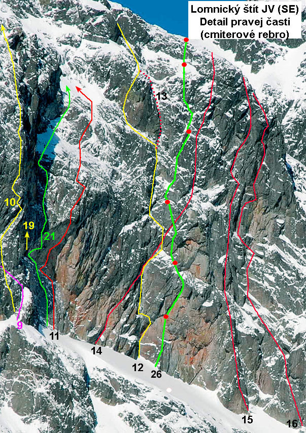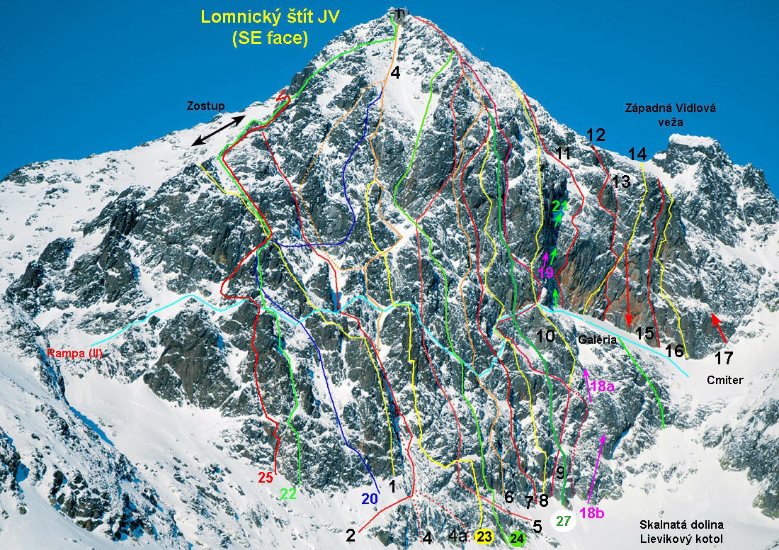 1. Ľavý piler (V) 8 hod. M. Kořínková,V. Šimánek, P. Hybner, L. Kořínek 8.7 a 29.8.1976 2. Cesta Komarnických (III) a variant V, M4, 6 hod.Gy. a R. Komarnicki 28. 6. 19102. výstup: R. Geisler, H. Kamptz 4. 8. 1935 Popis Puškáš: Ľavou polovicou k Matirkovmu návratu, cesta bratov Komarnickich. Z Lievikového kotla po širokých trávnatých pásoch zľava doprava nad spodný prah hlavnej rokliny. Ďalej s obídenim rokliny vpravo, cez ňu šikmo doprava a po jej pravej strane hore, strmé stienky, oddelené lávkami. Hneď spočiatku ťažko, traverz po trávnatej lávke doprava. Potom cez stupeň, hore ťažko, cez trávnatú plošinku. Nad ňou je nízka stienka so zlým výstupom na trávu, ťažko, živý rebrík. Ďalej doprava hore, potom doľava cez blok na trávnatý pás. Po ňom niekoľko metrov doľava, ďalej hore do výklenku za skaliskom odštiepeným od steny. Zo skaliska sa presunieme na stenu, potom hore na trávniček. Teraz zárezom a cez niekoľko stupňov, potom ďaľším krátkym zárezom ešte kúsok hore. Nad sebou vidíme svetlú, červenkastú škvrnu v stene jednej vežičky a nakoniec po trávnatej lávke doľava dolu na plošinu tesne nad zárezom rokliny. Nad nami rozdvojuje roklinu nápadná veža. Vpravo od vody 20 metrov po hladkých skalách hore, potom traverz doľava cez vodu a na protiľahlých červených skalách, nakoniec po rebre na d'alšiu plošinu v rokline tesne pod spomenutou vežou. Pravou vetvou na strmo doprava vedúcu lávku, ktorá na konci prechádza v trhlinu. Trhlinou kúsok hore, potom trávnatou lávkou doľava smerom k rokline. Nato šikmo doprava hore pod 2,5 metrovú hladkú stienku. Touto alebo priamo, živý rebrík, alebo vľavo okolo nej, pod stienkou vľavo do rokliny, potom po vodou ohladených skalách šikmo doprava hore. Hladké skaly nás dovedú hore do snehového kotla. Nad ním čnie už spomínaná veľká veža. Na rebro vpravo od veže, potom znova doprava po trávnatej lávke, ktorá sa na konci láme. Niekoľko metrov pred koncom doľava a hore na trávnik. Nad ním sa pnie 2 metre vypuklá stienka. Cez stienku a po trávnatej lávke kúsok doprava, do krátkeho, ťažkého zárezu. Zárezom hore. Potom doľava, a tak celkom blízko k žľabu medzi spomenutou vežou vľavo a rebrom, po ktorom sme už išli vpravo. Žľab ústi hore do štrbiny v chrbte, ktorý sa tiahne zhora a ktorého najnižším stupňom je naša veža. Po trávnatých lávkach vpravo od žľabu, až k záseku v chrbte, asi 10 metrov vpravo nad štrbinou. Preklenutý je veľkým balvanom, pod ktorým sa pretiahneme na druhú stranu. Tu opúšťame východnú stenu. Chrbát sa rozširuje a ľahko nás dovedie na normálnu cestu, kúsok pod Matirkov návrat. Prachový variant - V, M4. - ide o variant viacerých ciest. Štěpán a Petr Reschovi cca 7 hod. „Prachový variant“ název variantu, jako vzpomínka na děsivé podmínky absolutně nedržícího nového sněhu ve stěně, které jsme měly. Vedení cesty viz nákres ve fotografii. Záměrně jsme postupovali velmi logickým směrem tou spodní částí k napojení do „Komarnických“, vršek už tak nějak vyšel náhodně vzhledem k tomu, že jsme prchali z dřiny v metru prašanu, ale vlastně je to docela hezké lezení. Podrobnější popis: 1.délka (25 m): jako cesta „Ženy 2011“ komínem u ocelových lan a převískem na polici pod světlou spárou (M4) 2. délka (25 m): po polici 2 metry doleva a stěnou a krásným sokolíkem do lehčího terénu a koutem na štand (V) 3.-5. délka: asi 130 metrů sněhovými poli a žlaby, v závěru skalním pilířkem (II) do spojení s Cestou Komarnických Tou asi 100 metrů a poté přímo mezi skalami a lehkými plotnami (II) do míst, kde Cesta Komarnických obchází zleva skalní práh v závěru JV stěny3. Pilier "Variant Ľavého piliera" (V) 8 hod. Čapek - Kello - Svatek 27.9.1980 Materiál: 7 skôb, vklínence 4. Motykova cesta (IV) 3hod. S. Motyka, J. Sawicki 13. 7. 1932 1. zima: J. Psotka, Z. Zibrín 18.-19. 3. 1956 2. zima: A. Mrkos s priateľkou 2. 4. 1956 Typický zimný výstup na snehu a ľade. Za priaznivých podmienok veľmi pekná zimná cesta s malým množstvom skalných úsekov. Zimný čas asi 10 hod. Pozri aj fototopo steny (A/Zero) - čiarkovaná línia ľadové varianty: Ciesielski-Rokowski, 29.12.2009 Spodná časť priamo roklinou (jedno miesto V,III), - len variant 2,5 hod. W. Birkenmajer, K. Kupczyk 17.6.1930 Výstup priamo roklinou - V spodnej časti tri komíniky. V lete zvykne tiecť roklinou voda. Lezieme ľavým alebo prostredným komínikom, ďalej ľavým 4 metre(V) cez previs. 20 m hore na prvý prah. Ďalej hore čiastočne sprava. Variant končí na druhom prahu pri rozdvojení Komarnického a Motykovej cesty. 4a. Nástupový variant sprava (III-IV) Vedie cez prerušované stienky šikmo sprava doľava do žľabu nad prvým ľadopádom. Praktické pri zlom stave prvého ľadopádu. Popis Motykovej cesty: Nástup buď ako cesta Komarnických, alebo vyššie spomínané varianty po druhý prah, kde cesta Komarnických odbočuje doľava. Odtiaľ po svetlých platniach v pravej časti hlavnej rokliny prerušenej mierne previsnutými komínikmi. Z komplexu plošín zasypaných kamením mierne doľava. Sprava od nás ostáva krátka roklinka smerom na hranu rebra za štíhlou vežičkou. Nepravidelným bielym žľabom trochu doľava na trávnatú plošinu. Z nej po trávnatom páse šikmo doprava a ďalej priamo hore skalnatými stupňami pod previsnuté mokré platne. Obchádzame ich nepravidelným žľabom vľavo v smere kupolovitej vežičky. Nejdeme až k nej, ale priamo hore výrazným dole previsnutým komínom 6 metrov. Vyššie v ňom cez 15 m. vlhkú platňu, potom na ľavé rebro komína, cez prehnutú platňu doprava na trávu nad komínom. Odtiaľ po trávnatých lávkach a platniach do vhĺbenia nad bielymi platňami. Z vhĺbenia výraznou roklinou pod lanovkou na vr