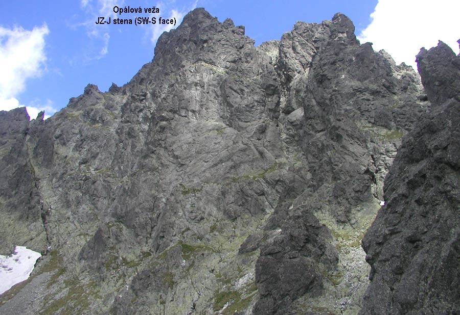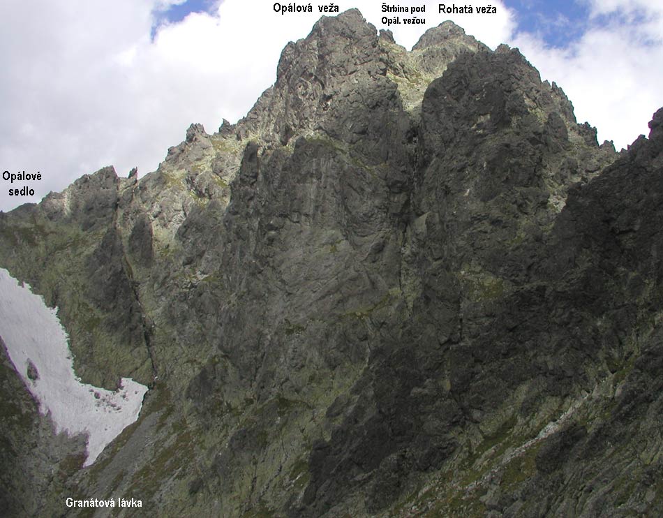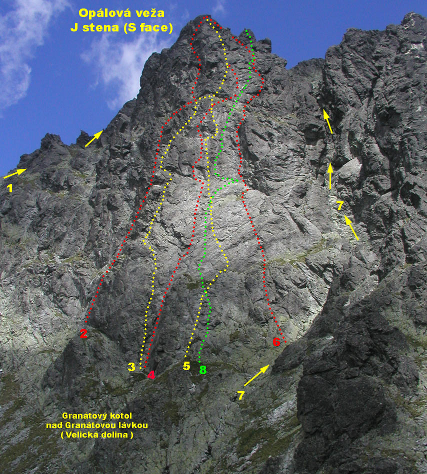 1. Ľavé rebro (IV) 1h. H. Caureová, G. Cauer, E. Probstová, D. Reichart, 6.7.1932 Výstup skutočnený naraz spolu s cestou Pravé rebro Opálovej steny. Zima: J. Honowski, Cz. Mrowiec, 25.4.1956, kombinovaná skalno snehová túra. Z Opálového sedla vľavo, najprv platňami a vežičkou k prvému strmému výšvihu. Tu vľavo od hrany cez platňu, hore k hrane a za ňou 4m dole do štrbiny. Rebro sa tu veľmi strmo dvíha k Z hrbu Opálovej veže. Vľavo od hrany roklinou do štrbiny medzi týmto hrbom a najvyšším hrbom. Odtiaľ trochu vpravo a potom oblúkom nazad na hranu a na JZ vrchol veže.2. Prostriedkom (miestami VI "A" ) 3h. I. Gálfy, I. Urbanovič, 11.10.1960 Prostriedkom steny. V prostriedku západne orientovanej steny je výrazná vežička. Od tejto doprava v spádnici nástupu sú dve problematické stienky, prerušené trávnatou rampou. Prvú stienku z trávnatej terasy obchádzame zprava asi po 4 metroch, cez previsnutú hranu doprava a priamo hore na spomenutú trávnatú rampu. Niekoľko metrov doľava a vstupujeme do druhej stienky, ktorou asi 8 metrov po skobách (zlé možnosti skobovania) sa dostaneme do vhĺbenia. Priamo nad ním je výrazný komín, ktorý sa začína malým previsom a nad ním je hneď druhý. Sme na ľahšom teréne, ním asi 30 metrov, až sa dostaneme do kúta, z ktorého vychádza komín. Tento sa v hornej časti skrúca doľava. Nad komínom je mohutná strecha, popod ktorú traverzom doľava. Po dĺžke lana, mierne doľava komínikom neskoršie na hranu a napokon žliabkom na hrebeň, kde sa výstup končí. Dve dĺžky lana hrebeňom na vrchol.3. J pilier (IV, miesto V) 1,5h. I. Gálfy, I. Urbanovič, 11.10.1960 Južným pilierom steny.(4,5 dĺžky) V nástupovej časti piliera je v jeho pravej časti výrazný komín -výrazné vhĺbenie, smerujúci zprava doľava. Priamo kútom z nástupu vedie Tatarková cesta do platní. Obe cesty majú spoločný nástup. Spomínaným komínom-vhĺbením až na malú plošinku v pilieri, cca 55 M (nit). Pred nami je previsnutá machová stena piliera, ktorú obchádzame mierne zprava. Z plošinky stanovišťa asi meter doprava a hore vhĺbením asi 15m smerom pod biely previs. Zprava okolo previsu ťažšou kolmou stienkou (dve staré skoby, najťažšie miesto V.) Ďalej vhlbením a s odklonom doľava pod ďalší previs, ktorý tesne pod ním obliezame zľava. Niekoľko metrov nad ním stanovište (nit). Odtiaľ ľahko do žliabku doprava a hore , neskoršie niekoľko metrov zprava od hrany na hornú trávnatú terasu, ktorá pretína celú stenu aj pilier (nit vpravo v stene nad trávnikom). Od terasy (nitu) priamo hore, pred nami viditeľný zárez z dobrými odštepmi, ním hore, a potom asi ešte 90m plochým ľahším vhĺbením v pilieri na vrchol. Najvyhľadávanejšia cesta v stene. Preistené V. Tatarkom (nity /po jednom na stanovišti/ a temovaná skoba) pribl. v roku 2000.4. Platňami (V) 3h. Bobačičová - V. Tatarka, 12.10.1979 5. Biely pás (V, miesto VI) 4h. F. Bauer, P. Jandík, 26.10.1980 6. Kútom (V) 3h Bobačičová - V. Tatarka, 12.10.19797. Štrbina pod Opálovou vežou - Komín - (IV-V) 3h J. Mešter, Š. Porubän, 3.8. 1949 Zima: V. Sláma, F. Veigl, 28.4.1955, Stredná časť je skalno ľadová, ostatné na snehu. Cesta vedie markantným komínom, ktorý zprava ohraničuje J stenu Opálovej veže. Z Granátovej lávky pod stenou najprv žlabovitým vhĺbením v dolnej tretine komína. V druhej tretine sa komín zužuje, v tretej sa znovu značne rozširuje a prechádza do pozvoľnej sutiny. Touto na na štrbinu pod Opálovou stenou (medzi Opálovou a Rohatou vežou)8. Francouzský polibek (VII-) 2h. R. Lienerth, S. Kalášek, L. Petráš 25. 9. 2011 Cestou je možné zlaniť.