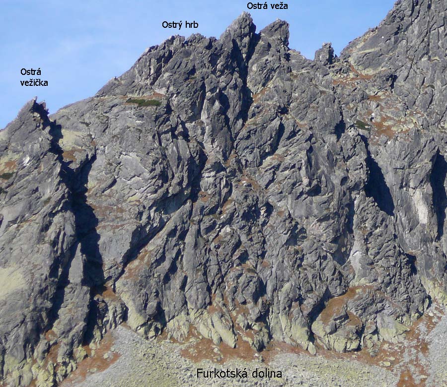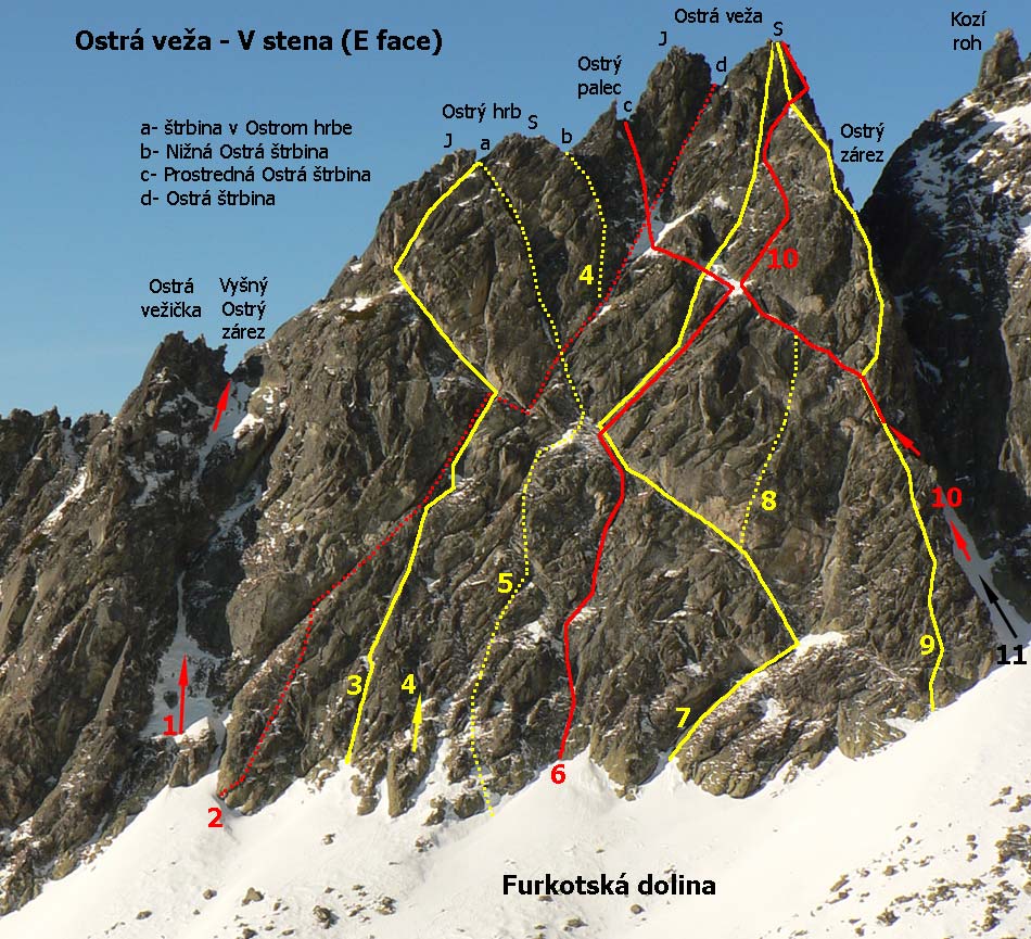 1.Vyšný Ostrý zárez (II-III) 1h. I. Matušík, V. Tatarka, 1.4.1967 skalnosnehový žľab s prahmi.2. Ostrá štrbina priečne stenou. (IV-V) 2h. J. Ivan, J. Jackovič, J. Kačaliak,P. Kuzmík, M. Rusnák,I. Urbanovič,J. Weincziller, 15.6.1968. Zima:I. Urbanovič a druh. Priečne stenami Ostrého hrbu a J vrcholu Ostrej veže, na Ostrú štrbinu. Masív Ostrej veže pretína markantný šikmý zárez, ktorý sa začína kúsok nad sutinou vpravo od spádnice Vyšného Ostrého zárezu a ústi na Ostrej štrbine medzi J a S vrcholom Ostrej veže. Nástup do zárezu je v komíniku kúsok vpravo od spádnice Vyšného Ostrého zárezu. Cez komínik po jemných stupňoch na hranu lávky a cez ňu do spomínaného šikmého zárezu. Zárezom hore asi 3 dĺžky lana. Odtiaľ trávnatou lávkou doprava a dolu, kosodrevina a odtiaľ šikmo ďalej doprava exponovaným traverzom po trávnatých stupňoch. Znova šikmo doprava a potom cez skalné stupne znova do zárezu a ním na Ostrú štrbinu medzi J a S vrchol Ostrej veže. Lámavá skala, mnoho trávy. Zima: Pre rozlámanosť terénu a množstvo trávy v lete, je výstup ideálny v zime. Miestami dostatočné množstvo snehu. Info AP-IX/67, VT.69/13. Andráši - Virost (IV-V) 3h. Július Andráši I, Š. Virost, 2.8.1948. Výstup celkom ľavou časťou steny na J hrebeň, na J vrchol Ostrého hrbu. Nástup do steny je v mieste, kde sutinovisko najvyššie zasahuje pod stenu, kúsok vpravo od spádnice žlabovitého zárezu, ktorý spadá z Vyšného Ostrého zárezu. Po ľavej strane malého komínika hore na trávnatú lávku. Tu ústi zdola dobre viditeľný, šikmo vpravo hore sa tiahnúci charakteristický tenký zárez, ktorý sa končí pri veľkom bielom odštepe. Zárezom hore po pravej strane na rebro a po ňom priamo pod biely odštep. Odtiaľ traverz vľavo do zárezu a ním hore na malú trávnatú lávku, exponované, nedostatok záchytov, odporúčajú sa dlhé skoby. Z lávky ďalej šikmo vpravo hore zárezom. Odtiaľ dalej až pod žltú stenu, dobre viditeľnú už zdola,k ostrému balvanu. Odtiaľ traverz šikmo hore pod žltú stenu a ďalej po drobivej skale a úzkej lávke na veľkú trávnatú kazateľnicu. Odtiaľ možno ľahko vytraverzovať na južný hrebeň. Z kazateľnice priamo hore na malý výklenok, nad ktorým je previsnutý balvan. Ďalej veľmi ťažko hore, pomocou živého rebríka na ďalšiu lávku, štyri metre. Po lávke hore, krajne ťažko, exponované a ďalej šikmo vpravo hore do zárezu a na hrebeň, ktorý dosiahneme cez zaklinený balvan. Ďalej po južnom hrebeni na vrchol. Dve miesta V. 4. Nižná Ostrá štrbina (IV) 4h. Július Andráši I, Š. Virost, 6.8.1950. Východná stena, pilierom?, ale isto na Nižnú Ostrú štrbinu. - Bez bližšieho opisu. AP-IX/63 5. Poľská cesta (IV) 2,5h. W.Betlejewski, R. Duchniewiczová, K. Lerch, 18.6.1969. Poľský výstup na štrbinu v Ostrom hrbe, v ľavej časti masívu Ostrej veže. - Výstup vedie stále v ľavej časti steny, ale v dolnej časti vpravo od šikmého zárezu, ktorý priečne pretína stenu zľava doprava a vyúsťuje na Ostrej štrbine medzi vrcholmi Ostrej veže. V dolnej časti vychádza na zárez, kúsok ide po ňom a príde na dolnú lávku, ktorá pretína stenu sprava doľava. V poslednom úseku vychádza na Štrbinu v Prostrednom hrbe, ktorá leží v južnom hrebeni Ostrej veže. - Vstup do steny je vpravo od zošikmeného zárezu, kúsok vľavo od plošinky s malou kosodrevinou. Vystupujeme priamo skalnato-trávnatým žľabom, ktorý vyššie prechádza v zárez. Ním mierne vpravo cez malý previs na skalno-trávnatý balkónik so skalným blokom, ktorý je asi deväť metrov nad spomínanou kosodrevinou, II. Nad nami je z pravej strany rebierko. Presunieme sa cezeň s pomocou skoby, potom znova naň vystúpime po exponovaných stupňoch na jeho vrchol. V mieste, kde rebierko zaniká v previsnutej časti, vpravo šikmo niekoľko metrov a ďalej vodorovným traverzom v otvorenej stene asi 15 metrov do trávnato-skalnatého žľabu, ktorým priamo hore na výhodnú trávnatú plošinu. Od balkónika asi štyridsať metrov, IV. Ďalej ľahkým trávnatým terénom na lávke asi 30 metrov šikmo vľavo do ústia úzkeho trávnato-skalnatého žliabku, ktorý prechádza vyššie v úzky komín. Zárezom priamo hore pod previs. Pod previsom 2 metre šikmo doprava na dobrý stupeň a z neho cez previs a znova späť do zárezu, IV. Ďalej cez stupne pod ústie spomínaného komína, ním hore vyše 40 metrov, IV, na sedielko, ktoré zatarasuje blok a vytvára skalné okno viditeľné i z doliny. Sme na Prostrednej Ostrej štrbine. Odtiaľ doprava na južný vrchol Ostrej veže. Pevná skala, veľmi exponovaný výstup.Info:TT-1970/16. Mlezáková cesta (V) 5h. J. Mlezák,R. Torn, 21.4.1954 Leto: A. Bohosiewicz, W. Lipiňski, 24.7.1971 Mlezákova cesta. Pod dolnou lávkou, ktorá pretína stenu sprava-doľava a ústi na južný hrebeň pod južný vrchol Ostrého hrbu, nachádza sa pod jej prostriedkom vhĺbenie ústiace na lávku. V predĺžení vhĺbenia viac-menej v spádnici možno sa dostať na Ostrú Štrbinu medzi dva vrcholy Ostrej veže. Výstup vedie spočiatku spomínaným vhĺbením až na spodnú lávku. Po nej kúsok doľava a hneď hore zárezom v spádnici Ostrej štrbiny, na hornú lávku. Po nej vľavo pod vrcholovou stenou južného vrcholu Ostrej veže, na Prostrednú Ostrú štrbinu. Po ľavej strane zostáva Ostrý palec. Lezené len v zimnom období, použili asi 20 skôb. Letný priestup sa zväčša zhoduje s výstupom Mlezáka, ibaže Mlezák pod vrcholovou stienkou J vrcholu Ostrej veže z hornej lávky smeruje vľavo na J hrebeň, na Prostrednú Ostrú štrbinu. Výstup poľských horolezcov z hornej lávky smeruje doprava na Ostrú štrbinu medzi vrcholmi Ostrej veže ako cesta č.2 z roku 1968. Poľský výstup môže mať minimálne odchýlky od zimného výstupu Mlezáka a Torna, exponovaný v