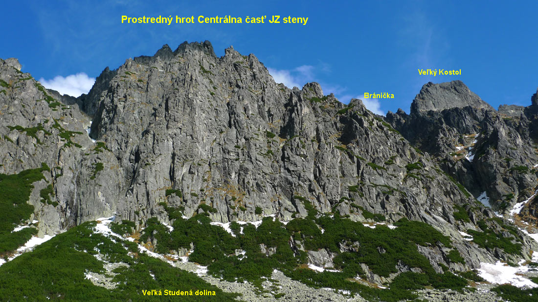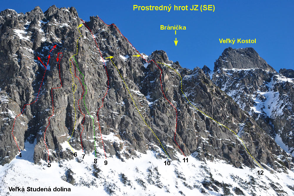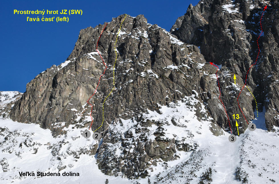 1. Kútom (V, 75st.) 2h. V. Zboja, R. Novotný, 29 – 30. 12. 1980 1.leto: P. Jackovič, P. Hadzima, 12. 4.1989, letný čas 2 hod.2. Cez platňu (V-, A0, OS:V) 2,5h. J. Osif, F. Jaroš, S. Šafář, J. Gereg, V. Barva, 5 a 13. 7. 1974 1.zima: Z. Drlík, M. Pelc, Š. Estočko – 12.1977 2.zima: L. Králiček, P. Barabáš, 12.1980 3.zima a OS: P. Jackovič, I. Verner, 2. 2. 1989 (OS V.) 3. Stokom vody (IV, ľad 75 - 90st.) Ľ.Fábry ("Gazda"), J. Michalko, feb.1981 6 m ľad 90 st. potom ľad 75 st.4. Žľabom (V,A1 OS V+ Var.M8- ) 9h. L. Králiček, J. Lučenič 20 a 28. 2. 1981 Pozn.: možno lezené už skôr 1.sólo a OS : P. Jackovič – 21.10. 1990 ( OS V+.) Variant -ľadovými prahmi vpravo- Ľ. Fábry, Š. Bednár, 13.1.1988, V+, ľad 70st. 6 hod. Nástup ľadom napravo od pôvodnej cesty na jej 1. stanovište. Druhá dĺžka je spoločná. Ďalej vpravo od pôvodnej cesty cez 3 ľadové prahy (do 70st.), nad nimi vľavo obchádzame previsnutý prah do žľabu. Ním cez 2 ľadové prahy (do 50st) a strmý sneh hore na pôvodnú cestu. Pozri fototopo pri ceste. Variant Žľabom Direct (zimné 8-, OS) celé 6,5h. Przemek Cholewa, Jakub Radziejowski, 28. 2. 2018 Dve dĺžky od nástupu priamo žľabom o ťažkosti zimné 8-, ďalej priamo žľabom. Fototopo variantu:5. Ľavý pilier - Poustevnická (IV+ A1, RP V) 4h. Z. Drlík, 4. 6. 1974 2.leto: M. Pelc, M. Neuman, leto 1975 3.leto: M. Kořínková,L. Kořínek, 2. 8. 1975 4.leto: S.Lacko, L. Králiček, 30. 4. 1976 1.zima: A. Ferancová, J. Stejskal, 14. 1. 1975 1.RP: P. Jackovič, M. Pšenek, 9. 1986 (V) Cestou je možné po starých stanovištiach zlaniť. 6. Kosovkové rondo (V-) 4h. A. Ferancová, L. Páleníček, 21. 9. 1973 2.leto: V. Tatarka, M. Lexa, 4. 6. 1975, s variantou cez žltý previs, A0 3.leto: S. Lacko, J. Milo, L. Králiček, 17. 4.1976 4.leto: Š. Karpišková, J. Osif, 3. 8.1977 1.zima: M. Kořínková, L. Kořínek, V. Rathouský, 16. 2. 1977 2.zima: L. Kyrc, Šoltés, 1986 Narovnávajúci variant :M. Pelc, M. Neuman 1RP cez previs : M. Komora, M. Medvec, VI+, leto 20097. Tatarka – Gibas (V-,A1 OS: VI) V. Tatarka, Ľ. Gibas, 2. 5. 1976 1.OS : P. Jackovič, I. Verner, 18. 5. 19898. Vánoční (V-,A1 RP: VII-) 8h. Z. Drlík, P. Mačák, 23. 12. 1973 1.leto: S. Lacko, L. Králiček, 2. 5. 1976 2.leto: M. Kořínková, L. Kořínek, 26. 5. 1979 1.RP : M. Komora, J. Milčák9. Stredom steny (V, A1 RP: V+, hore III) 8h. V. Černý, I. Urbanovič, 4. 4. 1965 1 sólo a RP: P. Jackovič, V+, 27. 10. 1988 Stredom spodnej časti JZ steny sa tiahne dosť výrazné vhĺbenie, ktorým vedie výstup. Najprv cez terasu s kosodrevinou na trávnaté stupne a ďalej do výrazného komínika. Ním až do miesta, odkiaľ sa 2 metrovým traverzom dostaneme do hladkej stienky, ktorou hore (najťažšie miesto). Ďalej zárezom a napokon mierne vľavo na trávnatú policu, ktorá sa stáča doprava. Zľava do previsnutého kútového zárezu, po dĺžke lana sa dostaneme na ľahší terén, odkiaľ rozlámaným žliabkom šikmo doľava do malého sedielka. Šikmým zárezom hore ku skobe, zlanenie 10 metrov do žľabu, ktorým pokračujeme do rozlámanej štrbiny. Ostrý hrebeň obchádzame sprava a po niekoľkých dĺžkach lana sa dostaneme na terasu, za ktorou je strmý žľab. Doprava na hrebeň rebra a ľahkým terénom na vrchol.10.Pilierom (V+) V. Tatarka, J. Michalko, jún 1988 Topo neexistuje, 12 dĺžok na vrchol piliera, ďalšie podrobnosti nie sú známe, na fotografii je zakreslený približný smer výstupu. 11.Kamzíčie hniezda (IV+) 3h. A. Ferancová, L. Páleníček, 3. 3. 1975 1.leto: S. Lacko, L. Rozsíval, 4. 1976 2.leto: J. Milo, L. Králiček, 8. 5. 1976 3.leto: S. Borák, M. Milo – 18. 8.1976 2.zima: M. Dorociak, L. Kořínek – 19. 2. 1982 3.zima: L. Kyrc, zima 1986 12.Tatarka – Michalko ( IV+, 75st.) V. Tatarka, J. Michalko, 3. 1. 1981 Roklinou cez ľadové prahy do 75 st. 13.Ľavý pilier (VI+) T. Cuták, T. Kotrady, 17. 7. 2015 Popis autorov:Už dlhšiu dobu sme mali v plánu spraviť novú líniu v juhozápadnej stene Prostredného hrotu. Konkrétne jeho ľavý pilier. Jedná sa o nádherné lezenie v pevnej, kompaktnej skale, ktorá ponúka rôzné možnosti zábavy od platní až po nádherného sokolíka. Nástup je medzi stokom vody a žľabom, v jeho najnižšom mieste. Prvá dľžka je v znamení takého rajbasového lezenia až po malú poličku s kosodrevinou. Tam sa pokračuje druhou dľžkou a nástupom do platne, ktorou lezieme diagonálne smerom doprava k malému kútiku, ktorý vedie až ku kosodrevine medzi prevismi. Odtiaľ systémom skala a kosodrevina až na ich koniec. Pokračuje sa kolmou stenou až pod kút, kde sa da pekne zaštandovať. Potom kútom hore pod previs, ním priamo hore a tam začína nádherný asi 10 m sokolík v trošku položenej a úplne hladkej platni. Celý sokolík je zakončený ďalším previsom, ním hore na štand. Posledná dĺžka vedie hore komínom, kde sa cesta pilierom končí. Po dolezení sme sa zhodli na obťažnosti 6+UIAA.14.VŮNĚ JEHLIČÍ (M6) Pavel Bohuněk, Jan Škarohlíd, 12.12.2015 Pravdepodobne lezené aj skôr.Popis od autorov: Pod nástup cesty je nejlepší natraverzovat zprava (od cesty č.3). Nástup je položeným koutem vlevo od nevýrazného pilíře. Dále systémem spárek do výrazného kouta vpravo. Z něj traverz vlevo do hladkého kouta (skoba, klíčové místo). Jím nahoru pod kosodřevinu. Vpravo přes kosodřevinu lehkým terénem na začátek žlabu (vlevo od výrazné žluté plotny). Tímto žlabem dvě délky do místa, kde se žlab rozšiřuje (kosodřevina). Dále při pravé straně nahoru pod vrcholovou stěnku. Zde odbočíme vpravo na hřeben. Obtížnost první délky odhaduji na M6 (vylezeno OS). Klíčová je poslední třetina délky. Je to velice špatně zajistitelné a místy lámavé.