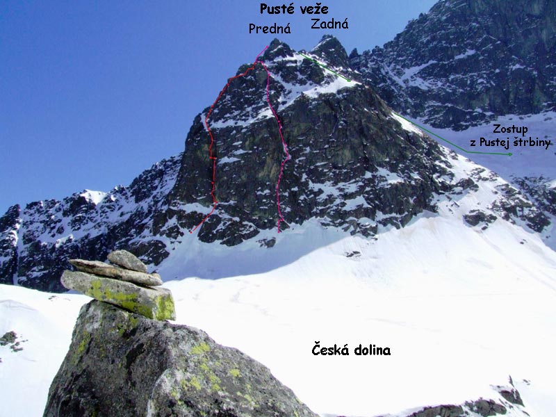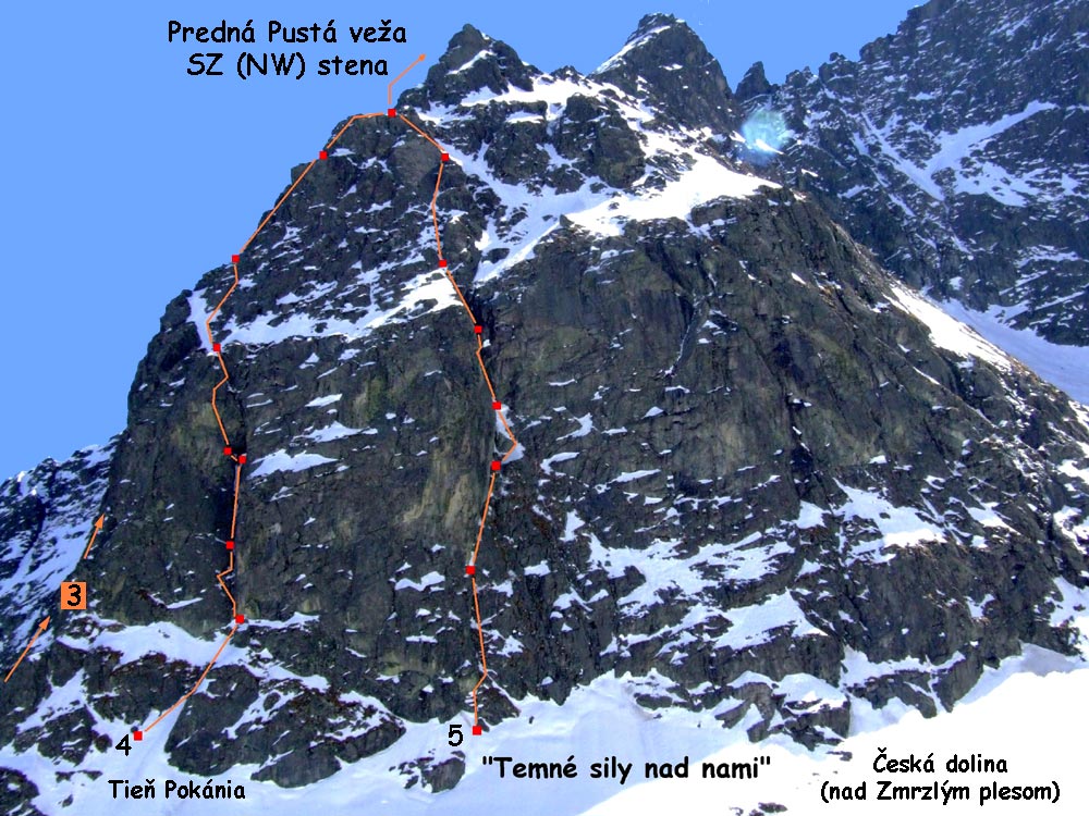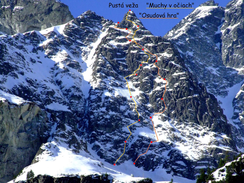 1. Zadná Pustá veža-Depresia (V) 3h. Z. Abgarowicz, R. W, Schramm, 23. 8. 1947 Zima: E. Bohmova, I. Jakubcová 7.3.1992 (možno lezené i skôr) Zadná Pustá veža, Ľavou častou steny.Vstup do steny je jej ľavej časti pri veľkom temnom vhĺbení. Ďalej z ľavej alebo z pravej strany na jasnú skalnú bulu, kazateľňu, potom jej hranou na dno spomenutého vhĺbenia. Odtiaľ kúsok vľavo rozčlenenými hrdzavými skalami 25m pod čierny, vlhký, machom zarastaný strmý prah. Spod prahu (III) traverz vpravo, potom hore šikmo vpravo trávnato-skalnou lávkou,veľmi exponovaným zárezom a stupňami na dno strmého,zárezu kúsok vpravo od vhĺbenia.Ďalej - alebo:(IV) Dnom zárezu 30 m. hore do miesta, kde zárez prechádza v previsnutý komín. Ďalej komínom hore, neobyčajne ťažko, na zaklinený kameň pod strechou veľkého previsu, ktorá uzatvára komín. Odtiaľ traverz vľavo pod zobákom previsu, (V), a traverz vľavo hore na začiatok nasledujúceho skalnato-trávnatého zárezu. - Alebo, (V), traverz šikmo vľavo cez strmé trávnaté stupne a ďalej hore cez previsnute červené platňovité skalky na začiatok nasledujúceho skalnato-trávnatého zárezu. Zárezom hore, spočiatku III, ďalej ľahšie pod strmý hrdzavo sfarbený prah. Nad prahom sa zárez zužuje a je previsnutý. Preto traverzujeme na hranu doľava, ktorá oddeľuje zárez od vlastného vhĺbenia. Pravou stranou hrany hore strmými trávami a skalnými stupňami, na konci vpravo na hrebeň, ktorým kúsok vpravo, na juhozápad, na vrchol Zadnej Pustej veže. Velmi lámavá skala, istenie iluzórne. Vhodné skôr na zimu.2. Osudová hra (M4+, A0) 8h. J. Svrček, V. Jakubec, M. Styk, 2.3.1997 3. Pilier (IV, miesto V) 1,5h. M. Grochowski,M. Jurewicz, S. Kierski, 3.9.1965 K. Grajewski, R. Kowalewski, B. Piatovska 10.9.1965 -nový variant po ľavej strane ostria Predná Pustá veža, pilierom. — Exponovaný výstup sa začína v mieste, kde severozápadný pilier vchádza nižšie, t. j. z najvyššie položeného sedielka v rebre, ktoré prechádza nižšie v prahy nad Zmrzlým plesom. Kúsok doprava, ľahko, depresiou, v spádnici výrazného komína, hore uzatvoreného prevismi, až na trávnatý pás, ktorý beží vľavo na ostrie piliera. Odtiaľ vpravo od ostria hore, na výrazný stupeň s blokom. Alebo po ľavej strane ostria, vyššie malou komínovitou depresiou, na výrazný stupeň s blokom. Odtiaľ krok vpravo do výrazného kominovitéj pukliny, ktorá vyššie prechádza v rínu. Ďalej už ľahšie po rebre cez niekoľko výšvihov na ešte dosť vzdialený vrchol. 4. Tieň Pokánia (M6,A0) 9h.J.Svrček, V. Jakubec, 13.3.20075. Temné sily nad nami (M7-) 9h. J. Svrček, V. Jakubec, M. Styk, 13.3.19996. Muchy v očiach (M5) 7h. Ika + Vilo Jakubcovi, 28.2.2011.