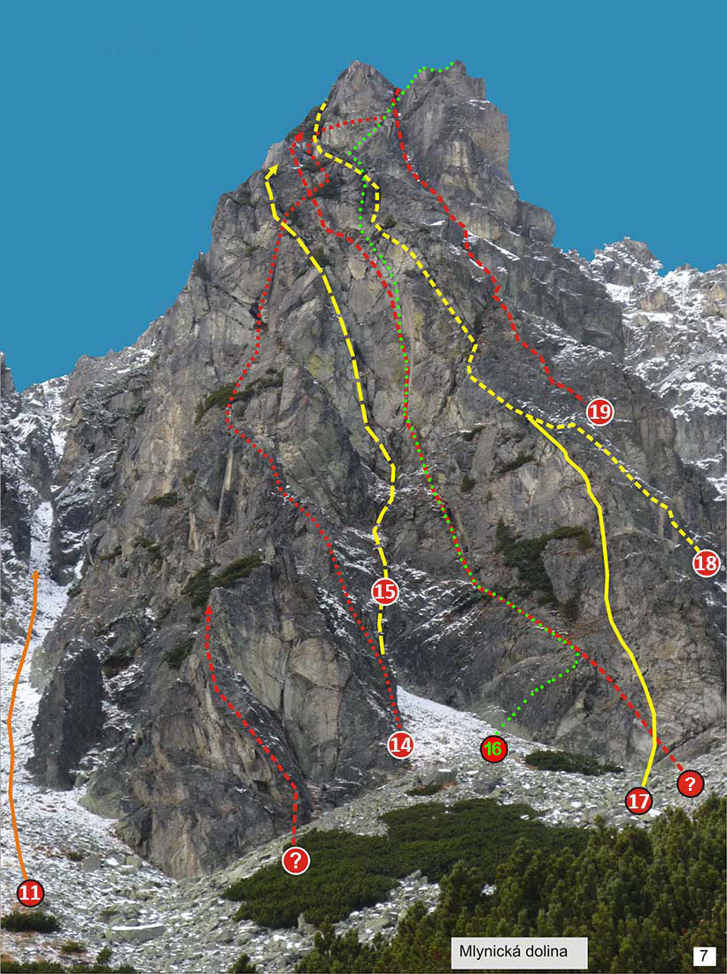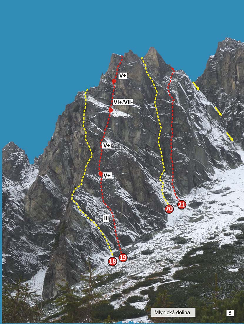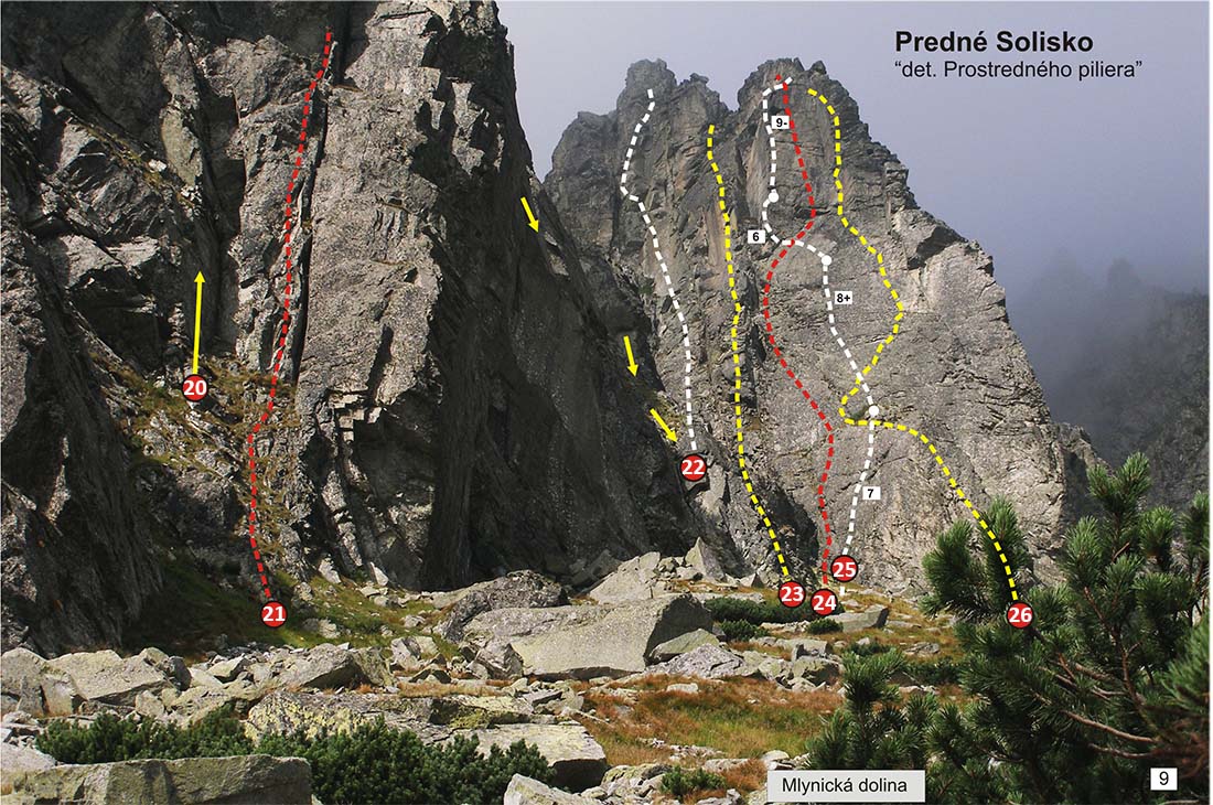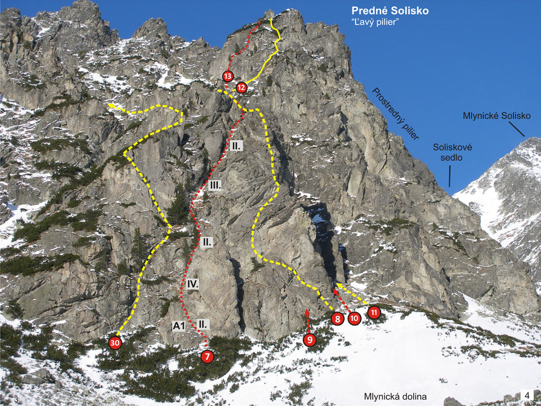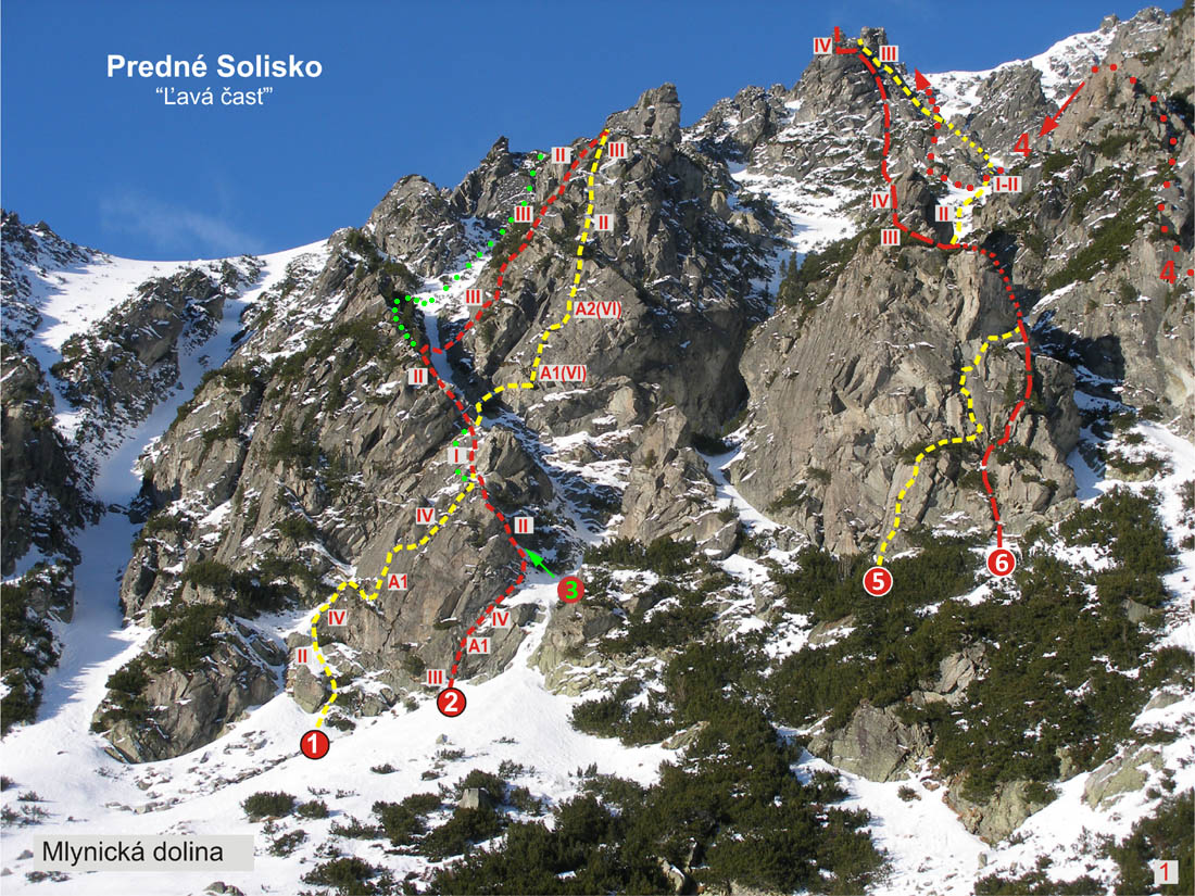 1. Ľavá časť A.+ M. Pronobis (IV,A1,A2) Andrzej a Marek Pronobis, 19.V.2007, cca 150m.2. A.+M. Pronobis-Rasolzadeh (IV,A1) Andrzej, Marek Pronobis, Babak Rasolzadeh, 13.III..2007, cca 150m.3. Cesta cez okno M4+ 4,5h. V.Masny, P.Piroha, 27.01.2018 Cesta je viac menej variantom cesty č.24. Suplement (M5, A1) Andrzej a Marek Pronobis, 28.12.2015 M5, 4 miesta A1, 7 dĺžok á 45m, cca 250m, pekná zimná cesta. Pozri aj fototopo pri ceste č.35. Diagonála Bastionu (IV,A1) Marek Pronobis, 17.V.20096. Pilier Bastionu (IV) Marek Pronobis, 21.IV.2008 na vrchol Bastionu a 28.VI.2008 celé. 7. Projekt 60 (IV.A1) 3h. Marek Pronobis, 27.VII.2007 Táto cesta má ďalšie 4 dĺžky po hrebeni klasifikácie IV.8. Hložka, P.Trnka, (V) 2h. Hložka, P.Trnka, 1.VIII.1987 9. Znak Zorro (IV,A2) 6h. Marek Pronobis, 23.VIII.2008 – dolná časť a 27.IX.2008 – celé.10. Projekt 61 (IV,A2) 4h. Marek Pronobis – 07.VIII.200811. Žľabom (CH) 1,5 h O.Chudý, L.Janiga, 5.1.1984 len za zimných podmienok na čistom snehu. AP/IX/8112.Prostredné rebro J (V,A0) 3h. M.Pronobis, 19.VII.2006 cca 150m13.Kaskada zaciec (IV,A1) 6h. Andrzej a Marek Pronobis, 2.VIII.2007 7 dlžok Pozri aj foto a fototopo pri ceste 12.14.Variant na pilier (V) 5h. Ivan Král, Zdeno Lukeš, 02.1.201015.Komín (VI,A0) 2h. P.Jackovič, sólo, 9.III.199616. Potešenie (M7-) M. Krasňanský, R. Nemec, 8.12.2021 Prostredný pilier, 210 m. Opis: 8.12.2021 - S Maťom vyrážame na "rozliezačky" do Mlynickej doliny. Z poslednej návštevy mi ostala v oku línia Jackovič sólo, ktorá ale pôsobila celkom odmerane a poctivo. V talóne bolo viacero plánov, no nakoniec sme sa s mottom, "mladší už nebudeš a zima tiež netrvá večne" vybrali do tejto skvostnej cesty. Podmienky boli fakt asi najhoršie, aké sme mohli mať, ale cesta ponúkla perfektné lezenie a tak sa nám rýchlo aj mrákoty z hláv vytratili. Nakoniec sme zistili, že majster Jaco to nikdy neliezol, po vyjadrení zainteresovaných lezcov sa jedná o novú cestu a zákres na tatry.nfo je chybný. (Pozn. tatrynfo: cesta Jackovič sólo (V,A0) 2,5h. z 25. 2. 1996 teda zatiaľ bez bližších podrobností , odhadovaná línia bola na foto steny uvedená červenou čiarou) Línia, ktorú sme s Martinom preliezli na Prostrednom pilieri Predného Soliska bola nakoniec panenská. Koniec koncov nám to dáva aj väčší zmysel, kedže sme v nej vyčistili asi tonu kamenia a ani klasifikácia moc nesedela. Aktuálne je cesta čistá a pripravená na dalšie prelezy. Štítová stena ponúka perfektné lezenie, dĺžky sa dajú dobre vyistiť. Vrelo odporúčame.17.Variant do Dostálovej cesty (III-IV) 2,5h. M.Bušovský, M.Hutlák, 25.VIII.1981 AP/IX/80 18.Rebrom (IV+,A0)5h. F.Dostál, K.Suchánek, 19.VII.1966 AP/IX/79 1.zima: M.Pelc, Š.Estočko, 10.III.197719.Samotári v dave (VI+,VII-) 6h. D.Šak, M.Volf, 26.XII.200620.Gilotína (V+,A1,A2, OS> M7) 7h. P.Jackovič, J.Skokan, 12.XII.1997 OS team: M. Radovský, A. Kaniak, 10.3.2020, M7 - Pozri staršiu schému na foto.21.Ťažká špára (VI+) 5h. P.Hámor, P.Jackovič, 6.II.199422.Medvec sólo M6+ (VI+, A1)M. Medvec, 2013Prvý zimný OS voľný prelez, E. Milovská, J. Krištoffy, 8. 2. 2025. FB JK: Priaznivú predpoveď počasia na sobotu 8.2.2025 sme sa spoločne s Evkou Milovskou rozhodli využiť na objavovanie neznámeho vo východnej stene Predného Soliska. Jediná informácia bola čiara cez fotku steny s názvom "Medvec sólo" a klasifikáciou VI+ A1 z roku 2013 od Mira Medveca. Po dobrodružnom lezení vznikol pravdepodobne prvý voľný zimný prelez tejto cesty (OS), ak vôbec mala dovtedy nejaké opakovanie 🙂 Jedná sa približne o 120 m vyrovnaného lezenia (3 dĺžky a dolez na vrchol), ktoré sme orientačne oklasifikovali na M6-, M6+, M6.23.Jackovič-Skokan (M6+, pôvodne VI, A0) 5h.P.Jackovič, J.Skokan, 12.1.1997 Opakovanie AF: Michal Pleidel s Juzek Červeň, december 2021. (VI, M5-M6) Viac info FB dole na linku Opakovanie OS: Petrom Kormanec, Jakub Dolinský, 22. 3. 2025 V pasáži s úsekom za A0 podľa 2 topa (dole na foto) sme cestu liezli priamo po špáre. Navrhovaná obtiažnosť po dlžkach je: M6+, M4+, M5+.24.Bumerang (V+,A1,A3-RP 8, zima OS: M7+) 7h.P.Jackovič, J.Skokan, 27.XII.1995Prvé RP: (VIII) O. Húserka, E. Milovská, 8. 7. 2019 Prvý zimný prelez (M7+) M. Krasňanský, M. Mrovčák, 19. 1. 2024 25.Kant (8)P. Haľko, M. Medvec, R. Staruch, 2014100m., športová cesta, zlanenie cestou, po viacerých prelezoch obtiažnosť upravená na 8 26.Petarda (V+,A2) 3h.P.Jackovič, M.Medvec, 17.VI.200727.Variant na pravý pilier(IV,A1) 3h. Marek Pronobis, 14.IX.2007 28.Franková-Bobovčák (M3) 2h. I.Franková, M.Bobovčák, 26.1.2008 1 dĺžka na pilier M3, ďalej po pilieri sólo, II-CH.29.VHT rebro (II,III) 2,5h. J. Pavlíny, Z. Lukeš, 28.1.2012 Pozri aj topo cesty 28.30.Labirint Fauna (IV,A1) 10h. Andrzej a Marek Pronobis, Marianna Madry cesta vhodná na zimu. 7 spodných dĺžok - 28.XII.2012 a 18.IV.2013, 350m. Pozri aj fototopo cesty 7.31. Jasná vec (VI,A2 free M8- ) 6h. P. Jackovič, M. Sim, I. Staroň, 10.2.2019 1. free OS: M. Radovský, I. Dekanovská, M8-, 6.3.2019 1. istené sólo: M.M., 3,5 hod., 21.3.2019 Narovnanie - Predlženie cesty (VI,A1) P. Jackovič, M. Sim, 22.09.2019 Opis od prvovýstupcov: V nedeľu 10.2.2019 sme s Mirom a majstrom Jacom vyliezli novú líniu v SV stene Predného Soliska. Línia jasná, do očí bijúca si počkala práve na nás. Vedie výrazným kútom v spodnej časti steny a nad rampou pokračuje tiež parádnym kolmým kútom. Pôvodný plán pokračovať ďalej priamo stenou sa nekonal. Zospodu sme nevideli líniu ktorou by sa dalo liezť ďalej. Taká jednoliata skala bez výraznejšej poruchy. Možno tak v lete v lezečkách by to (ťažko) šlo. Naša cesta má štyri dĺžky, dve ľahké a dve ťažké. Tie vedú kolmými kútami kde sme pár metrov vyliezli voľne, no väčšinu technicky. Parádne technické lezenie za A2 ktoré si Miro na pr