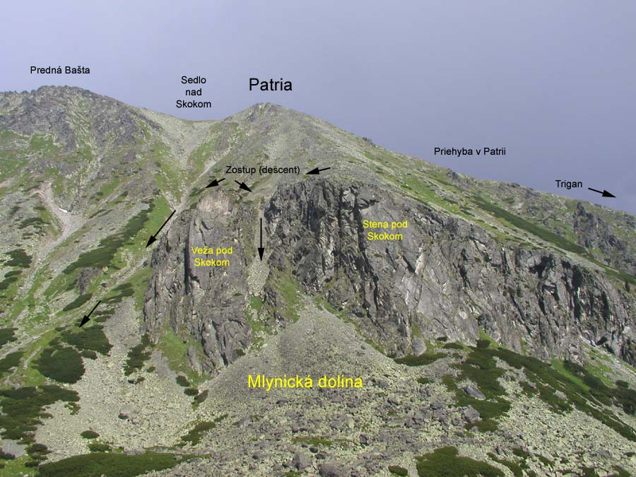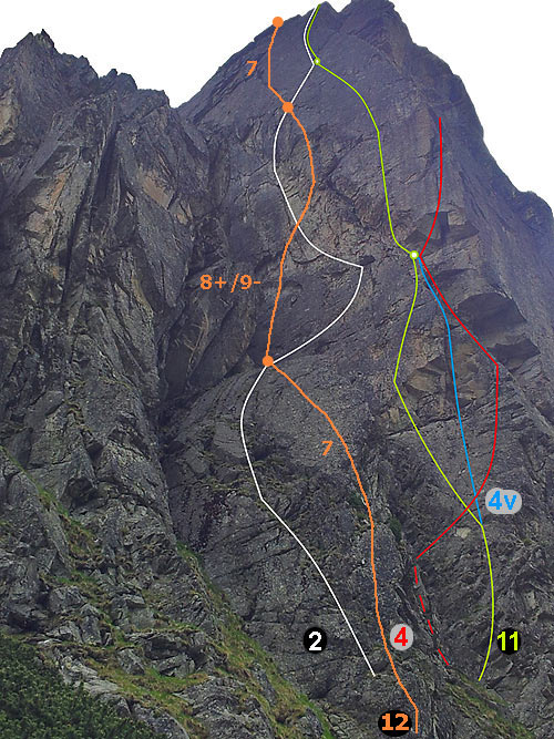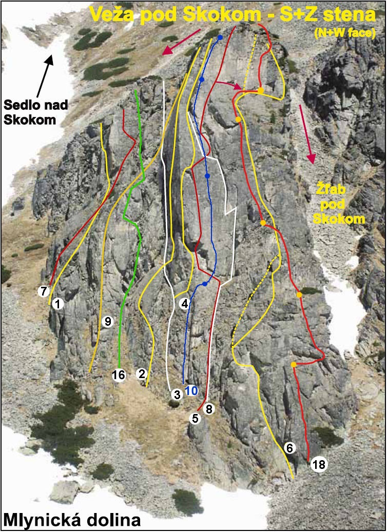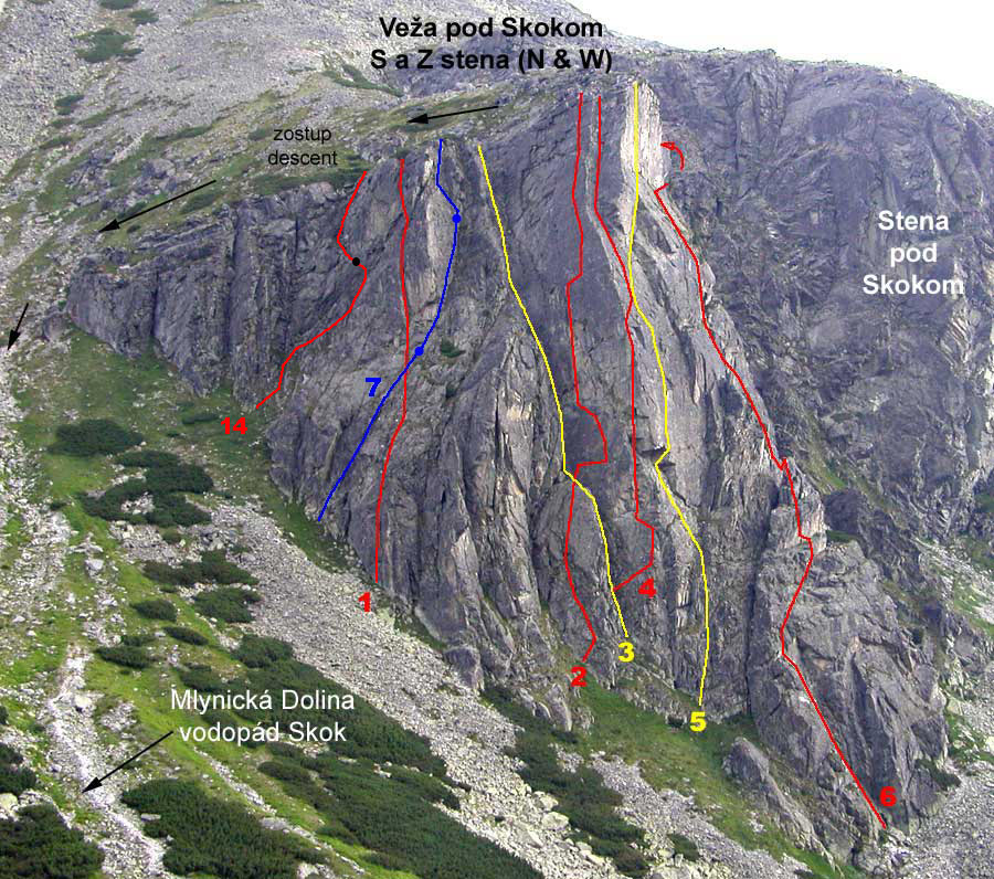 1. Cez kút (V, V+) 1,5 h. D. Kalman, G. Ganyo2. V ríši snov (VI+,A2) D. Kalman, V. Snitka, 14. 9. 1997 3. Ľavým zárezom západnej steny (IV) 1 h. F. Janiga, K. Janiga, 14. 5. 1983 Výstup vedie výrazným zárezom oddeľujúcim vlastnú vežu od jej nižšej ľavej stienky, ktorá je situovaná na sever. Nástup v spádnici zárezu, ktorého spodná časť je zvetraná. Zárezom pod vytláčajúcu stienku, nad ktorou je stanovište. Z neho priamo zárezom hore na sedielko medzi ľavou časťou a vrcholom veže. Doprava hore na vežu.4. Ľavou hranou západnej steny (V+,A2, OS: 8/8+) 6 h. L. Mederi, J. Peťovský, 17. 8. 1982 1. free PP: P. Packo, M. Packo, 11. 6. 1993, udali klasifikáciu PP 8- 2. free OS: Zajac - Stoličný.26. 6. 1994 Popis prvovýstupcov: Nástup cestou č. 3, asi 20 metrov, traverz doprava pod previs až na hranu. Odtiaľ 10 metrov hore na stanovište pod ďalší previs, hore k previsu s výraznou širokou škárou. Hore škárou pomocou drevených klinov až na hranu. Cez hranu a okolo nej platňou na plošinu. Odtiaľ hore a výrazným kútom pri hrane na vrchol. Popis free OS: Problémom je previs preťatý špárou na nepríjemné žaby a slabé nohy. Klasifikáciu dosť ovplyvní šírka lezcovej dlane. Okrem prvých dvoch dĺžok lezenie v pevnej skale. Použitý materiál: stopery, frendy, 2 tenké skoby. 4.v Nástupový variant (OS: 7) I. Ondrej - R. Staruch, 7/2013 V ceste -Ľavá hrana Z steny- je možné vynechať prvé dve dĺžky a nastúpiť variantom priamo cez previsnutý kútik obťažnosti okolo 7, odistené nitmi a aj štand pod kľúčovou dĺžkou je na 2 nitoch. 5. Tatarkova cesta - západ (IV+, A2, OS: 7+/8-) 8 h. J. Štelbaský, V. Tatarka, 14. 9. 1978 2. výstup:F a K. Janiga, júl 1982 OS: Zajac - Stoličný, 26. 6. 1994 Popis: Dĺžka lana pod pod pravý okraj najvýraznejšieho previsu pri ľavej hrane steny (IV). Ďalej popod previs cez naklonenú platňu (IV+) a cez jeho prostriedok na stanovište v platni (A2). Platňou a kútom až na šikmú platňu pod vrcholovou kolmou stienkou. (IV+, A1). Vrcholovú stienku pretínajú dve súbežné špáry. Ľavou z nich na vrchol veže. Spod vrcholovej stienky je možné po šikmej platni vodorovne vytraverzovať doprava na pravú hranu veže (II - III) a ako cesta č. 6 na vrchol. Popis OS: Okrem prvej dĺžky pekné lezenie v pevnej skale, problém je previs s výlezom do platne. Použitý materiál: stopery, frendy, 2 tenké skoby.6. Prostriedkom veže - západ (VI-, A0) J. Kalafút a 2 spolulezci, 7. 7. 1980 2 výstup: M. Mikula, V. Šoltés, júl 1983. V mieste kde veža, zabieha do sutiny najnižšie sa tiahne doľava markantný kút. Ním na stanovište a potom popod previsy doprava asi 10 m. Ďalej cez previs na lávku prichádzajúcu zľava. Z lávky mierne doľava hore pod stienku so širokou špárou. Ňou na prvú vežičku. Z nej na druhú vežičku a po jej pravej hrane na stanovište. Ďalej platňou na trávnatú policu z ktorej širokou špárou až ku šikmej platni pod štítovou stenou s dvomi paralelnými špárami. Na platni stanovište. Z neho traverzujeme doprava a obídeme tak štítovú stienku. Po pravej hrane veže na vrchol veže. Variant vrcholovou stienkou vpravo: V+ 7. Veterný kút (V-) J. Pukanský, V.Kováčik, 2. 7. 2006 2.Leto: M. Varga, F. Farkaš, 9. 8. 2011, Kút nie je veľmi vhodná túra na leto pre množstvo trávy a rozbitú skalu, pozri foto V zime je však obtiažnosť údajne vyššia (V+ až VI pre kľúčový krok v platni prvej dĺžky) Cesta začína vo výraznom kúte cca 30 metrov vpravo od cesty čislo 1. Prvá dlžka Kút V-,následne ľahšim teréhom za III pod pravý výrazný kút. (30metrov) Druhá dĺžka IV, Končí pri výraznom bloku (30metrov) Tretia V- prechod doľava cez blok do bieleho mierne previsnutého kúta ním hore. (20 metrov)8. Zima na krku (VII-) 3,5 h J. Mierka, J. Svrček, 1. 11. 2010 1. opakovanie. J.Korienok, M. Volf, 17.11. 2010 materiál: skoby, čoky friendy.9. Petrolín-AA (IV+) 2 h. J. Janiga, R. Karkusz, 14. 6. 1986.10. Pre Jarku (IX-) 3 h P. Haľko. – R. Labuda 24. 8. 2012 Športová cesta “Pre Jarku” je odistená nitmi. Prvá dĺžka (V+) 40 m, nástup kútom (vľavo od Tatarku), prvý štand pretína Tatarkovu cestu pod previsom. Druhá dĺžka (IX-) 30 m mierne vpravo nástup do platne, medzi Tatarkom a Zimou na krku. Tretia dĺžka (VIII) 25 m smerujúc na hranu piliera, štvrtá dĺžka (V) 25 m hranou piliera na vrchol. Cestou sa dá zlaniť, lepšie na tri krát, na štand č. 3 a z druhého štandu až dole (60 m laná). Materiál 10 expresiek, v prvej dĺžke podľa potreby doistenie friendami.
