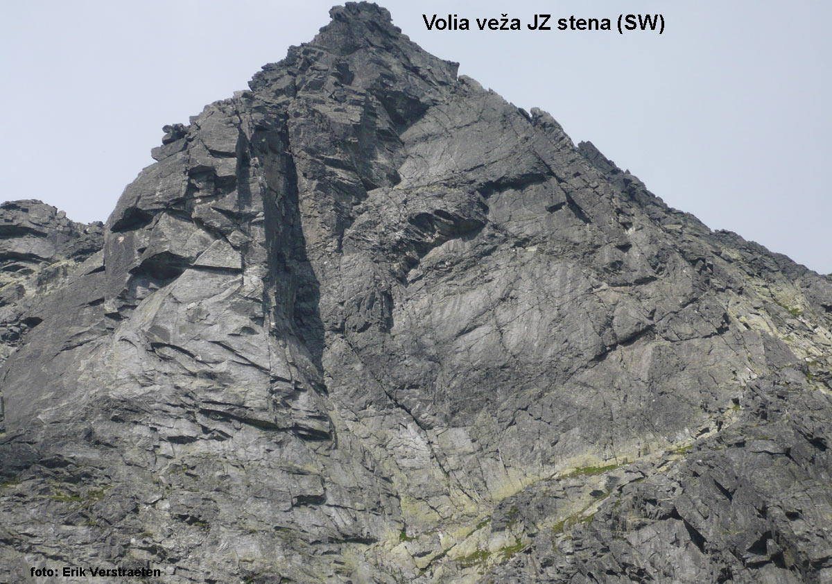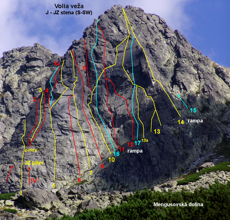 1. Ľavá časť JZ piliera (IV) 4,5h. W.Bober -A.Machnik 21.8.19752. Cesta platňami (VI-VII) 4h. I. Kos, M. Maras, 17.6.1996 1. opakovanie pravdepodobne V. Jakubec, J. Mierka, 13. 7. 2002 Cesta vedie JZ pilieri. Spodná časť cesty (III-IV),vľavo od puškášovej cesty, dve dĺžky lana (čoky, firendy) vedie na výraznú trávnatú policu.(Stanovište). Nad policou je veľká tmavá platňa. Na stanovišti na rampe a v platniach sú osadené nity zo signom autorov. Cesta vedie v smere osadených nitov - 50 m (VII). Na stanovišti nad platňami -je veľký balkón, stanovište je spoločné pre cesty 2.,3. a 4. je osadený nit. Odtiaľ vľavo, alebo priamo ľahším terénom, alebo vpravo cez previštek do výraznej špáry a ňou hore.(ťažšie)Pozri aj foto v -Iné užitočné info- pri stene. 3. Stupid wall (VII) 4-5h. J.Wolf - R. Lienerth 28.8. a 29.8.2001 Cesta vedie z rampy v strede steny - platňami vľavo od cesty č.4. V ceste sú osadené nity a skoby.Info:M 5/2001 Pozri aj foto v "Iné užitočné info" pri stene. 4. Puškášova cesta (VI,A1,RP6+) 4h. A.Kortvélyessy - A.Puškáš 15.7.1947 info AP VII/46 K395 JZ pilier opancierovaný platňami meria asi 270 metrov a ohraničuje z ľavej strany JZ stenu Volej veže. Prístup pod pilier. Ako prí prístupe pod JZ stenu, ale od Vyšného Žabieho plesa šikmo vľavo po sutine pod JZ pilier. Vstup do piliera je uprostred rebra, kde vybieha trojuholníková ostroha. Od nej kúsok doprava, cez prvý previsa ďalej medzi blokmi 25 m. hore na trávnatú plošinku. Odtiaľ 7 metrov šikmo vľavo trhlinou, potom hore ľahším terénom na lávku. Z jej pravej strany priamo hore pomocou trhliny odštiepeného bloku na začiatok platní. Smer ďalšej cesty nám ukážu veľké previsy, pod ktoré sa tiahne škára. Tu sa začína najťažší úsek výstupu. Od škáry doľava cez previs 15 metrov hore. Potom doprava v hladkých platniach /odštiepené lupene/ sa tiahnúcou trhlinou 10 metrov (VI, záchyty len na ruky) na šikmú platňu pod obrovskými prevismi. Z platne hore cez previs (A1) do kúta, ním hore cez previs a ďalej 10 metrov hore do dosť širokej pukliny. Touto hore a potom traverz na plošinku stanovište nit,(veľké previsy zostávajú po pravej strane). Z plošinky rebrom rovno hore na vrch JZ steny a hrebeňom na vrchol veže. Pozri aj foto v -Iné užitočné info- pri stene. 5. Kývala-Orolín-Zeitler (V+,A3, RP 7) 4h. J.Kývala, M.Orolín, J.Zeitler 8.6.1968 info AP VII/48, K399, RP 5a. Polský Variant (V,A2, PP 9-) 6h. D.Miodowiczová -J.Wolf 7.9.1975 Výstup vedie medzi cestou 4. a Orolínovou cestou cez dve výrazné strechy zľava asi 50m úsek. info AP VII/51 Prvé voľné prelezenie: M. Peťo, D. Závacký, 13.8.2010 1. dĺžka: 4, 2. dĺžka: 7, 3. dĺžka: cca 8/8+,4. dĺžka: cca 9- (najskôr vyhákované a očistené, potom vylezené štýlom PP), 5. dĺžka: 3+/4- Na odistenie poslúži sada čokov a friendov (od mikro po veľkosť 5), štandy nad 2., 3. a 4. dĺžkou odistené nitmi ( Poliaci: P. Korczak, A. Paszczak, J. Pilarek, 2006.v rámci nového variantu ZHP, ktorý kľučkuje pomedzi strechy (odbočuje pod prvou strechou doľava do platne, platňou traverz doprava pod druhou strechou a výlez do kútika v Orolínovej ceste ) - viď fototopo so zákresom). 2. voľné prelezenie PP: O. Húserka, M. Červienka 13. 7. 2011, klasifikácia pôvodne 1.dl 8/8+ a 2.dl 9- podľa nás 1.dl 8+ 2.dl 8 Rozprávanie o free preleze od Mira Peťa (HK Jasná Liptovský Mikuláš, JAMES): Úvodná dĺžka je príjemným rozhýbaním hornej časti tela po krutom dva a pol hodinovom výšľape z parkoviska pri hlavnej ceste. Na prvom štande už máme priamy výhľad do striech nad nami, v dôsledku čoho podlieham neúprosnému volaniu prírody. Sorry. Dávid "Zavaky" Závacký sa zatiaľ rozhoduje, že si na OS potiahne aj druhú dĺžku (kľúčový oblý sokolík originálneho Orolína, odkiaľ Poľský variant pokračuje doľava nahor cez dve strechy). Úspešne. Potom je rada na mne v kúte zakončenom prvou strechou, ktorý som s Váňom hákoval a zbavoval lišajníkov niekedy pred mesiacom. S výdatnými bandaskami v rukách aj lýtkach púšťa hneď na RP. Parádna dĺžka. V strede kúta nechávame jednu tutovú skobku a vo výlezovej špárke strechy mikročok - pre prípadných nadšencov voľného lezenia, ktorí by starým skobám a vlastným mikroistítkam veľmi neverili. Nemáte za čo. Nad strechou pozor na zaseknutie lana vo výlezovej špárke (riešenie = stará skoba + karabka + 120tka šlinga + dlhý expres). Druhá strecha podľa očakávania odoláva dlhšie než prvá, takže sa tam so Zavakym na striedačku metáme vyše dvoch hodín. V istých momentoch už začíname byť skeptickí, no v tom Zavaky objavuje žabu, ktorá presne sedí na jeho labu a pri sľubnom pokuse padá z výlezu previsu. Škoda. Mne Zavakyho finta veľmi nesedí - dlane mi narástli nejaké menšie. V poslednom nápore dňa však zatnem zuby a napriek zle držiacej žabe masochistický boulder preliezam. Super. Za odmenu ešte ľahká výlezová špára a utekačková posledná dĺžka. Potom už len rýchly zlaňák Puškášovým komínom nasledovaný nekonečným zostupom dole k autu...6. Katarzia (X- team PP) M. Medviď, Michal Pleidel, 15.6.2022 Story: Po 30 rokoch agónie tohto zabudnutého Medveďovho projektu a jeho následnom oživení a dokončení až na vrchol JZ piliera už aj s mojim pričinením (v rokoch 2019 a 2021), sa nám 15. 6. 2022 konečne podaril prvý volný prelez tejto línie, na jeden záťah až na vrchol. 10 - team PP. Čistý prelez padol celkovo pri piatej návšteve steny a prvej tento rok (hold, poctivo odmakaná zima stála za to Medveď!). Cestu sme preliezli štýlom team PP. Pre korektnosť musím uviesť, že dĺžku za 10- preliezol volne len Medveď (druhým pokusom), ja na druhom konci som kľúčový boulder predojil za A0. Tretia dl. za 9- sa podarila mne, tie