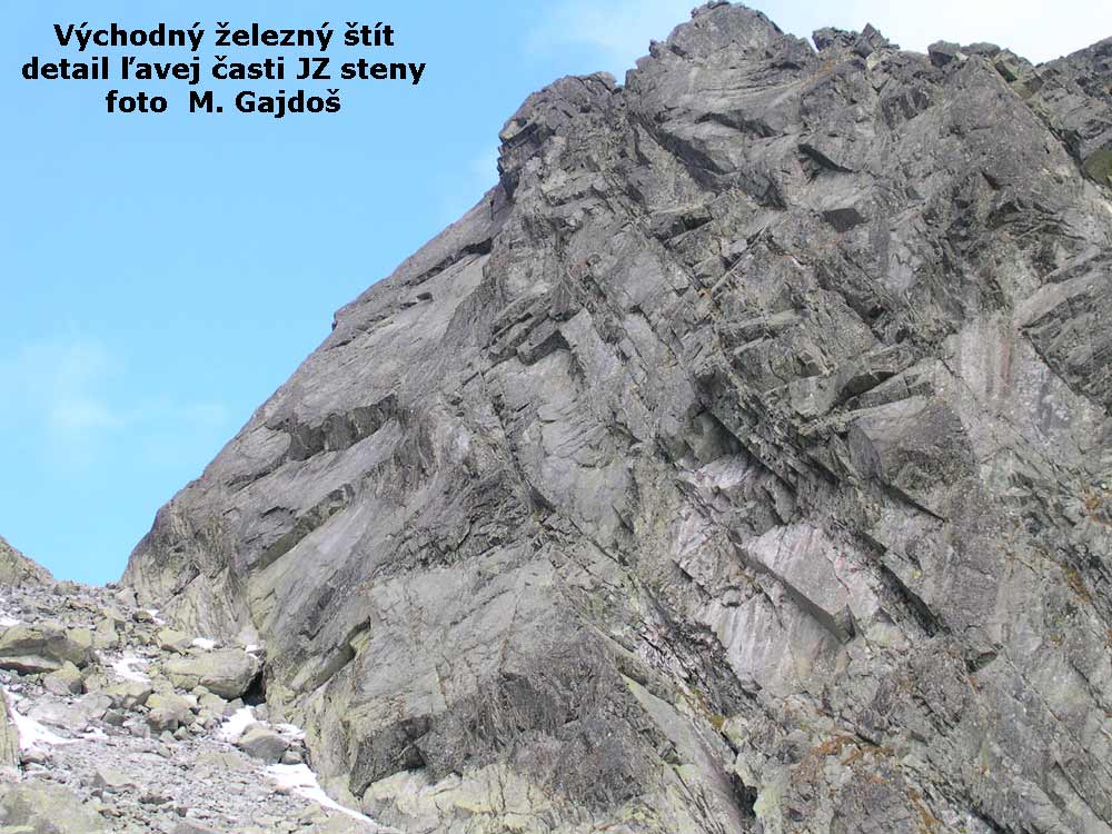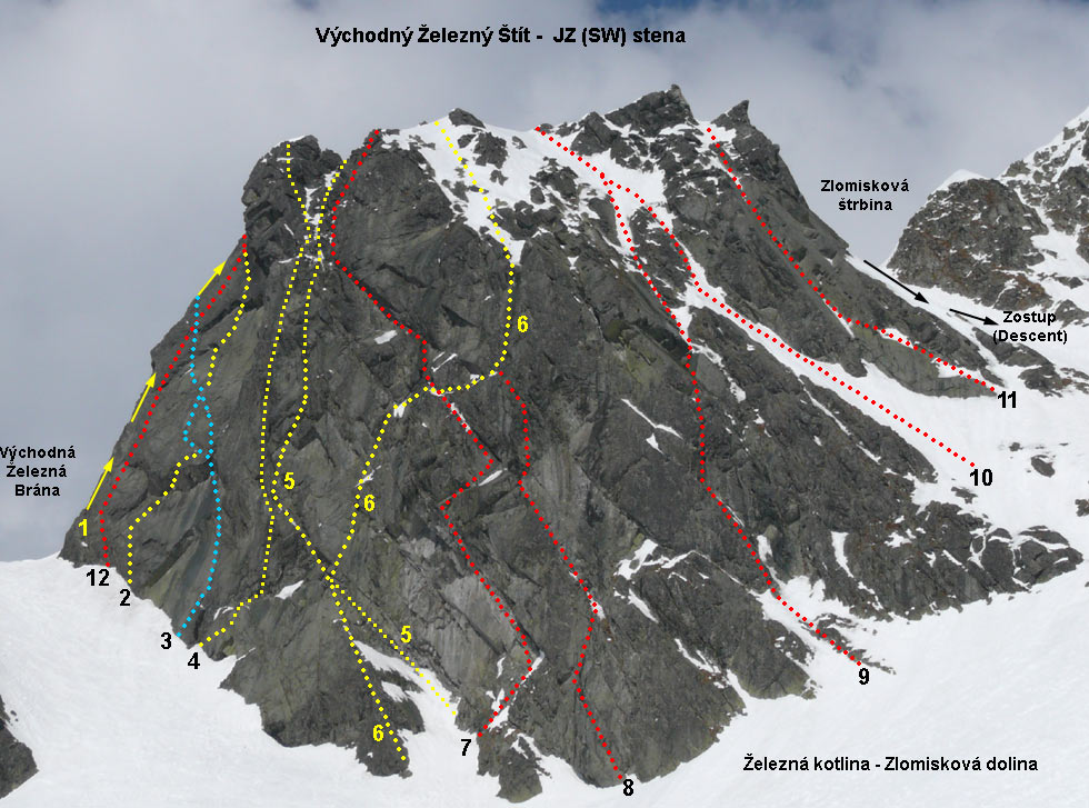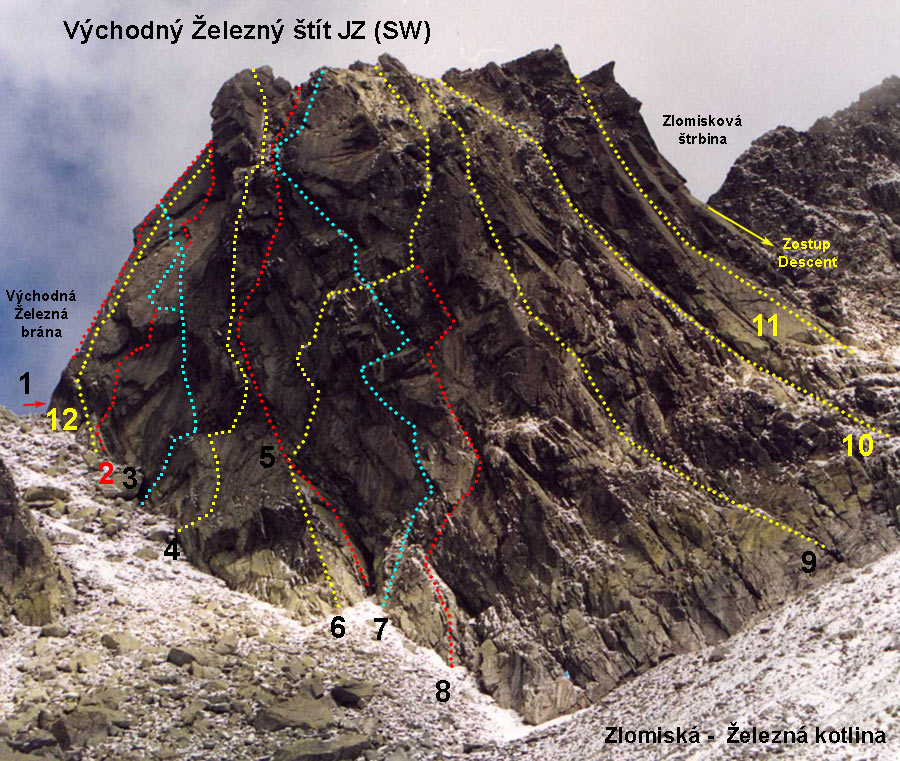 1. Tilleho hrana (VI/A2 RP:7) 4h. K.Tille, K.Zlatník 30.7.1948 1.RP cesta sa lezie voľne už dávnejšie. Zo sedla strmou platňou po severnej-ľavej strane hrany 25m hore. Potom traverz šikmo doprava hore na hranu. Stanovište v platni. Hranou a potom trhlinou za odštiepenú vežičku (zdola nevidieť) a na jej vrchol. Ľahko cez tri zuby hrany pod hladký výšvih. Priamo hranou (A2) a potom napravo od nej pod previs. Cez previs-zárezom (A2). Hranou na plošinku pod koncový výšvih. Cez neho (A2) a ľahkým hrebeňom na vrchol. Pekná exponovaná cesta.2. Michalko - Tatarka (V/A0-A1) ?h J.Michalko, V.Tatarka 14.8.19853. Kývala-Zeitler (VI/A2, RP 7- ) 4h. J.Kývala, J.Zeitler, 7.6.1968 J.Ďurov, M.Kriššák, 5.9.1970 - variant priamo do bieleho výlomu (V) 1.RP: možno dávnejšie ?, prvá zmienka L.Abt 4.7.2008 (6+), štýl AF?, Opis OS prelezu a schéma: R. Lienerth, F. Závacký 28.9.2009,(7-)4. Jackovič-Belicza-Skokan (VII-) 7h. P.Jackovič, P.Belicza, J.Skokan 12.9.19995. Hauschkeho cesta (V/A0) 4h. K.Hauschke, A.Reimer, M. Doubek 17.8.1962 Výstup vedie pozdĺž nápadnej trhliny tiahnúcej sa k platniam nad Železnou bránou. Nástup ako Motykova cesta alebo žliabkom, pokračujeme pozdĺž trhliny až pod previsnuté platne. Tu traverz doľava za hranu, ktorá delí stenu na dve časti, na plošinu. Z nej šikmo doľava hore k trhline pod prevismi a trhlinou veľmi ťažko na plošinu. Z nej doľava a potom cez previs pod kolmou až previsnutou stenou. Cez ňu pomocou skôb (A0). Ďalej mierne doľava lámavým kútom na hranu a ňou na vrchol. 6. Motykova cesta (V) 4h. S.Motyka, K.Mrózek 21.8.1935 Paralelne so žľabom do Železnej brány sa tiahne mokrý zárez oddelený od neho predskálím, ktoré sa hore strmo dvíha. 40 m hranou predskália až zaniká v platniach. Tu asi 6m doprava pod strmý žliabok. Ním hore cez dva previsy (A0) na výstupok. Odtiaľ trochu doľava a hore trhlinou na široký balkón. Z neho dlhý traverz doprava cez stupne pod previs zakončený ostrohou. Popod neho ďalej traverz na popukané platne na balkónik. Z neho dole doprava na ďalší trávnatý balkónik. 6m vpravo pod zvislú stienku s trhlinou. Trhlinou hore cez vklínený balvan na plošinku pod strmým zárezom. Ním hore na ľahší terén a na vrchol.7. Cesta na pamiatku Ľ.Gibasa (V+/A1,OS 6+) 8h. J.Kulhavý, P.Mikuš 26.6.1977 OS:M.Styk, J, Svrček OS 6+, sept. 20148. Baronova cesta (V-VI) 4h. M.Baron, J.Holý 23.7.1937 Je to vlastne dolný variant Motykovej cesty. Do západnej polovice steny sa vrýva, skoro v spádnici vrcholu k červenému žľabu sutinový kužeľ. Tu je nástup. Doprava po hrane, trávou porastenými skalami a asi po 15 m na plošinku pri ústí šikmého kúta. Kútom 5 m hore pod previs. Odtiaľ doprava po lámavých skalách cez hranu previsu na strmú platňu a touto traverz 6 m ďalej doprava po lištách. Odtiaľ kolmo hore cez trochu previsnutý komínik do strmého kúta pod veľkú obdĺžnikovú platňu. Kútom, neobyčajne ťažko, pod previsnutý blok. Pomocou spodných záchytov, exponovane, obídeme blok doľava, na hladkú, veľmi naklonenú plošinku.Z nej doprava hore cez previs, ďalej traverz 3 m doprava a sme práve nad spomínaným strmým kútom. Odtiaľ, neobyčajne tažko, zle vrstvenými skalami hore pod previsy, cez ne na platňu a pomocou pukliny doľava hore na trávnatý balkónik. Ďalej ako Motykova cesta.9. Zárezom JZ steny (III-IV) 1h. I.Gálfy, S.Samuhel, P.Vavro 23.10.1962 Prostriedkom steny. - Vľavo od Grószovej cesty je výrazné kútové vhĺbenie s nápadným obdĺžnikovým previsom. Nástup je v spádnici previsu, 60 m ľahko, do žliabku po previsnuté skaly. Doľava na strmo stúpajúcu platňovú policu, ktorá sa po 15 m celkom zúži. Za hranou stanovište. Ďalej platňami popod veľký čierny previs, veľmi tažko, do strmého žliabku. Ním tažko, až ku kolmým skalám, 20 metrov. Tu doprava a sme na ľahkom teréne. Cesta bola pravdepodobne, aspoň z časti, lezená už skôr.10. Grószova cesta (II) 4Omin. A.Grósz, L.Rokfalusy 12.8.1911 Pravou stranou steny. Z dolného úseku žľabu zo Zlomiskovej štrbiny smeruje doľava nápadný plochý žliabok až k vrcholovému hrebeňu. Žliabkom až do užšieho komína, buď ním alebo platňou vľavo hore až na trávu a skaly na JV hrebeň. Ním na vrchol.11. Kriššák-Orolín (V/A2) 2h. J. a M.Kriššák, M.Orolín, J.Botka 21.9.1970 Pravou časťou v blízkosti Zlomiskovej štrbiny. Nástup 10m od pravej hrany JZ steny. Dĺžku ľahko v platni na dobré stanovište. 20 m po skobách vo výraznom kúte pod previs. Traverz doľava 4m do trhliny v platni po skobách a po skobách trhlinou hore pod malý previs. Cez neho ľahko do výrazného žliabku. Žliabkom až na hrebeň do nápadnej štrbiny.12. Blade Runner (VII). A. Paszczak, S. Piecuch, 19.8.200713. Chamomilla (PP:IX-), RS2 M. Červienka, M. Varga,jún 2016, Opis od autorov: Počas júna sa nám v Tatrách podarilo urobiť novú cestu v juhozápadnej stene Východného Železného štítu. 3 dĺžky 120m. 1.dĺžka (VIII), 35 metrov, 8 nitov 2.dĺžka (VIII+?), 35 metrov, 9 nitov 3.dĺžka (IX?), 40 metrov, 3 nity (záver dĺžky spoločný s Jackovičovou cestou) Cesta je urobená odspodu, vŕtali sme z háčikov a skôb. Na opakovanie stačí 10 expresov a do záverečnej špáry 2-3 friendy strednej veľkosti. Zlaniť je výhodnejšie Tilleho hranou 2x50m. RP sa nám zatiaľ podarilo vyliezť iba prvú dĺžku na zvyšné dve nebol čas, keďže aj cestu sme vďaka búrkam a pádom museli robiť na 3 návštevy. Klasifikácia v 2. a 3.dĺžke je len orientačná, keď sa to niekomu podarí preliezť a ohodnotiť, budeme radi. Ďakujeme Radovi Staruchovi za požičanie vŕtačky. Ja by som už asi nepožičal...Veríme že požičia aj nabudúce! Opis PP prelezu a návrh klasifikácie. Podarilo sa nam PP preliezt Chamomillu: Chamomilla, IX-, S2/R2 (po napojení na Jackovičovu cestu). 