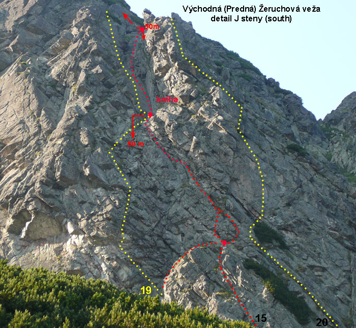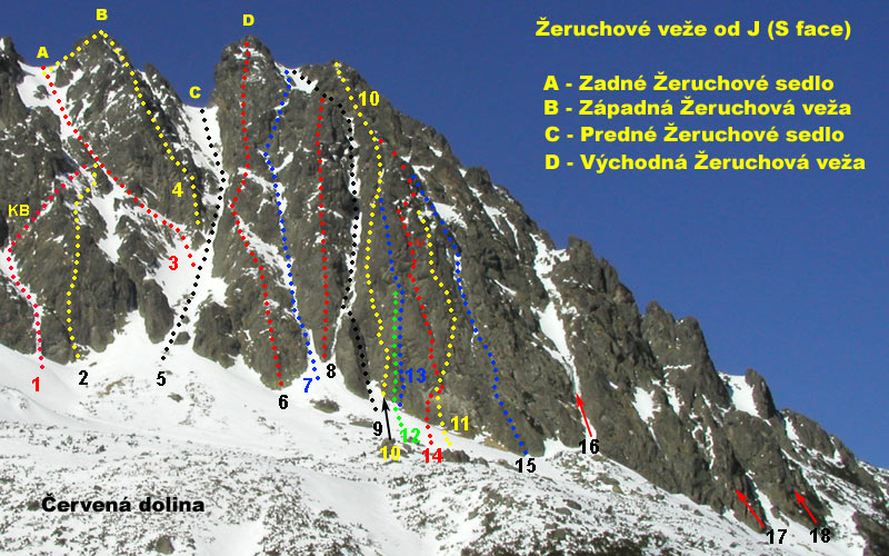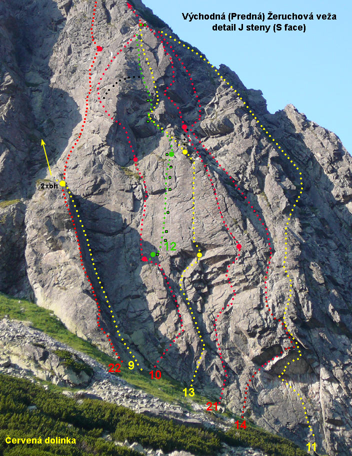 1. Zadné Ž. sedlo JZ vhľbením (III,I) 1,5h. A.Puškáš a druhovia, 22.7.1954 Info:K3/2155 Široké vhľbenie je prerušené dvoma výšvihmi,nad prvý zprava do trávnateho žlabu, nad druhý zľava,v polovici cesty traverz doprava a ďalej veľkými trávnikmi hore a doprava po travnatom páse na sedlo.2. Zadné Ž. sedlo J pilierom (IV) 2h. J.Doležal,H.Grandtnerová,Č.Harníček,I.Kluvánek, 21.7.1954 Info:K3/2154 ,AP-I/64 Nástup v spádnici sedla asi 30 m. vľavo od najnižšieho miesta steny. Päta steny je tvorená prevismi, nad ktorými je trávnatý žliabok. Nástup cez krátku platňu hore, mierne vpravo, ďalej asi 15m po trávnatých stupňoch hore, potom traverz do žlabu asi 20m nad prevismi. Žlabom hore a pred jeho ukončením asi 10m komínikom na plošinku piliera, ktorý je vľavo od žlabu. Z plošinky traverz doprava a stienkou na výšvih piliera, ďalej širokou trávnatou lávkou hore. Po jej skončení naspäť doprava na výšvih piliera, odtiaľ 5m exponovaný traverz doprava na plošinku a hore po dobrých stupoch.Pokračujeme trávnatým žlabom až do sedla.3. Zadné Ž. sedlo JV vhľbením (I) 1h. R.Kordys, J.Mašlanka, 13.8.1911 Info:K3/2156, AP-I/63 Najprv cestou č.5 až po zúženie a pätu J piliera, tento traverzujúc šikmo doľava do žlabu a ním hore.4. Západná Ž. veža J rebrom (IV, hore III) 1,75h. J.Andráši,J.Dostál,E.Nemeš,J.Vyskočil,A.Pivková, 21.7.1954 Info:K3/2157, AP-I/66 Nástup cestou č.5 k päte piliera.Cez ťažšiu vstupnú stienku, priamo pilierom až na vrchol.5. Predné Ž. sedlo J žlabom ( miestami II) 0.75h. W.Malinowska,W.Malinowski,S.K.Zaremba, 17.8.1928 Info:K3/2158, AP-I/69 Sutinovým kuželom a roklinou spadajúcou priamo zo sedla hore.6. Vých. Ž. veža J pilierom (III,jedno miesto V) 2h. M.Mereš,A.Puškáš,G.Takáč, 23.6.1953 Info:K3/2159, AP-I/77 Pilier sa tiahne vpravo od rokliny do Predného Žeruchového sedla. Nástup na pilier po pevných skalách prerastených trávou a kosodrevinou. Až po poslednú kosodrevinu potom távnatou lávkou strmo doľava hore až na jej koniec.Hore výšvihom piliera a cez balvan vklínený v sedielku, ďalej hore strechovite vrsvenou stenou piliera (V) na trávnatú plošinu s kosodrevinou. Odtiaľ cez posledný krátky výšvih a ďalej po položenom pilieri na vrchol.7. Vých. Ž. veža ľavým žlabom (IV) 2h. K.Bocek, L.Hofírek, 21.7.1950 Info:K3/2160, AP-I/76 Nástup vľavo od začiernených skál, kde trávnik zasahuje najhlbšie do steny, 35m žlabom hore. Potom sa rozširuje. Po 50m priamo stenou, ktorou je žlab prerušený.Ďalej trávou pod vklínené balvany, ktoré obchádzame trávnatou lávkou zľava,potom späť doprava cez stenu na trávnaté plošiny.Odtiaľ šikmo doľava k oknu, 4 metre pod ním šikmo doprava cez stenu a potom rovno hore do komínika (IV) až na trávnatú plošinku. Z nej sprava na hrebeň a na vrchol.8. Vých. Ž. veža stredným pilierom (V) 2h. H.Hajdukiewicz, J.Tatar, J.Hajdukiewicz, J.Klimiňski, 20.9.1956 Druhý priestup a zima:P.Koubek, J.Krch 16.2.1974 Info:WHP-24/3901 Cesta vedie pravou stranou piliera v J stene. Pilier sa nachádza medzi ľavým a pravým žlabom J steny V.Ž. veže (medzi cestami č. 7 a 9). Nástup 30m vľavo od ústia pravého žlabu. Hore trávnatyým kútikom (IV) a potom vysokými stupňami 35m na policu pod previslou zle vrsvenou skalou.Z jej ľavého konca priamo hore 12m (V) na dobré stanovište. Odtiaľ vľavo šikmo hore 20m k kútiku. Ním hore (III) /vľavo sú previsky/ na ľahší terén, ktorým 20m na sedielko z blokom. Z neho šikmo vľavo hore 120m (II) na vežičku, v ktorej vrcholí pilier. Z nej 10m dole do sedielka. Z neho hore po ľavej strane žlabu spadajúceho z hrebeňa ešte 80m na vrchol Cesta je exponovaná a vedie v pevnej skale.9. Vých. Ž. veža pravým žlabom (V,hore III) 1,5h. K.Bocek, V.Krajňák, 5.7.1950 Info:K3/2161, AP-I/75 Do dolnej časti žlabu sa vsúva veľký skalný blok. Jeho pravým kútom 60m hore (V).Ďalej priamo hore ľahším terénom v žlabe.Po troch dľžkach cez ľavú stenu, potom 60m hore pod vklinené balvany, ktoré podliezame vľavo a ďalej doľava na vrchol.10.Vých. Ž. veža pilierom, Klíma-Linhart (V) 2-3h. R.Klíma, J.Linhart, 4.8.198111.Vých. Ž. veža "pilier" (V+,A3) 3h. Neznámi prvovýstupci? priestup:Š Ružbašan, M.Muroň 12.Korsvoldov tanec (VII) 2-3h. M.Kúdela, I.Hrmo, júl 1996 1.RP: Hrmo, 8.7.1996 2.RP: Kúdela, 12.7.1996 Sólo: P.Jackovič, 23.4.2000 Tretia dľžka je čiastočne totožná s Čepelovou cestou. V ceste sú osadné nity zelenej farby.13.Čepelova cesta cez platňu (V,A1,RP:6) 2h. P.Bednařík, Z.Čepela, 18.9.1970 Zima:J.Jasiňski, B.Mazurkiewicz, 26.3.1978 1. zimné istené sólo. M. Kapusta 3.3.1979 Preistené v 2014, V. Zboja - nity na štandoch. Info:WHP-24/389914.Zielony okap (VIII-) 3,5h. W.Janovski, P.Snusika, 28.7.1988 Pavlík, Říha OS:7+, sept.199915.Cesta cez knihu (V) 2h. T.Marec, B.Čiernik, 28.7.1985. Preistené v 2014, V. Zboja - nity na štandoch. Dlhú druhú a poslednú dĺžku je možné rozdeliť na dve pod 30m. 16.Vých. Ž. veža JV roklinou (II) 1h. G.A.Hefty 2.8.1908 Info:K3/2162, AP-I/74 Od Zeleného plesa turistickou značkou do tretiny morény Červenej doliny. Z chodníka doprava po tráve a suti k najnižšej ostrohe JV rebra. Vľavo od nej sa tiahne strmý, mokrý, čierny žlab - ním do JV rokliny. V rokline častočne vľavo žliabkom, čiastočne plochým rebrom do miesta kde sa roklina rozvetvuje.Odtiaľ doľava do bočnej rokliny a ňou na JV rebro, cez zle vrstvenú stienku na jeho poslednú vežu.ďalej po rebre na vrchol. 17.Vých. Ž. veža JV rebrom (III,IV) 3h. F.Kele st.,A.Puškáš, 24.4.1952 za zimných podmienok. Info:K3/2163 ,AP-I/78 Ako č.16 pod JV rebro.Prvý výšvih rebra priamo hore,zostúpime do hlbokej štrbiny za ním. Z nej ďalším výšvihom a priamo cez skalné zuby rebra na vrchol. Hore ľahší terén.18.Vých. Ž. veža JV pilierom (