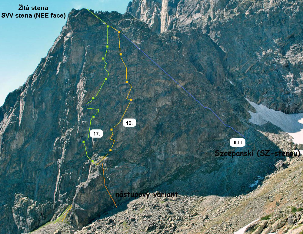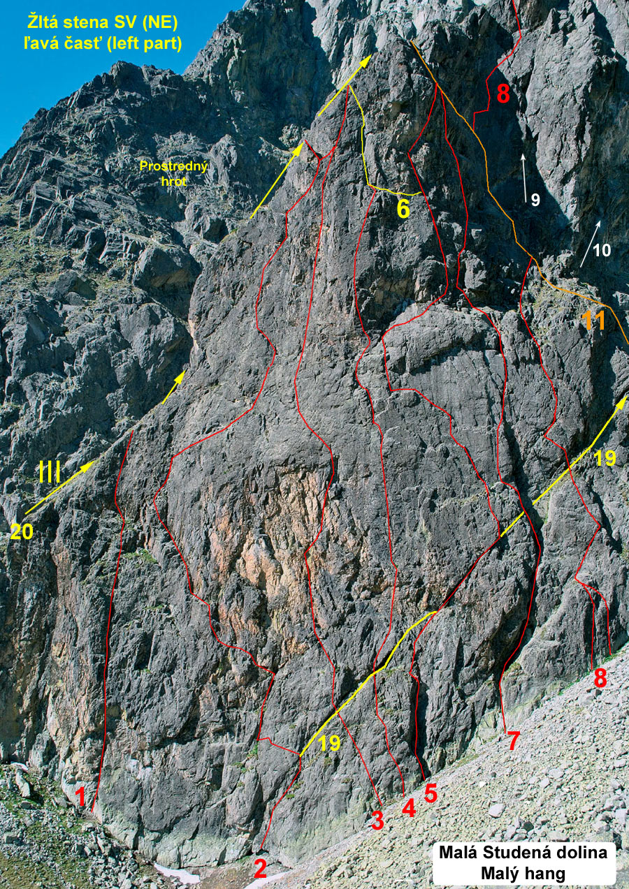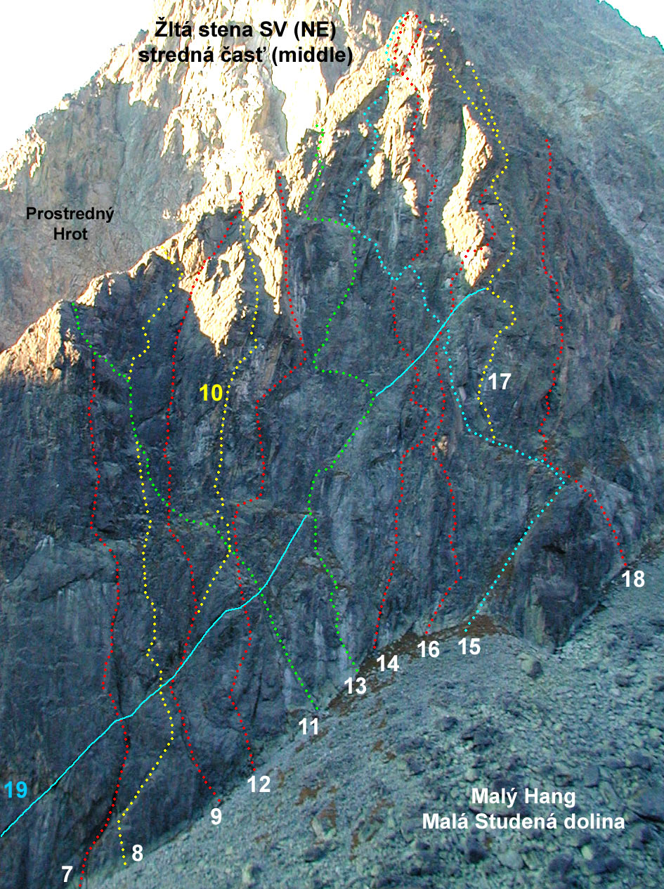 1. Špárkou (V+) 2h. Ľ. Fábry (Gazda), Hulenyi, 11.10.1984 II.leto: J.Sýkorová , P.Jackovič, 6.10.1991 2. Martinova cesta (VI)10h. P+ I. Dieška,1.8.1969 II.leto: Miloš + Tom ?,10.8.1970 III.leto: V. Petrík, M. Neuman, 26.7.1971 I.zima: Z. Drlík, L. Paleníček, Prokeš, 7.2.1972,10 hod II.zima: Hradecký, Skoupý,19.3.19723. Psotkov odkaz(V,A1, RP:6) 8h. A.Belica, L.Páleníček, 13.6.1975 II.leto: L.Šlechta, S.Horn, 6.8.1975 III.leto: J.Švejda, R.Urbanec, 9.8.1975 1.RP: Š. Bednár, J.Tremba, 13.6.19804. Letné radovánky (RP 7/7+, pôvodne VI-,A0) 5h. J.Adámek, J.Pitoňák, 24.8.1984, (posledných 50 m shodných s výstupom č.6) 1. RP: Š. Bednár, M. Malina, 11.7.1987, Dolný previs 7/7+5. Chroustova cesta (V+) 7h. J.Procházka, P.Stříbrný, 13.8.1970 II:leto: Šmíd, Hartil, 16.8.1970 III.leto: Berežný, Nosek, 2.7.1971 Pôvodná Chroustova cesta končí v Parákovej ceste za hranou, v súčasnosti sa často spodná časť výstupu kombinuje s výlezom Parákovou cestou v hornej časti. Foto z prvovýstupu (Archív P. Stříbrného) 6. Variant v Chroustovej ceste (V+) 2h. J.Kertész, M.Orolín, 28.8.19727. Parákova cesta (V+) 4h. J.Parák, E.Strzebonski, 25.9.1949 II.leto: B.Svatoš, J.Šimon, 6.8.1954 III.leto: J.Psotka, J.Valter, leto 1958 Free solo: M. Kapusta 21.8.1983 Parákova cesta,ľavou časťou steny. Od najnižšieho bodu Žltej steny na dĺžku lana vpravo šikmo hore je výrazná trhlina. Cez ňu nastupujeme po voľných kameňoch a po 5 m. prechádzame vpravo na šikmú trávnatú lávku 15 metrov. Pokračujeme mierne doľava a po 20 metroch prídeme do menšieho výrazného žľabu s lámavou skalou. Tu sa rozdvojuje; my pokračujeme ľavým komínom. Po 30 metroch komínom a lámavou skalou sa dostaneme na kolmú stenu s nepatrnou trhlinou. Lezenie krajne ťažké a exponované. Nie sú tu chyty ani vhodné škáry pre skoby, asi po dvanástich metroch v stene sa dostávame na nepatrný stupeň pod kolmú 6 m. stienku. Po jej prelezení sa dostaneme cez lámavé skaly v menšom žľabe na mierne šikmé platne. Pokračujeme mierne vľavo cez previsnuté balvany do výraznej trhliny a po 30 metroch vpravo na, šikmú stupňovitú platňu. Ďalej hladkou stienkou po ľavej strane asi 3 metre hore a, stadiaľ cez previs, ktorým sa dostaneme na menší balkónik. Polkračujeme priamo hore asi 4 metre cez previsnuté, vytláčajúce balvany vľavo na šikmú platňu s výrazným hranolom na istenie. Tu, asi 2 m. po platni hore prechádzame vľavo do komína s hladkými stenami, 18 metrov, krajne namáhavé. Dostaneme sa, na mierne stupne a ďalej doľava do šikmého žľabu a po dĺžke lana priamo na východnú hranu Žltej steny. Namáhavý a exponovaný výstup, v komíne lámavá skala. Foto z lezenia:8. Platňami (VI-) 5h. P.Jackovič, V.Jakubec, 20.5.1984 II.leto: J.Pitoňák, Exemberger, leto 84 III. leto: I.Papp, O.Ďuriš, leto 84 Varianty: - Nástupový (zľava) - I. Jakubcová, V. Jakubec 6. 8. 1995, V+ - Priamo kútom vľavo od horných platní - D. Solymári, J. Lastofka, 8. 7. 2003, VI+ 9. Čierna škára (V-) 2+2 h. Dolná časť:T.Vyrost, S.Rybárik, 24.7.1971 Horná časť: V.Kubica, L.Páleníček, 22.6.1972, Klasifikácia je podstatne ťažšia ako uvádzajú prvovýstupcovia. II.leto: K.Luxik, J.Hauser, 4.11.1972 III.leto: P.Krupka, J.Linhart, 4.7.1975 I.zima: Beneš, Sulovský, 27.12.1977 10. Belevue (V-,A1) 8h. Z.Drlík, J.Martiš,17.9.1975 II.leto: M.Kebrt, B.Mrozek, 21.8.1975 III.leto: O.Miodowicz, K.Miodowicz, 8.1977 I.zima: Teisler, Turpiš,11.-14.3.197811. Korosadowiczova cesta (V) 1-2h. Z.Korosadowicz, J.Staszel,19.7.1933 II.leto: Z.Brukner, F.Nikolics, J.Takacs, 8.1933 I.zima: J.Parák, A.Puškáš, 4.12.1949 II.zima: J.Němec, J.Sláma,16.4.1952 I.sólo: M. Kriššák, koncom 60-tych rokov, čas:15 min.? Cesta v súčasnosti preistená nitmi. V spádnici vrcholu sa vrýva do steny plytké vhĺbenie, ktoré sa tiahne šikmo doľava na sedielko v ľavej hrane steny. Vhĺbením vedie náš výstup.m Vstup do steny je asi 20 metrov vľavo od najvyššieho výbežku sutiny a trávy. Plytkou trhlinou 30 m. doľava hore až k previsu. Ďalej Alebo :Dnom trhliny (IV). Alebo ľahšie: Stienkou po jeho ľavej strane na trávnatú plošinu. (Nit) Odtiaľ s mierným odchýlením doľava (nit na bloku - možné stanovište) a ďalej krátkym zárezom k odštiepenému balvanu - vežičke, ktorý je už z diaľky viditeľný. Niekoľko metrov pod balvanom cez platňu doľava do širšieho zárezu a zárezom na výstupok s pohodlnou plošinou. (Nit -(otáča sa), staré skoby - stanovište) Tu lávkou šikmo doľava pod oblúkovú puklinu tvorenú platňami. Puklinou 12 metrov hore (IV+, V-), bez toho, že by sme vošli do výklenku, nad ktorým je puklina previsnutá. Nápadný blok (v ňom skoba a slučka s krúžkom ) s malou poličkou pod ním. (Stanovište) Odtiaľ: Vybočíme doľava na strmú platňu a ňou asi 12 metrov šikmo vľavo hore (staré skoby), pod previslými blokmi traverz trochu doľava dole (najťažšie miesto V) a do nápadného kútika, ktorého ľavú stranu tvorí krátky hladký popukaný pilierik (v jeho stienke kývavé balvany). Cez kútik a pilierik vo vrchnej časti a na jeho druhú stranu, trochu dole na vodorovnú skalnú lávku. (Výhodné stanovište). Tri metre vodorovne vľavo pod široký žliabok a ním hore na hranu steny, (III). Trávnatým úbočím (CH) , alebo priamo hranou steny (III) na vrchol. Súčasné fixné odistenie:V súčasnosti sú stanovištia doplnené o nity - preistené E. Veličom v 2014. Staršie info: V dolnom záreze jeden nit vo vzdialenosti cca 45 m a druhý vyššie na bloku asi 55- 60m od úpätia - na oboch miestach po jednom nite. Horný nit na polici pod kútom sa pretáča. V traverze su v skobách slučky. Za traverzom je staré stanovište na skobách.12. Via Antónia (V+,A1-A2, RP 6-) 10h. Z. Drlík, Urbanec, 5.6.1979 Prvé opakovanie a RP: Š Bednár, J. Pitoňák