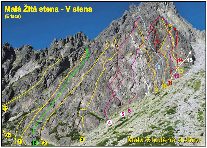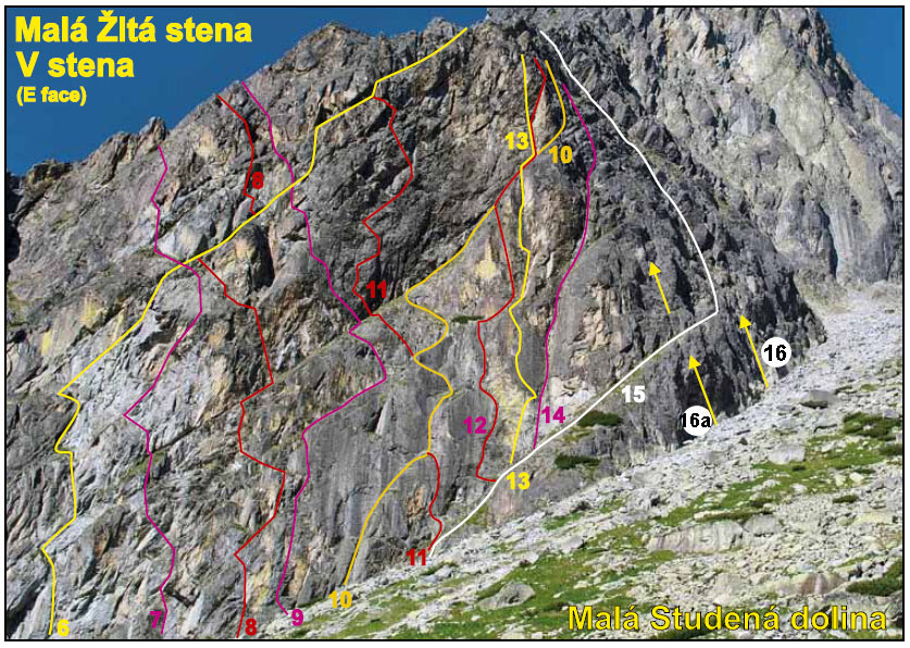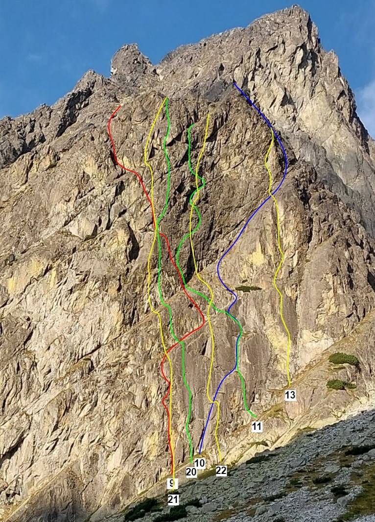 1. Vestenický - Uherová (IV var.IV+) 4 h J. Vestenický - M. Uherová, 18. 7. 1976, IV 1. zima: Boháč, Lenárt, 12. 3. 1977,4h. Nástupový variant: J. Vestenický - A. Kušnieriková, 22. 1. 1977, IV+, 4 h. Leto: I. Račko, Oleg Ďuriš, 24. 8. 1978, 1,5 h. Zima: V. Jakubec, I. Jakubcová, 22. 2. 1987, 4 h.2. Maturitná vychádzka (V+,A0) 4h. J. Vestenický - I. Račko, 13. 6. 1976 Materiál: 6 skôb, hexentre Leto: M. Bakeš, L. Kořínek, 19. 7. 1976. 1 zima: L. Páleníček, A. Ferancová, február 1977.3. Tulácka balada (V-,A1) 15h. Z. Drlík - K. Jakeš - J. Osif 21.,23.,29.12.1975 Cesta vhodná na zimu. Leto: J. Stejskal Zima: Mixový prelez (M5, A1 miesto) a schéma J. Santus,I. Žila 2.2.2002, 7,5h.4. Jitřenka (V-,A1) 12h. Z. Drlík, K. Jakeš, 30.12.1975 a 9.1.1976 1. Leto: L. Páleníček 2. Leto: S. Kuba, J. Bednár, máj 1982, 7 hod.5. Variant cesty č.4 ( V, A2 ) Igor Pap leto 1985, podrobnosti neznáme. V ceste boli staré skoby. 6. Jochen Rindt memory (V,A2,RP7+) 9h. L. Páleníček,H Myslivcová 27.6.1971 Materiál: skoby, vklínence 1. zima: A. Belica, 21.-22. 3. 1972 1. leto: Hraško, J. Stejskal, Z. Drlík, 19. 7. 1973 1.RP I.Pap, P.Hámor, VII+ , 7h. 2. 6. 19887. Jim Clark memory (VI-, A2) 11h. O. Hála - Josef Osif - Ján Vestenický 26.8.a 21.9.1975 Materiál: 15 skôb, 1 bong, 1 rurp 2. leto: J. Stejskal 3. leto: Z. Drlík, P. Mačák, 1976 4. leto: Š. + J. Bednár, 6. 7. 1980, 6 hod. 1. zima: K. Glazek, J. Stezień, 16-19. 3. 1979 8. Galeje (V+,A2) 15h. Z. Drlík - P. Mačák 22.-23.10.1977 potrebné tenké skoby 1. zima: K. Borkowski, P. Packowski, 5 - 7. 2. 1979, 18 hod. 2. zima: O. Ďuriš, P. Dobšinský, 17-18. 2. 1980 1. leto Š. + J. Bednár, 12. 7. 1980, 6,5 hod. 9. Príchuť nekonečna (VII) 7h. RP: I. Pap - J. Mierka - E. Orolínová 6.6.1987 rocky, skoby a nity zanechané v stene 1.opak: OS: Marinov, Myslivec, 12. 8. 1988, 5 hod. 2. opak: P. Hámor, Jasenčák, 5. 10. 1988, 6,5 hod. 3. opak: R. Dalecký, Šebest, leto 199310. Cesta učedníků (V+,A2, RP 7-) 7h. J. Čejka, A. Pohl, druh, 21.8.1974 1. opak: K. Jakeš, J. Špánik júl 1977, 7h. 2. opak. J. Hyžný, S. Glejdura, 24. 6. 1978, 4,5 hod. 1. zima: J. + Š. Bednár, 5. 3. 1978, 7 hod. 2. zima:O. Ďuriš, R. Gálfy, 27. 12. 1979, 12 hod. 3. Zima: Gažo, Myslivec, Rumanovský, 27. 1. 1989, 8 hod. 1. RP: R. Lienerth, V. Dvořák, VII-, 10.6. 1996, 7 hod. 11. Oči plné machu (VI-,A1, RP 6-) 10h. A. Belica, I. Koller 15.8.1974 20 skôb, nutné tenké skoby L. Králiček, J. Lučenič, október 1979, 9 hod. 1. RP: R. Brt, Válek, júl 1980 , nabrhli klasifikáciu VI-, 7,5 hod. 1. PL OS: A. Marcisz , W. Vermessy, 24. 08. 1982 navrhli klasifikáciu VII 1. Zima: M. Kořínková, P. Hybner, L. Kořínek, 27-28. 2. 197612. Ave Maria - Na pamiatku Š. Krempaského (VII) 6h. RP: J. Kuba - J. Matava 9.7.1983 Materiál: skoby, vklínence 1. opak. R. Tefelner, 1986 2. opak. OS: I. Pap, J. Pitoňák, 1. 7. 1987, variant v hornej časti 13. Vivat Gorbi (VIII), RS2RP: I. Pap, J. Michalko 26. 6.1989 vklínence, nity a skoby zanechané v stene, schéma popisuje stav pri vzniku cesty. 1. opak: J. Čech, leto 1989 2. opak: R. Dalecký, Kubinský, leto 1989 3. opak: M.Zentko, Š. Hrdina, kedy ? Preistenie cesty spravili 10/2015 R. Staruch, R. Novák, M. Varga. Po dohode s I. Pappom cestu napriamili (začiatok 1. dĺžky), časť postupových istení vymenili a doplnili štandy. Aktuálny popis cesty (je zakreslený v priloženej fototopo): 1. dl. 50 m, platnovitého lezenia, 11 nitov, 8 2. dl. 40 m kút, traverz a špáry, 3 nity, potrebné zakladanie, 7+ 3. dl. 20 m po šikmej polici, 3 4. dl. 40 m lezenia kútom, 4 nity, potrebné zakladanie, 7 Zlanenie cestou 3 x 60 m, štandy na 2 nitoch s mailonkami.14. Zabudnutý kút (V,A2, RP 5+) 6h. L. Odstrčil, J. Vestenický 30.7.1979 15. Šesť omrznutých prstov (V-,A0) 5h. A. Belica, K. Vraňáková, 21.3.1973 1. opak. J. Vestenický 2. opak.M. Pšenek, P. Jackovič, 2. 1985 3. opak. V. Jakubec, I. Jakubcová, 14. 2. 198716. Koubek - Procházka (V-) -Spárou a vhloubením- 3h. P. Koubek - Procházka 1.7.1978 3 skoby, 5 hexentrov 1. opak. Gregor, Murgaš, I. Račko, 22. 8. 1978 1. zima: K. Jakeš, 23. 12. 1978, 2 hod. 2. zima: L. Odstrčil, I. Račko, 9. 1. 1979, 4 hod. 3. zima: P. Jackovič, M. Pšenek, feb. 1986, 1,5 hod. 16a. Pilier (V) Vľavo od tejto cesty 16. vedie výstup -Pilier- V. Jakubec, I. Papp, 30. 8.1987. Na foto zakreslený približný smer, podrobnosti sú neznáme. 17. Zbohom amerika (M 6) 5 hod. J. Svrček, J. Babinec, 30. 12. 2008 Materiál: friendy, čoky, skoby 18. Duel (M 7) 6 h. J. Svrček, M. Styk, 23. 2. 201419.Moving Library (6-) András Földes, Bence Lám, 09. 03. 2014 5,6-,M2 (cca 150m)