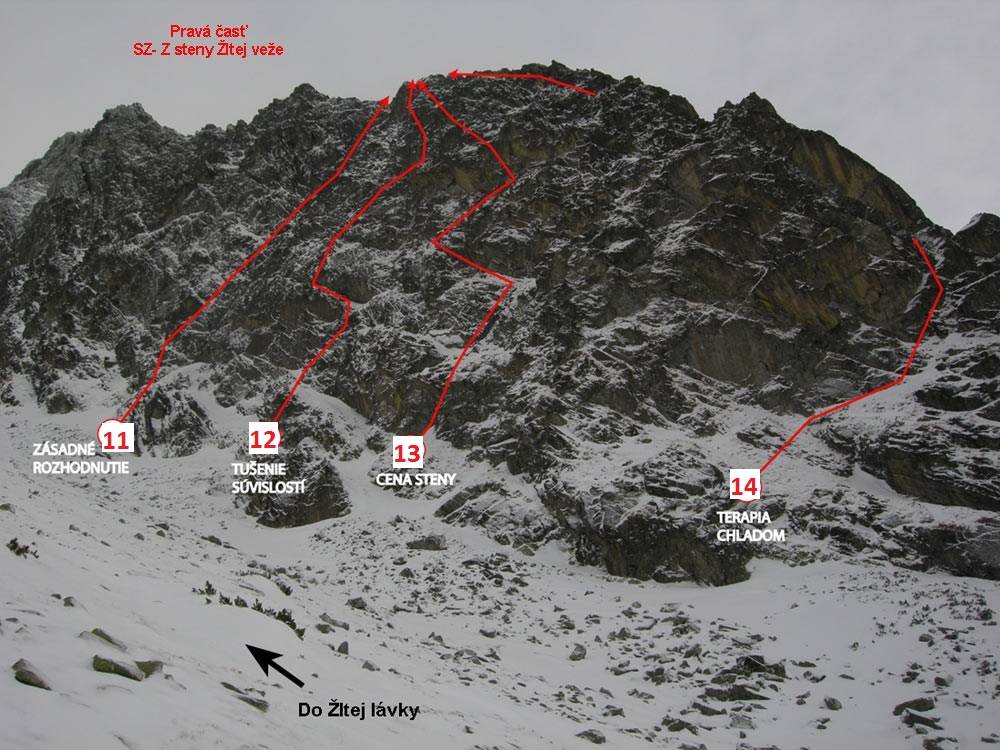 1. Ľavý pilier (IV, miesto V) 3h. F. Kele ml., J. Lukáč, 3. 7.1953 Zima: Kramný, Mrňák, 26. 4. 1962 Nástup z rokliny priamo pod Žltou lávkou - pilierom. Po ľavej strane piliera sú zrázy Žltej bašty. Stále po hrane piliera až pod štítový blok, potom trochu vpravo na trávnato-skalnú terasu kde sa napojíme na Stanislavského cestu a ňou na vrchol.2. Prostriedkom steny ( IV-V) 4h. A. Kenar, W. Stanislawski, A. Stanecki, 10,.VIII.1929 2. leto: Z. Korosadowicz, K. Zajac, 21.VII.1930 3. leto: F. Gádor, Wein, L. Zinner, okolo 27.VII.1930 Podľa APIII/57: Západná stena sa týči nad žľabom zbiehajúcim zo Žltej lávky. Približne v spádnici vrcholu sa strmia nad roklinou tri obrovské kolmé a hladké tabule z platní. Prvá, najspodnejšia, je sfarbená do bronzova, odštiepená od steny a hrozi zosunutím, druhá je zelená a tretia najvyššia znova bronzová. Tabule sú viditeľné už od Zbojnícke] chaty.'Výstup začíname medzi dvoma hornými tabuľami. Cez 5 metrovú ťažkú stienku na trsy trávy, odtiaľ na balvany, kúsok vpravo pod previs a cez previs III k dobrému balvanu na istenie. Ďalej doprava cez stienku na rímsu v platniach a rímsou doprava až na koniec. Od vstupu do skál 30 m. Odtiaľ cez nízku šikmou puklinou preťatú stienku. šikmo doľava IV na vrchnú hranu hornej bronzovej platne. Neďaleko jej hrany 15 metrov šikmo doľava na trávnatú plošinku, z nej priamo hore kúsok vľavo na konci kolmou trhlinou a potom po 20 metroch na ďalšiu plošinu s balvanom. (Kúsok vpravo je plochý stôl). Od jej pravého okraja trhlinou vytvorenou z balvanov, mierne doľava hore až k previsu v trhline a potom po jej ľavej tupej hrane IV na plochý stupeň a odtiaľ podobnou hranou na ďalší stupeň. Teraz dlhý krok doprava nad trhlinou na stupeň pri začiatku dalšej 15m trhliny. Ňou 8 metrov hore nakoniec cez previs V na sutinový stupeň priamo nad previsom. Odtiaľ trhlinou kúsok vlavo na trávnatý pás a po páse doľava pod malý komín s vklineným balvanom, (vľavo plošina). Komínom priamo hore, cez previs III na rozsiahlu terasu 40 metrov a po nej 20 metrov doprava až na jej koniec pod ohromnou kolmou platňou. Teraz vľavo od platne strmou stienkou hore a kúsok doprava na pravé rebro vľavo ležiaceho obrovského zárezu v platniach. Po rebre na konci po sutine a ďalej ráve na ďľšiu trávnatoskalnú terasu 40 metrov. Odtiaľ vedú priamo hore dva obrovské zárezy. Pravým - 25 metrov hore do blízkosti výklenku s plochým trávnatým dnom a vrúbeného previsnutými platňami. 5 m pod okrajom výklenku zo zárezu pokračujeme doprava, IV na rebierko vpravo a po ňom 15 metrov až do miesta kde sa stráca v previsnutých skalách. Traverz doľava nad výklenkom s pomocou odštiepeného balvanu, III na trávnato-skalnú terasu. Ňou 10 m. doľava a potom trhlinou hore. Sprvu doprava potom priamo na ďalšiu trávnatú lávku. Po lávke niekoľko metrov doľava a potom kratšou trhlinou a nakoniec cez balvany a stupne (40 m) na vrchol.3. Pravou polovicou steny (IV-V) 4h. J. Sláma, R. Smetana, 22. IV.1952 Leto: I. Gálfy, J.a L. Richvalský, 7 .VI.1953 Pravou polovicou steny. — Nástup ako v Stanislawského ceste až na trávnatú lávku, 30 metrov od nástupu . Ďalej šikmo doprava pod obrovskou odštiepenou platňou. Previsnutou stenou na ľavú hranu platne a po nej hore. Z pravého konca platne šikmo hore doľava asi dve dĺžky lana, miestami previsnutými lávkami a stienkami. Potom priamo hore do trávnatého vhĺbenia pod vrcholom. Vhĺbením na rebro v jeho ľavej stene, ním hore a z neho doľava do žliabku, ktorý ústi 30 metrov pod vrcholom v juhozápadnom rebre. Po rebre na vrchol. 4. Ferko - Jamnický (V, A2) 12 h. D. Ferko, F. Jamnický, 2.VI.19795. Pravou polovicou na JZ hrebeň ( V+) 3h. V. Tatarka, S. Lacko, 2.VI.1973 2. leto: V. Slivka, M. Milo, 14.VIII.19736. Vydržať (V+, A3) 8h. Z.Drlík, P.Mačák, 30.VIII.1976 2. leto: Králiček, V.Zboja, 18.VII.1980 3. leto: J.a Š. Bednár, 6.VIII.1980 – 7 hod.7. Novoročná romanca (V-, A1) 12 h. Z.Drlík, M.Pelc, 5-6.I.1974 2. zima: M.Dorociak, L.Kořínek, 5 hod. 1. leto: J.a Š. Bednár, VIII.1977 2. leto: J.Frniak, V.Zboja, 15.VII.1978 – 5 hod. 3. leto: M. a L.Kořínkovi, V.Šimánek, 2.VI.1979 – 4,1/2 hod.8. Drlík - Páleníček (IV+) Z.Drlík, L.Páleníček, dátum? Bez podrobností 9. Janiga - Tatarka (IV+) L. Janiga, V. Tatarka, 22.XII. 1978 1. leto: V. Zboja, Antoška, 15.VII.1980 Nástup z pod kotla (IV) a 3 dl. na lávku10.Komín ( V-) V.Tatarka, M.Pršo, leto 199111.Zásadné rozhodnutie (M5+, AF) 5h. J. Svrček, M. Styk, O. Styk, 27.12.201012.Tušenie súvislostí (M5) 5h. J. Svrček, M. Styk, 8.1.2011 Pozri aj foto pri ceste 11. 13.Cena steny (M6,A0) 9h. J. Svrček, V. Barčík, 16.01.2011 Pozri aj foto pri ceste 11.14.Terapia chladom (M5) 4h. J. Svrček, J. Mierka, 04.01.2011 Pozri foto pri ceste 11.15. JZ Pilierom (dole III, hore I) 1,5 h Gy. Komarnicki, R. Komarnicki, 29.VI.1912 Zima: J. Andráši, P. Frak, K. Pavlík, I. Urbanovič, 28.III.1956 podľa AP III/60 : K päte skalnatého Komarnického rebra. Toto sa začína nápadným, doľava odvráteným žltým zrázom. Z trávy dolu po hrane platne šikmo doprava horea potom traverzom na druhej strane zlomu doprava k plytkému žľabu medzi dve rebrá piliera. Žľabom 25 m hore, potom znova travera cez platne doľava na hrebeň pri veľkom balvane. Ďalší výšvih, druhý,obídeme oblúkom doprava. Hrebeňom cez prvý zub do sedielka, zprava pri ústi trávnatého žľabu. Odtiaľto 10 metrov doprava a potom trávnatým zárezom šikmo doľava hore a znova na hrebeň. Nasleduje ľahký chrbát až k plochému tretiemu výšvihu. Tu vľavo po stienke hore, potom sa presunieme na pravú stranu po preklenutej platni a cez niekoľko stupňov z platní dosiahneme vrchol výšvihu, Ďalší úsek je dlhší, ale ľahký. Pod štvrtým vežovým výšvihom trávnatým žľabo