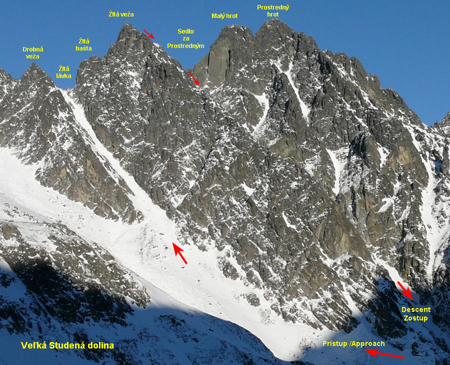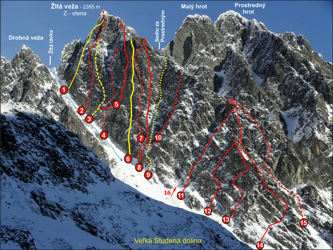 1. Ľavý pilier (IV, miesto V) 3h. F. Kele ml., J. Lukáč, 3. 7.1953 Zima: Kramný, Mrňák, 26. 4. 1962 Nástup z rokliny priamo pod Žltou lávkou - pilierom. Po ľavej strane piliera sú zrázy Žltej bašty. Stále po hrane piliera až pod štítový blok, potom trochu vpravo na trávnato-skalnú terasu kde sa napojíme na Stanislavského cestu a ňou na vrchol.2. Prostriedkom steny ( IV-V) 4h. A. Kenar, W. Stanislawski, A. Stanecki, 10,.VIII.1929 2. leto: Z. Korosadowicz, K. Zajac, 21.VII.1930 3. leto: F. Gádor, Wein, L. Zinner, okolo 27.VII.1930 Podľa APIII/57: Západná stena sa týči nad žľabom zbiehajúcim zo Žltej lávky. Približne v spádnici vrcholu sa strmia nad roklinou tri obrovské kolmé a hladké tabule z platní. Prvá, najspodnejšia, je sfarbená do bronzova, odštiepená od steny a hrozi zosunutím, druhá je zelená a tretia najvyššia znova bronzová. Tabule sú viditeľné už od Zbojnícke] chaty.'Výstup začíname medzi dvoma hornými tabuľami. Cez 5 metrovú ťažkú stienku na trsy trávy, odtiaľ na balvany, kúsok vpravo pod previs a cez previs III k dobrému balvanu na istenie. Ďalej doprava cez stienku na rímsu v platniach a rímsou doprava až na koniec. Od vstupu do skál 30 m. Odtiaľ cez nízku šikmou puklinou preťatú stienku. šikmo doľava IV na vrchnú hranu hornej bronzovej platne. Neďaleko jej hrany 15 metrov šikmo doľava na trávnatú plošinku, z nej priamo hore kúsok vľavo na konci kolmou trhlinou a potom po 20 metroch na ďalšiu plošinu s balvanom. (Kúsok vpravo je plochý stôl). Od jej pravého okraja trhlinou vytvorenou z balvanov, mierne doľava hore až k previsu v trhline a potom po jej ľavej tupej hrane IV na plochý stupeň a odtiaľ podobnou hranou na ďalší stupeň. Teraz dlhý krok doprava nad trhlinou na stupeň pri začiatku dalšej 15m trhliny. Ňou 8 metrov hore nakoniec cez previs V na sutinový stupeň priamo nad previsom. Odtiaľ trhlinou kúsok vlavo na trávnatý pás a po páse doľava pod malý komín s vklineným balvanom, (vľavo plošina). Komínom priamo hore, cez previs III na rozsiahlu terasu 40 metrov a po nej 20 metrov doprava až na jej koniec pod ohromnou kolmou platňou. Teraz vľavo od platne strmou stienkou hore a kúsok doprava na pravé rebro vľavo ležiaceho obrovského zárezu v platniach. Po rebre na konci po sutine a ďalej ráve na ďľšiu trávnatoskalnú terasu 40 metrov. Odtiaľ vedú priamo hore dva obrovské zárezy. Pravým - 25 metrov hore do blízkosti výklenku s plochým trávnatým dnom a vrúbeného previsnutými platňami. 5 m pod okrajom výklenku zo zárezu pokračujeme doprava, IV na rebierko vpravo a po ňom 15 metrov až do miesta kde sa stráca v previsnutých skalách. Traverz doľava nad výklenkom s pomocou odštiepeného balvanu, III na trávnato-skalnú terasu. Ňou 10 m. doľava a potom trhlinou hore. Sprvu doprava potom priamo na ďalšiu trávnatú lávku. Po lávke niekoľko metrov doľava a potom kratšou trhlinou a nakoniec cez balvany a stupne (40 m) na vrchol.3. Pravou polovicou steny (IV-V) 4h. J. Sláma, R. Smetana, 22. IV.1952 Leto: I. Gálfy, J.a L. Richvalský, 7 .VI.1953 Pravou polovicou steny. — Nástup ako v Stanislawského ceste až na trávnatú lávku, 30 metrov od nástupu . Ďalej šikmo doprava pod obrovskou odštiepenou platňou. Previsnutou stenou na ľavú hranu platne a po nej hore. Z pravého konca platne šikmo hore doľava asi dve dĺžky lana, miestami previsnutými lávkami a stienkami. Potom priamo hore do trávnatého vhĺbenia pod vrcholom. Vhĺbením na rebro v jeho ľavej stene, ním hore a z neho doľava do žliabku, ktorý ústi 30 metrov pod vrcholom v juhozápadnom rebre. Po rebre na vrchol. 4. Ferko - Jamnický (V, A2) 12 h. D. Ferko, F. Jamnický, 2.VI.19795. Pravou polovicou na JZ hrebeň ( V+) 3h. V. Tatarka, S. Lacko, 2.VI.1973 2. leto: V. Slivka, M. Milo, 14.VIII.19736. Vydržať (V+, A3) 8h. Z.Drlík, P.Mačák, 30.VIII.1976 2. leto: Králiček, V.Zboja, 18.VII.1980 3. leto: J.a Š. Bednár, 6.VIII.1980 – 7 hod.7. Novoročná romanca (V-, A1) 12 h. Z.Drlík, M.Pelc, 5-6.I.1974 2. zima: M.Dorociak, L.Kořínek, 5 hod. 1. leto: J.a Š. Bednár, VIII.1977 2. leto: J.Frniak, V.Zboja, 15.VII.1978 – 5 hod. 3. leto: M. a L.Kořínkovi, V.Šimánek, 2.VI.1979 – 4,1/2 hod.8. Drlík - Páleníček (IV+) Z.Drlík, L.Páleníček, dátum? Bez podrobností 9. Janiga - Tatarka (IV+) L. Janiga, V. Tatarka, 22.XII. 1978 1. leto: V. Zboja, Antoška, 15.VII.1980 Nástup z pod kotla (IV) a 3 dl. na lávku10.Komín ( V-) V.Tatarka, M.Pršo, leto 199111.Zásadné rozhodnutie (M5+, AF) 5h. J. Svrček, M. Styk, O. Styk, 27.12.201012.Tušenie súvislostí (M5) 5h. J. Svrček, M. Styk, 8.1.2011 Pozri aj foto pri ceste 11. 13.Cena steny (M6,A0) 9h. J. Svrček, V. Barčík, 16.01.2011 Pozri aj foto pri ceste 11.14.Terapia chladom (M5) 4h. J. Svrček, J. Mierka, 04.01.2011 Pozri foto pri ceste 11.15. JZ Pilierom (dole III, hore I) 1,5 h Gy. Komarnicki, R. Komarnicki, 29.VI.1912 Zima: J. Andráši, P. Frak, K. Pavlík, I. Urbanovič, 28.III.1956 podľa AP III/60 : K päte skalnatého Komarnického rebra. Toto sa začína nápadným, doľava odvráteným žltým zrázom. Z trávy dolu po hrane platne šikmo doprava horea potom traverzom na druhej strane zlomu doprava k plytkému žľabu medzi dve rebrá piliera. Žľabom 25 m hore, potom znova travera cez platne doľava na hrebeň pri veľkom balvane. Ďalší výšvih, druhý,obídeme oblúkom doprava. Hrebeňom cez prvý zub do sedielka, zprava pri ústi trávnatého žľabu. Odtiaľto 10 metrov doprava a potom trávnatým zárezom šikmo doľava hore a znova na hrebeň. Nasleduje ľahký chrbát až k plochému tretiemu výšvihu. Tu vľavo po stienke hore, potom sa presunieme na pravú stranu po preklenutej platni a cez niekoľko stupňov z platní dosiahneme vrchol výšvihu, Ďalší úsek je dlhší, ale ľahký. Pod štvrtým vežovým výšvihom trávnatým žľabo